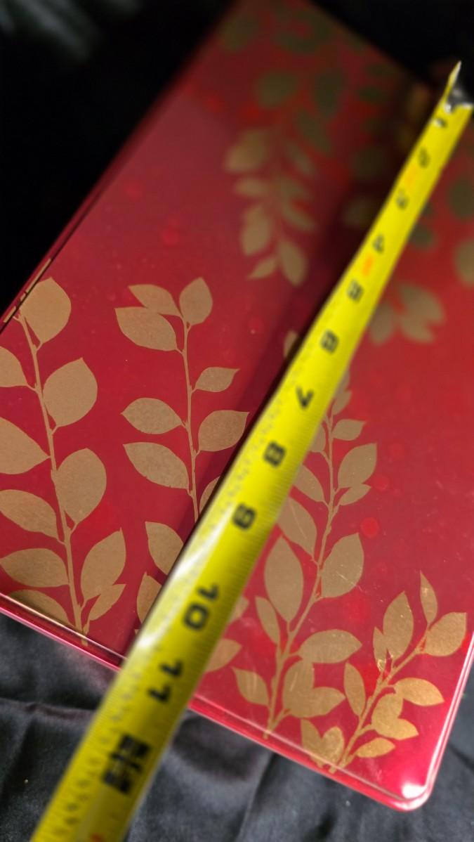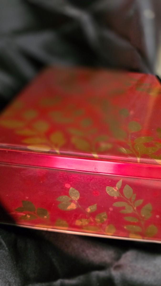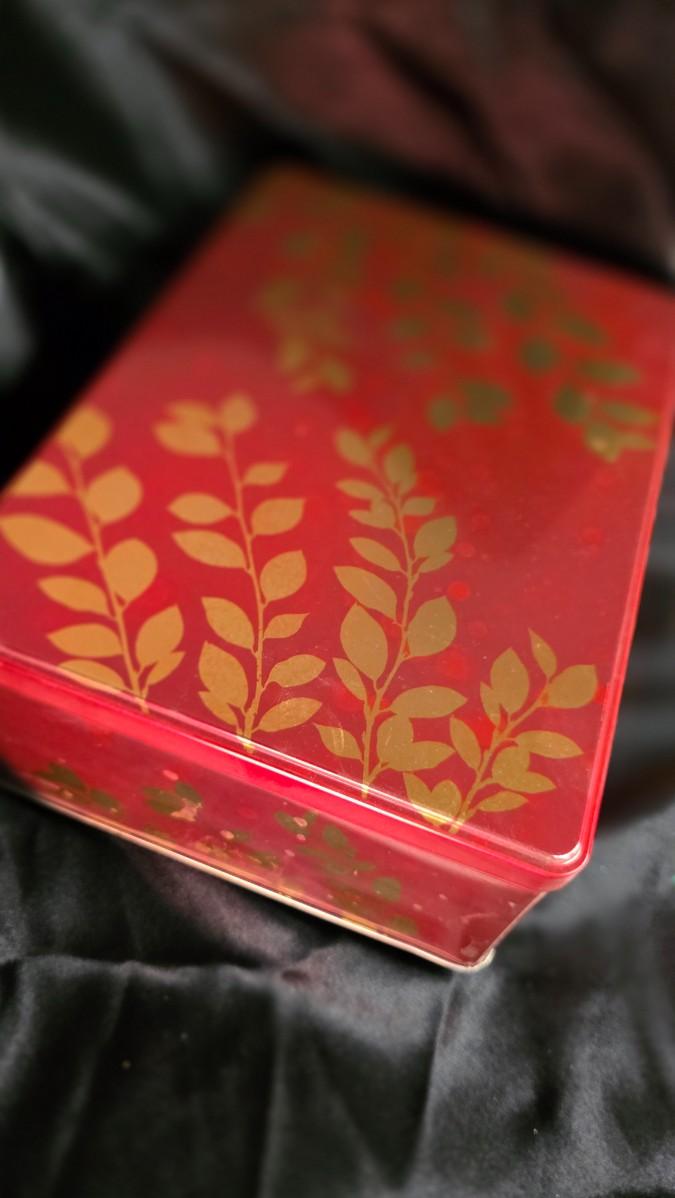 A charming and festive vintage holiday tin, wrapped in deep red tones and adorned with graceful gold botanical leaf motifs. This rectangular metal tin carries that classic mid-century seasonal elegance—simple, refined, and beautifully warm. The translucent red finish adds depth and glow, while the gold leaf patterning offers a sophisticated contrast that elevates the piece beyond standard holiday containers.