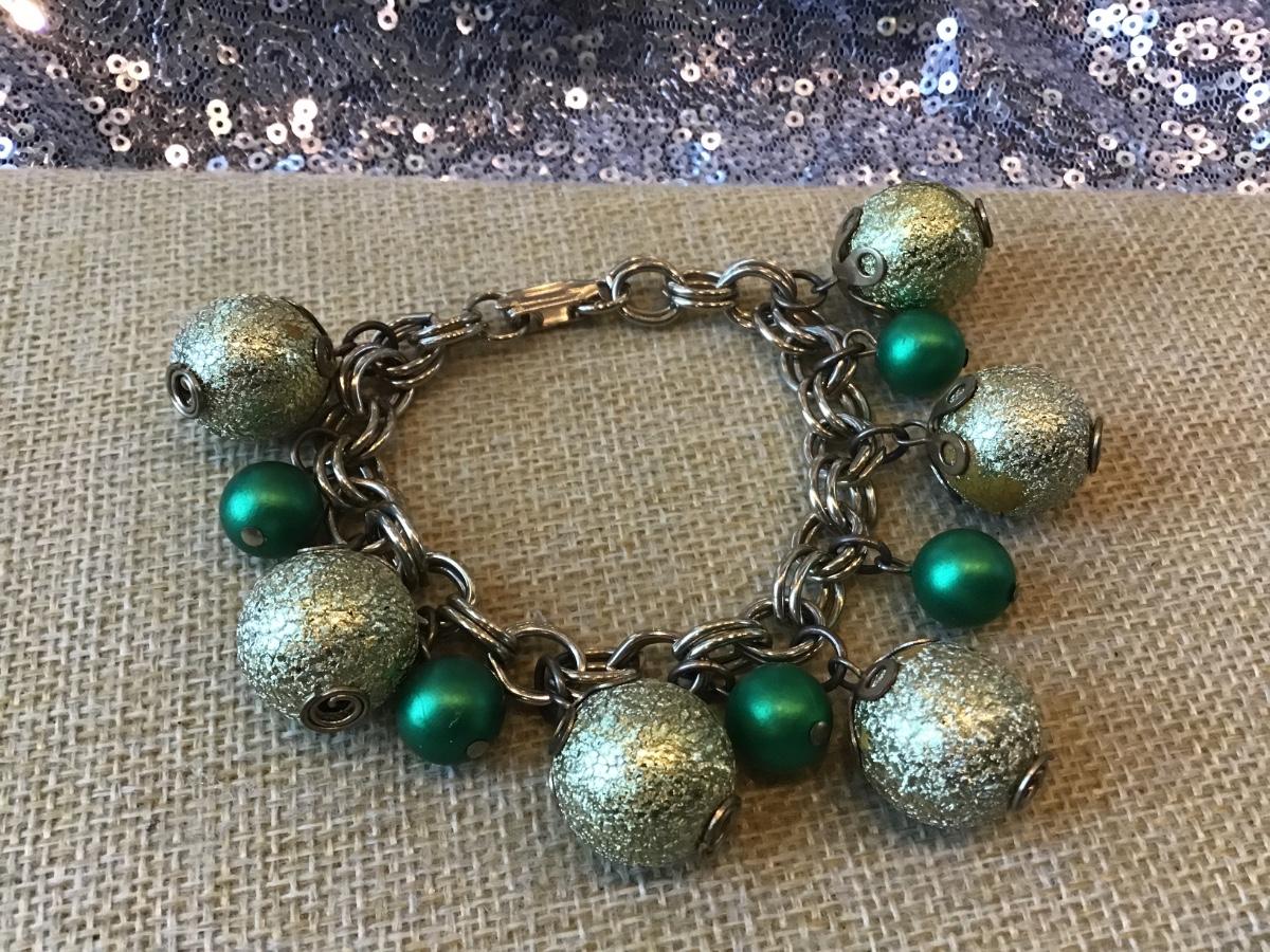 Vintage Holiday Silver Tone Sparkle and Green Bead Bracelet, Disco,