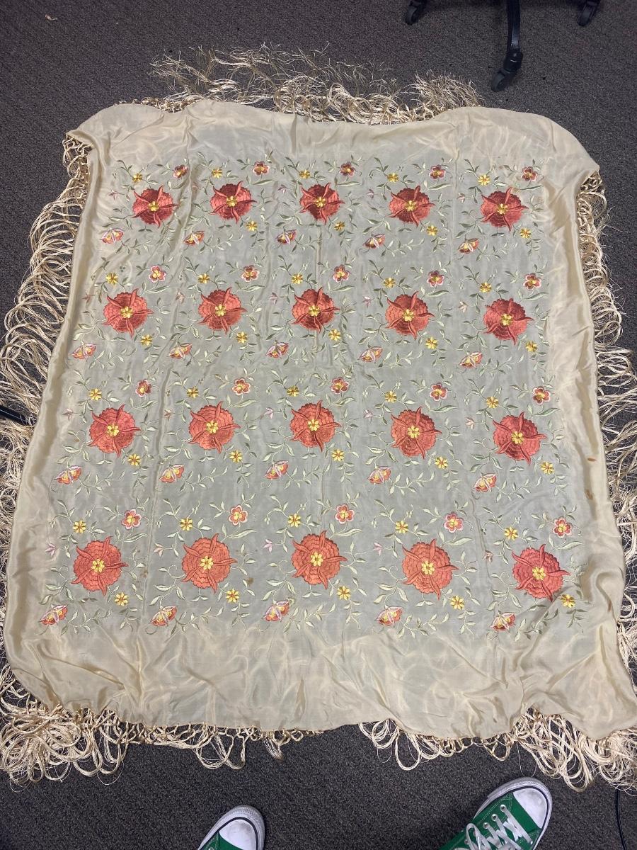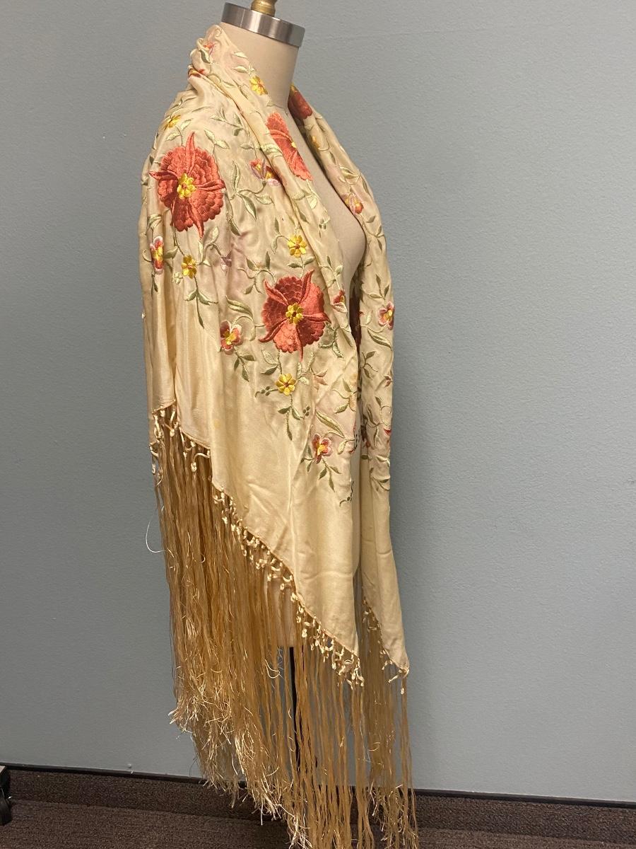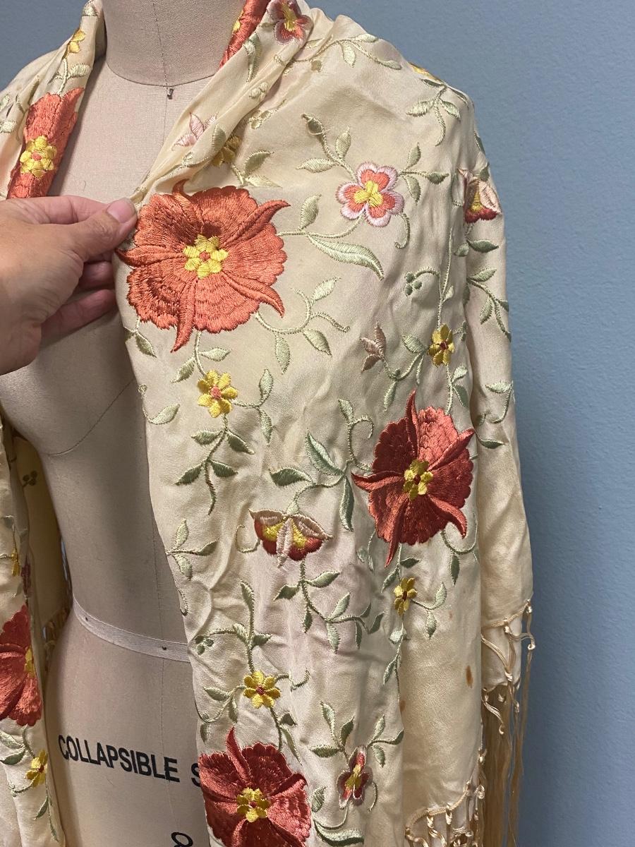 Vintage Hollywood Regency Embroidered Flower Design Tassel Satin Shawl Scarf