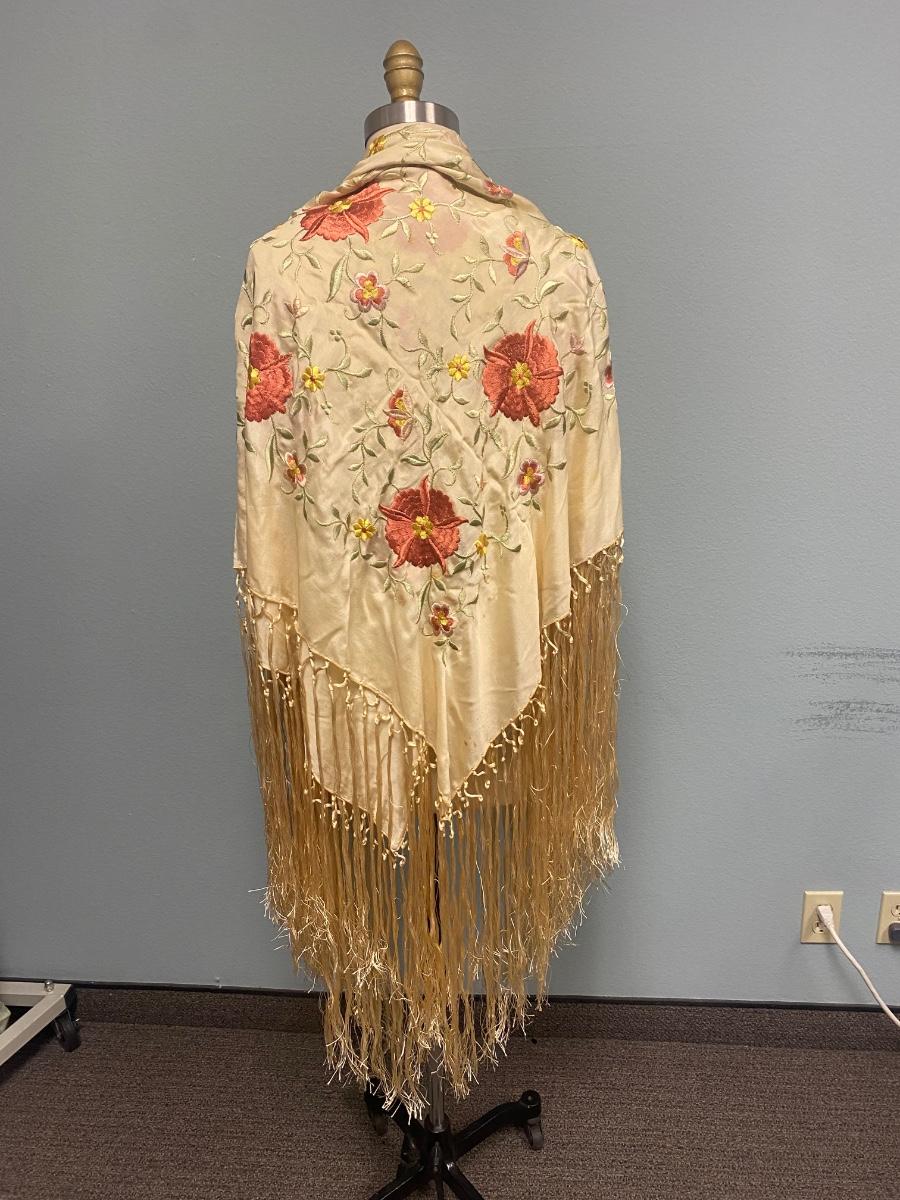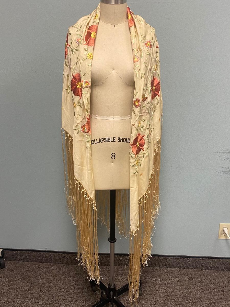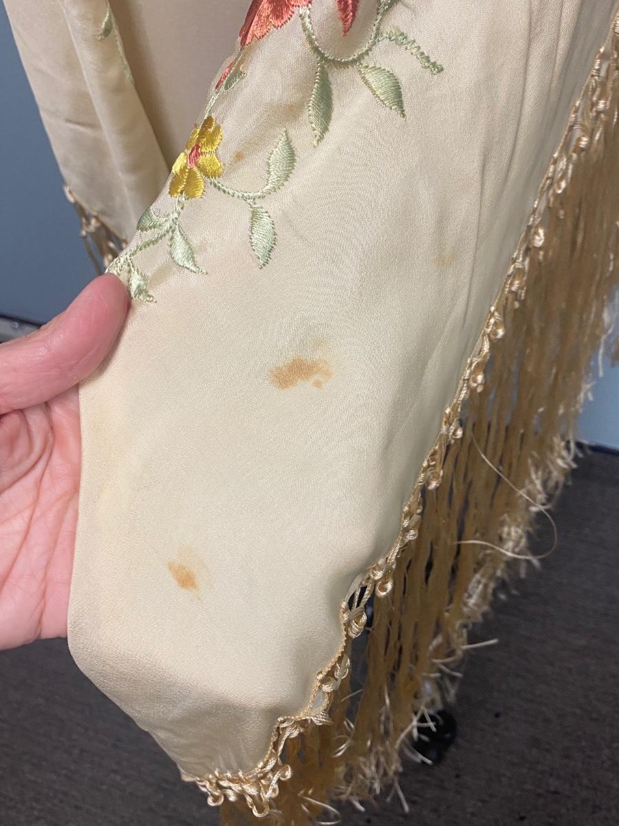 Vintage Hollywood Regency Embroidered Flower Design Tassel Satin Shawl Scarf