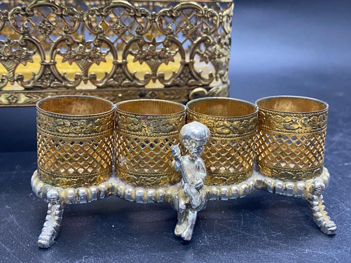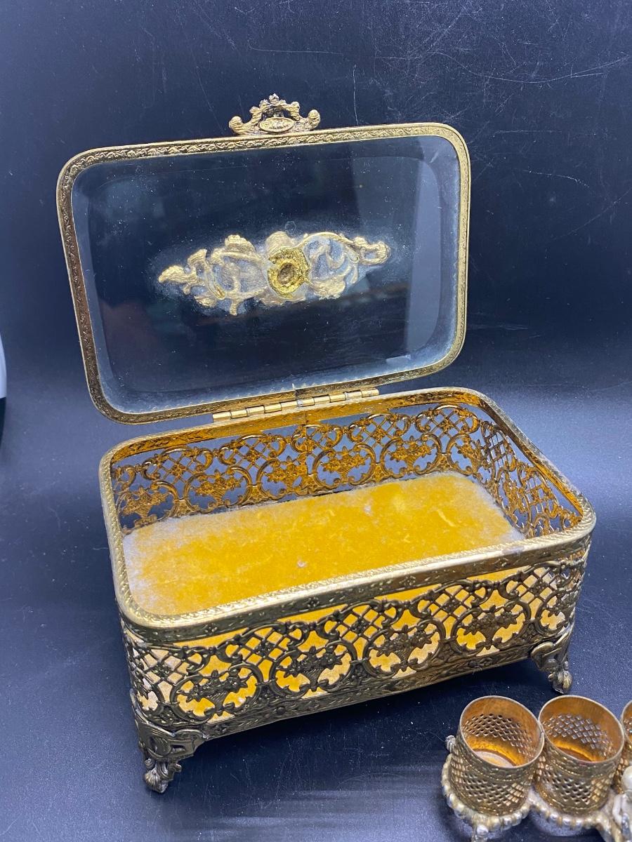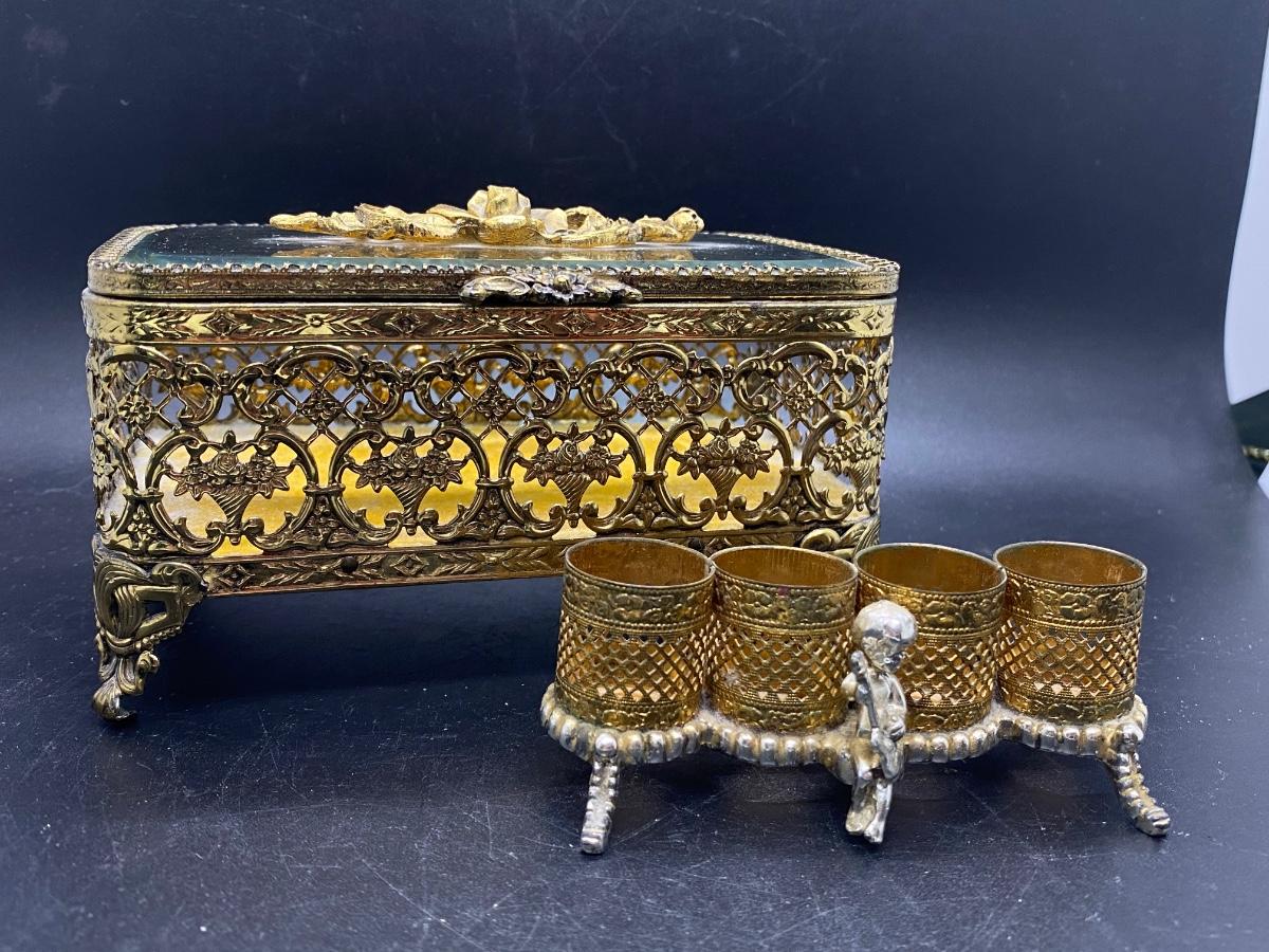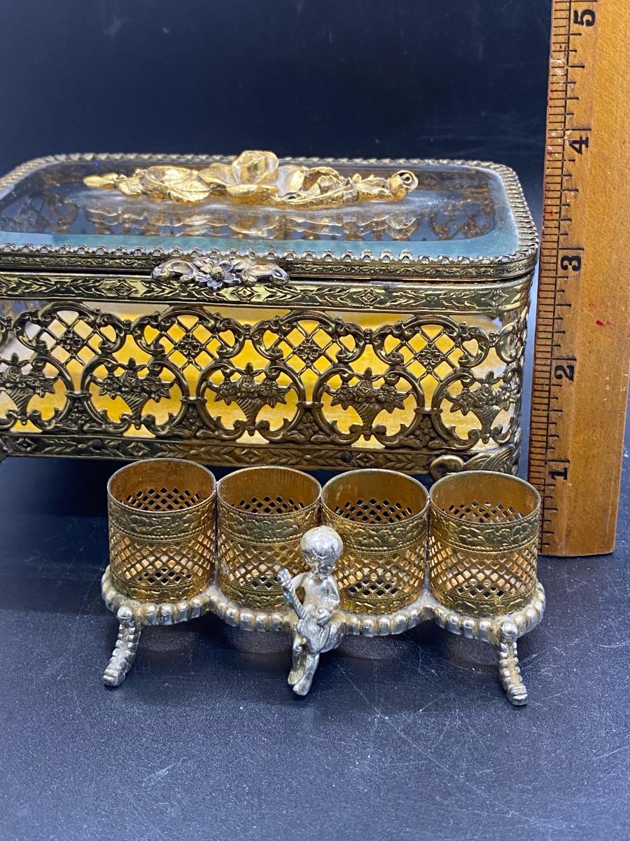 Vintage Hollywood Regency glam vanity decor. Gold ormolu jewelry box from Matson and a cherub adorn lipstick holder. Jewelry box has beveled glass lid with open filigree sides. Matson stamp is just under the lip of top. Gold velvet like bottom. Lipstick holder holds 4 tubes of lipstick, gold and silver metals. Both are in good vintage condition. Jewelry box is about 5.5" size.