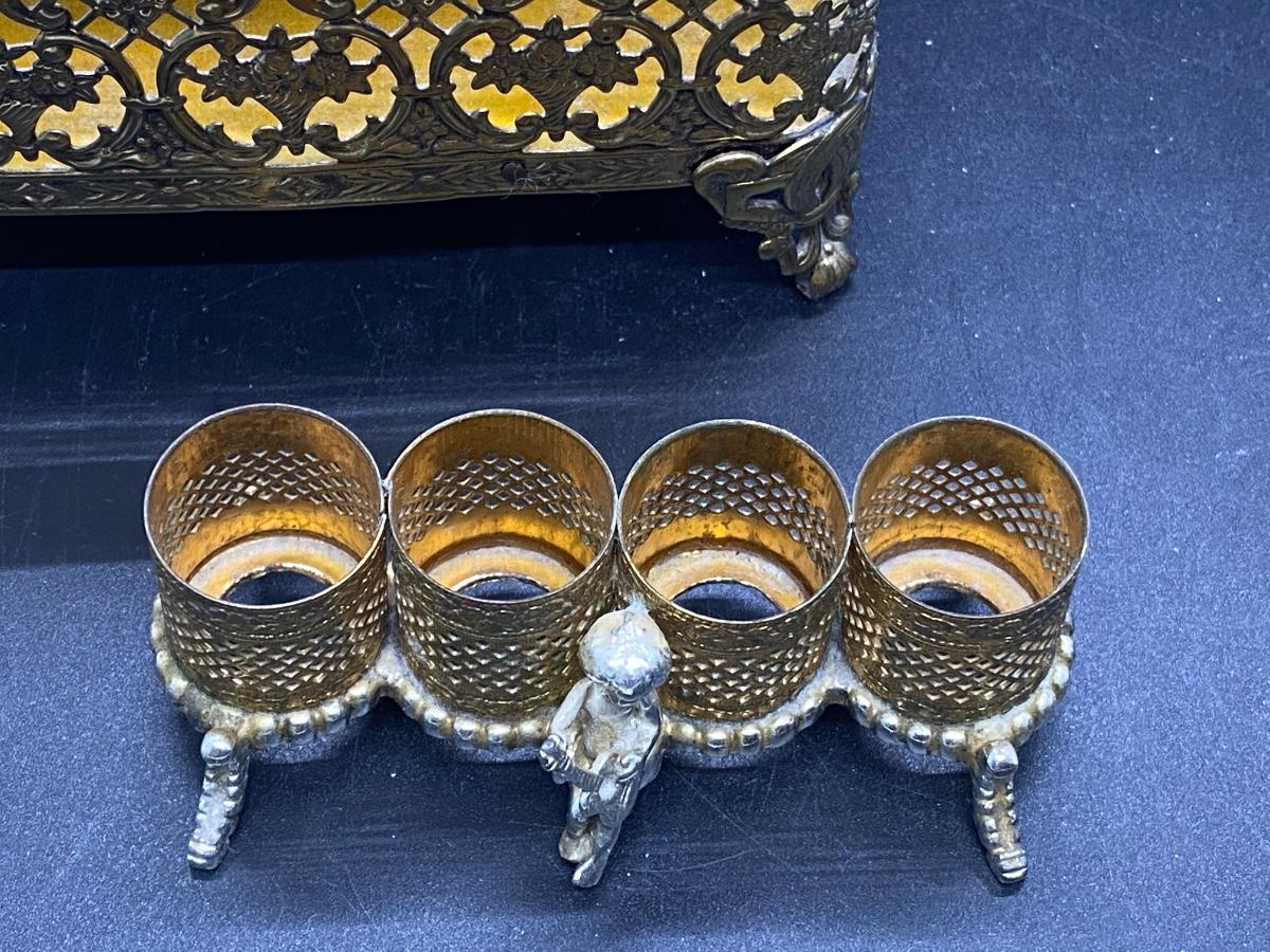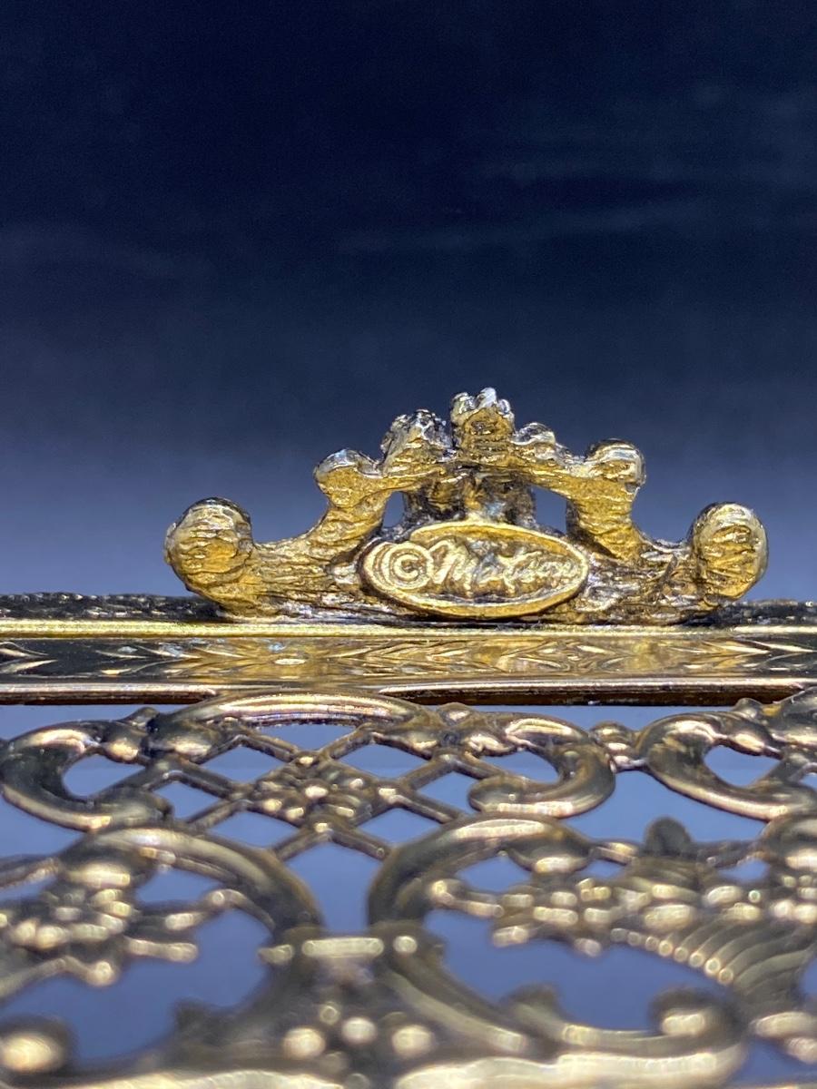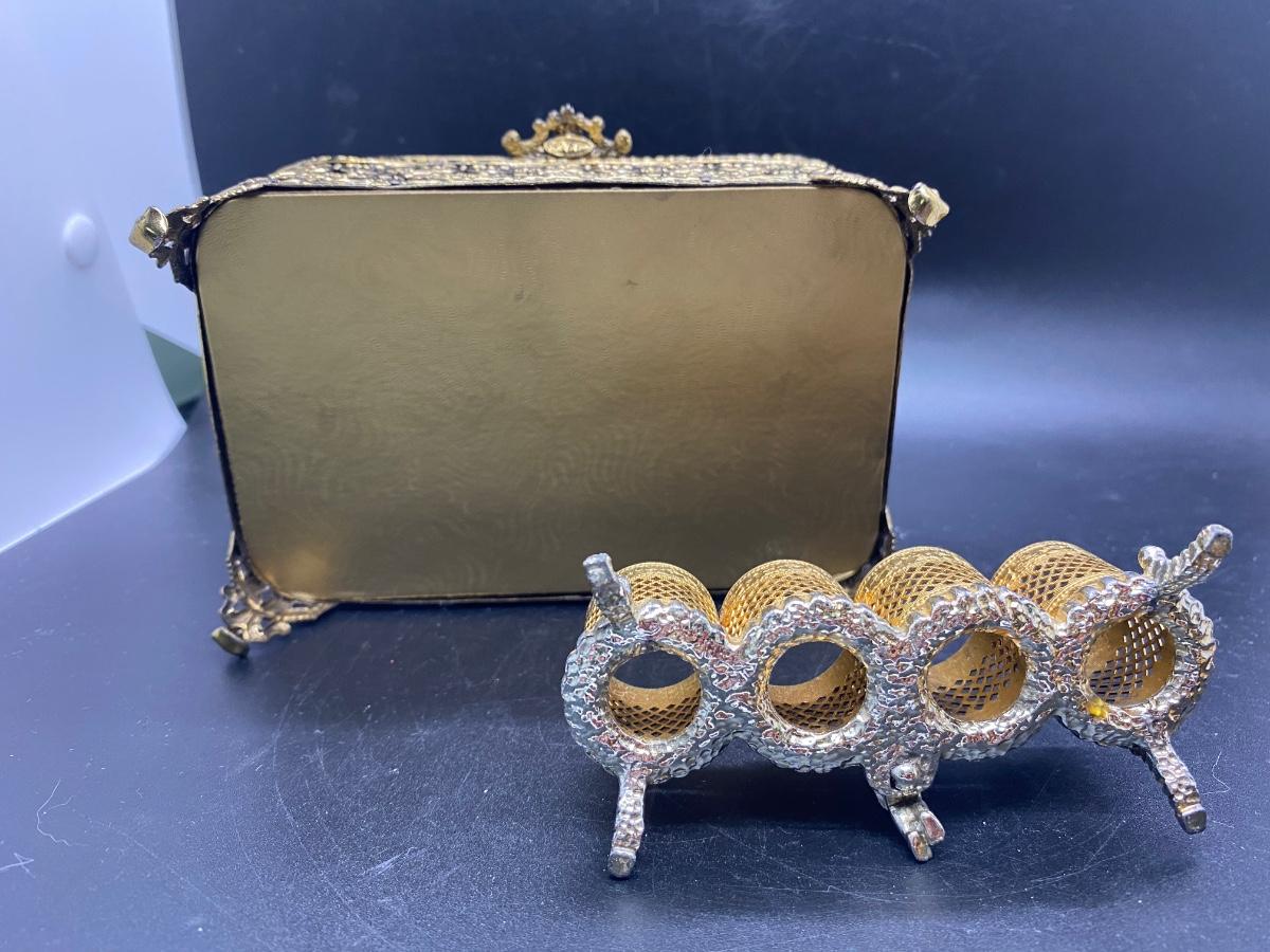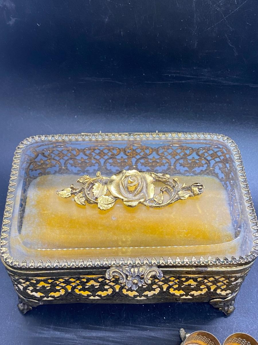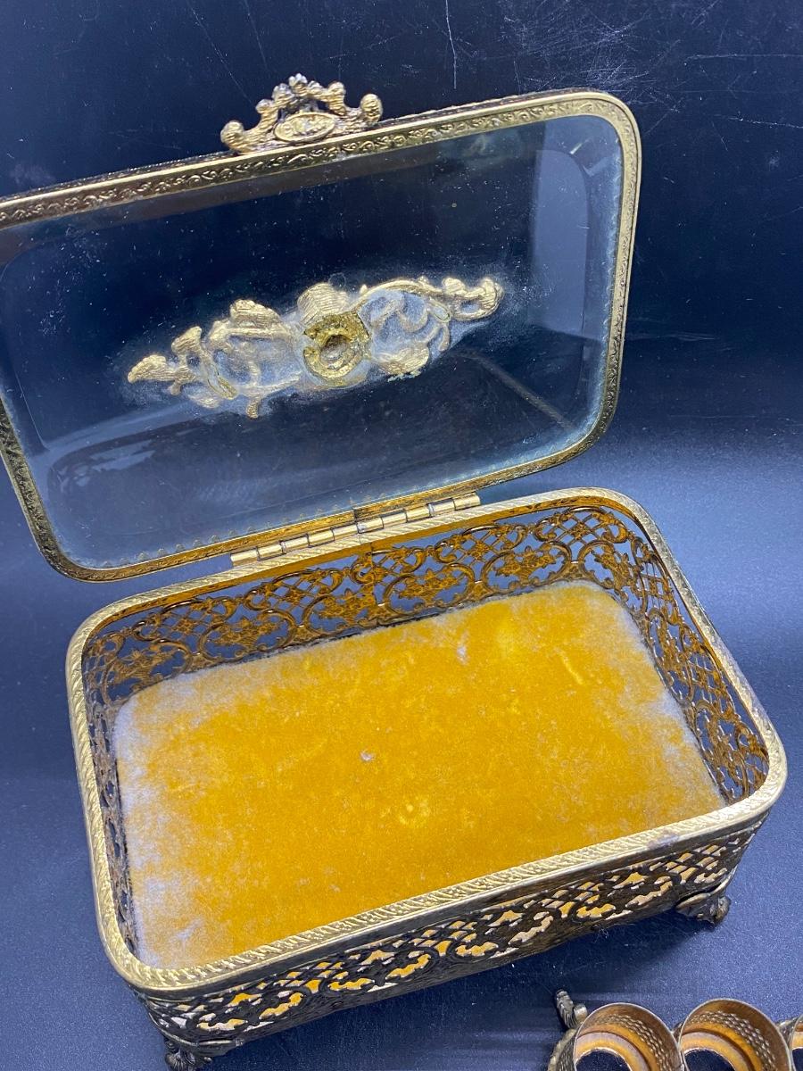 Vintage Hollywood Regency glam vanity decor. Gold ormolu jewelry box from Matson and a cherub adorn lipstick holder. Jewelry box has beveled glass lid with open filigree sides. Matson stamp is just under the lip of top. Gold velvet like bottom. Lipstick holder holds 4 tubes of lipstick, gold and silver metals. Both are in good vintage condition. Jewelry box is about 5.5" size.