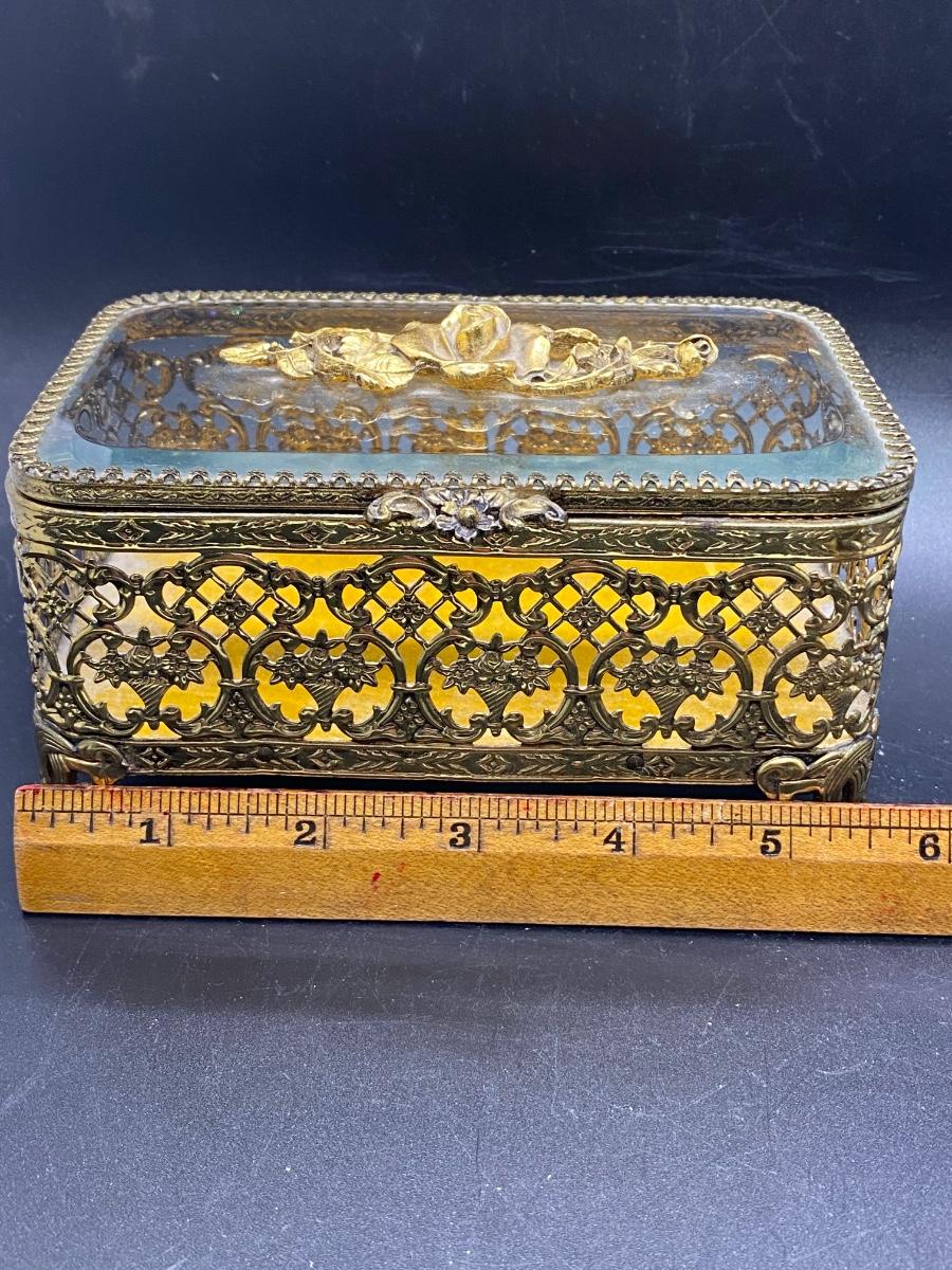 Vintage Hollywood Regency Matson Gold Ormolu Beveled Glass Jewelry Box with Lipstick Holder