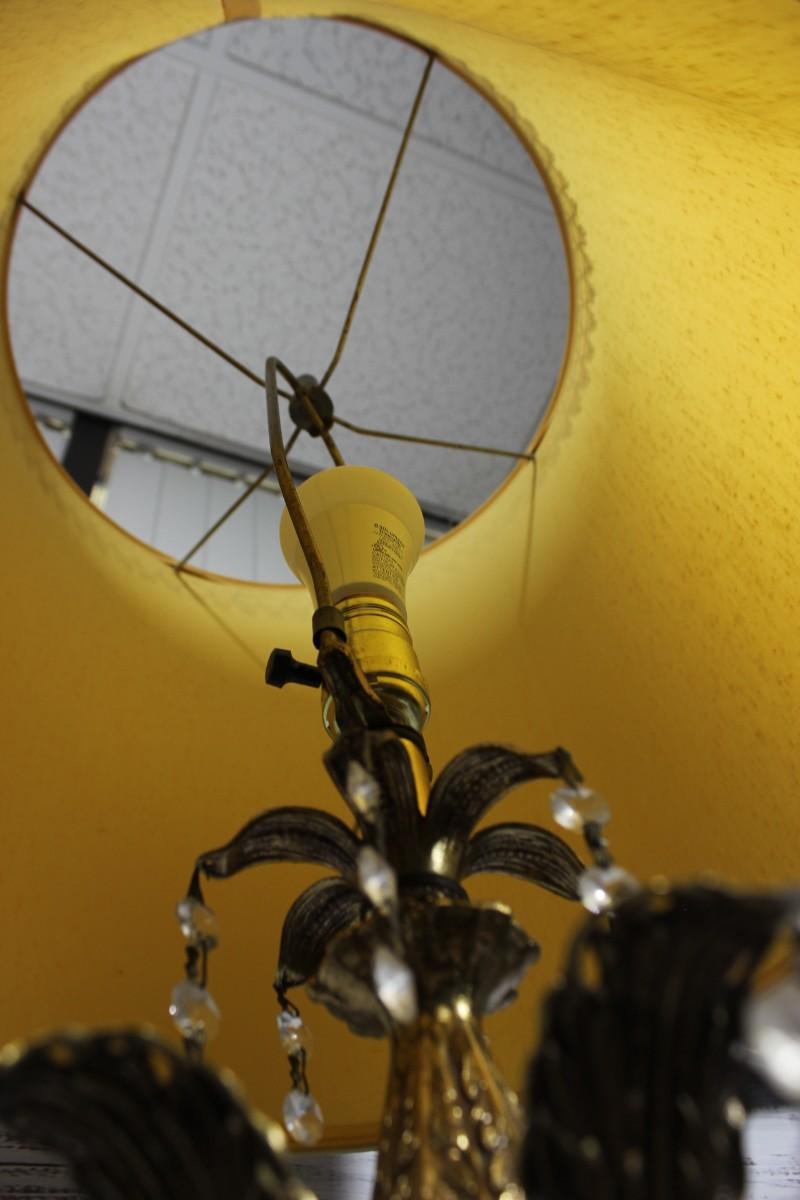 Vintage mid century Hollywood Regency glamour table lamp. Large crystal and brass lamp. Working. May have some missing crystal pieces. Shade in fair condition.