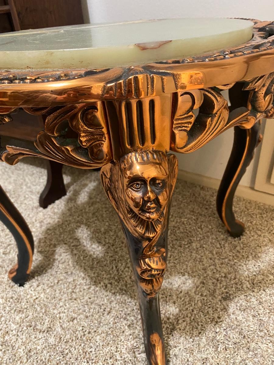 Vintage Hollywood Regency Heavy Cast Copper Metal & Marble Figural Cherub Side Table. Beautifully crafted copper table. Cherub faces on the legs. Extremely heavy. Round marble top has cracked and been taped. Table frame is in very good condition. About 21" diameter, marble is about 17" size. Table stands a little over 18" tall.