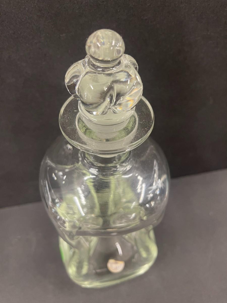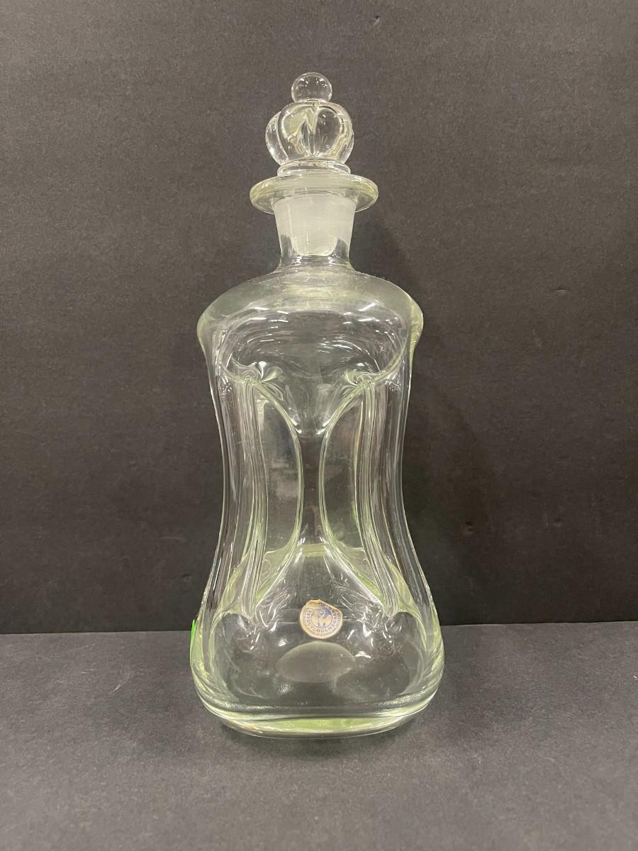 Vintage Holmegaard Danish Glass Pinch Bottle Decanter. Original label is present but peeling. 10 1/4" to top of stopper. Excellent condition.
