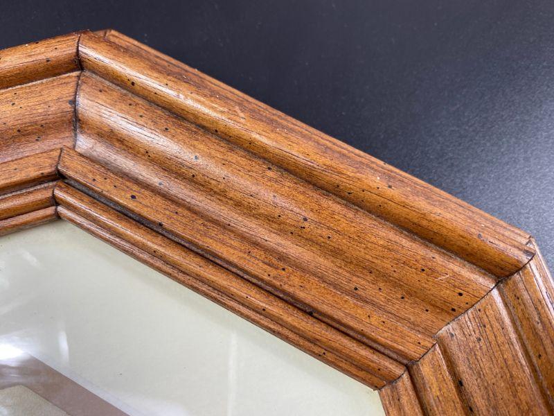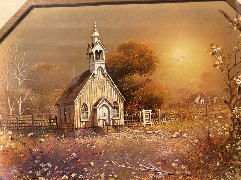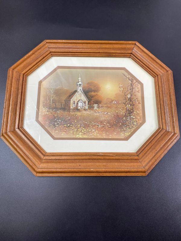 VINTAGE HOMCO WOOD FRAMED UNDER GLASS OCTAGONAL PRINT "COUNTRY CHURCH"