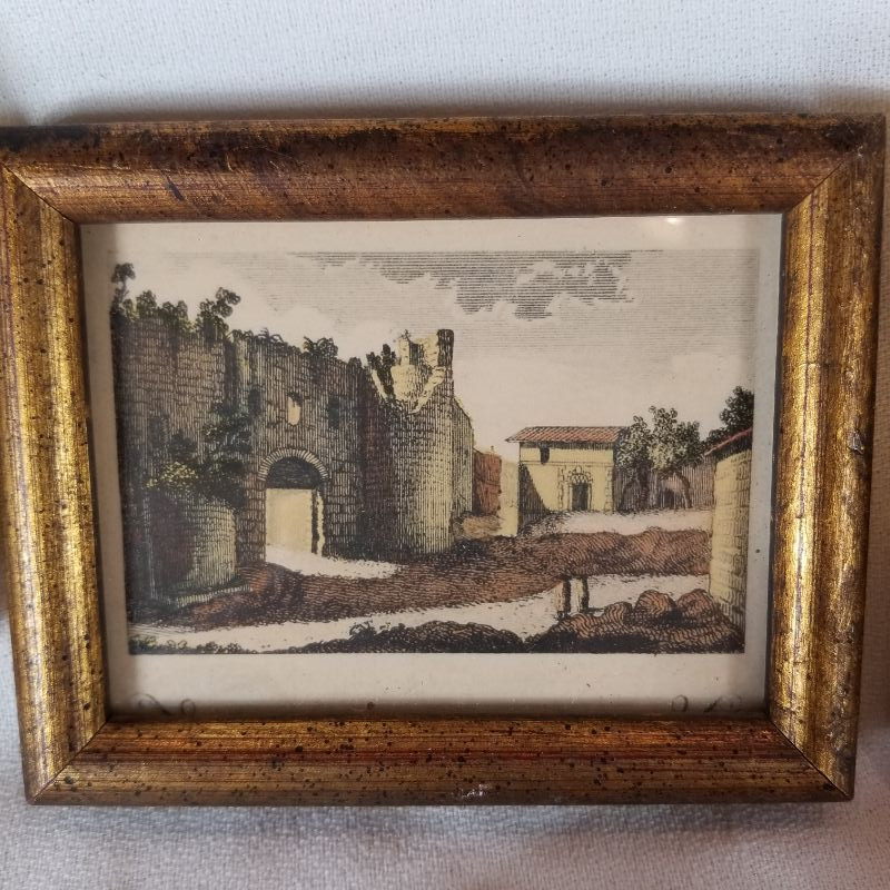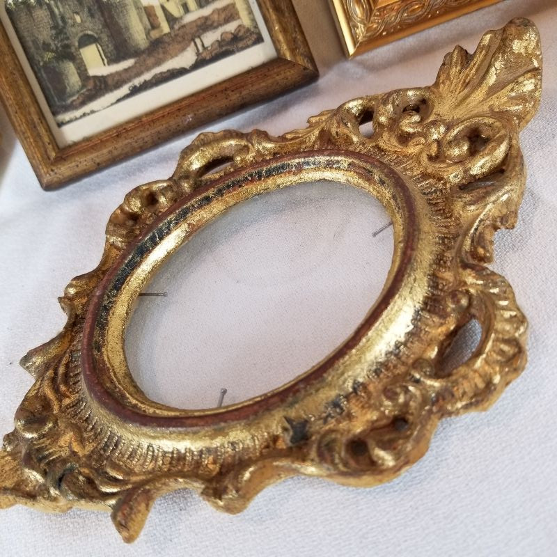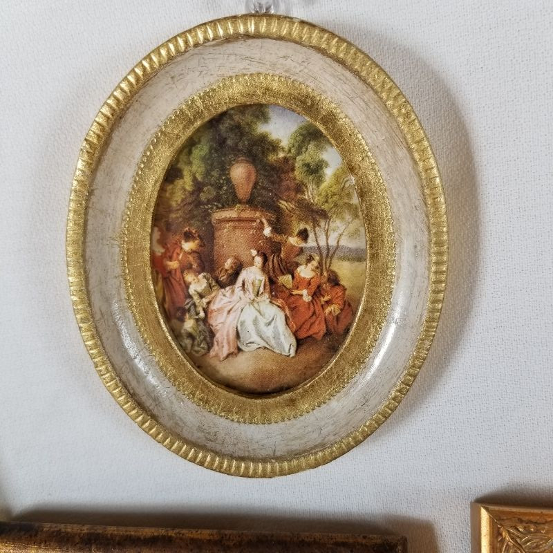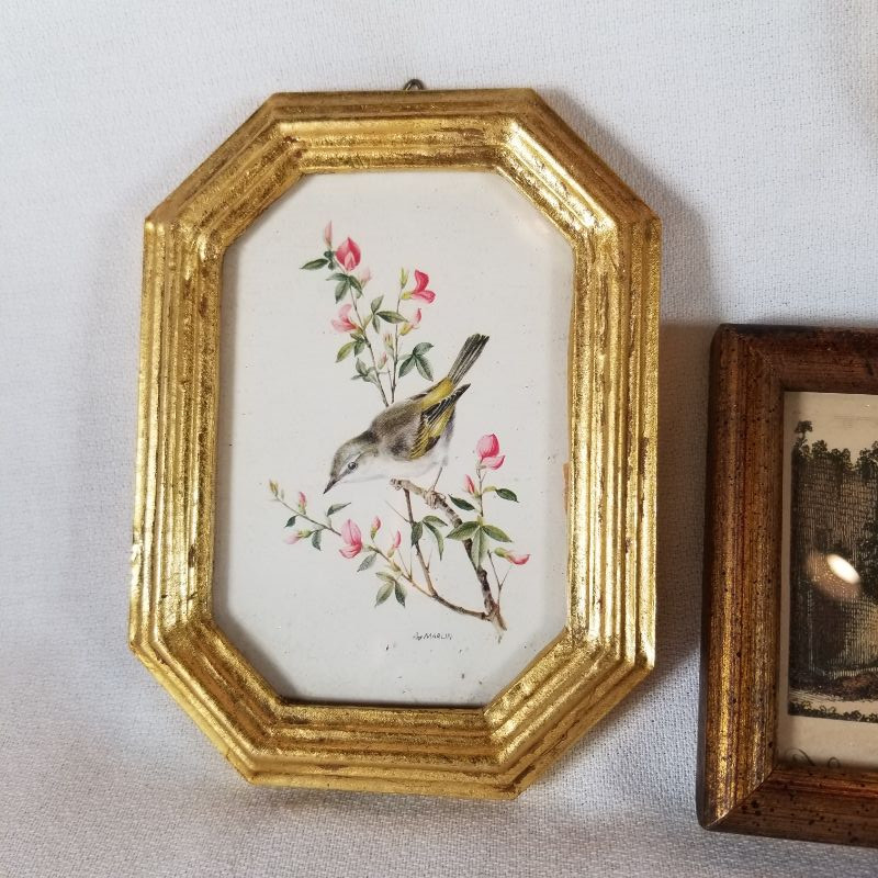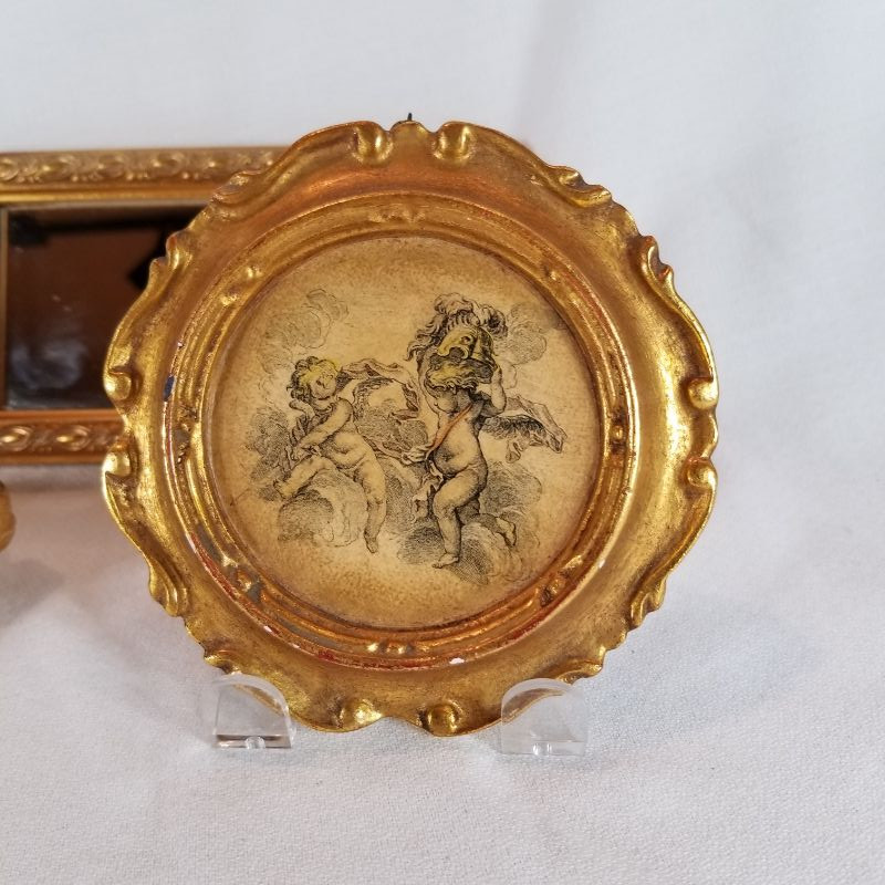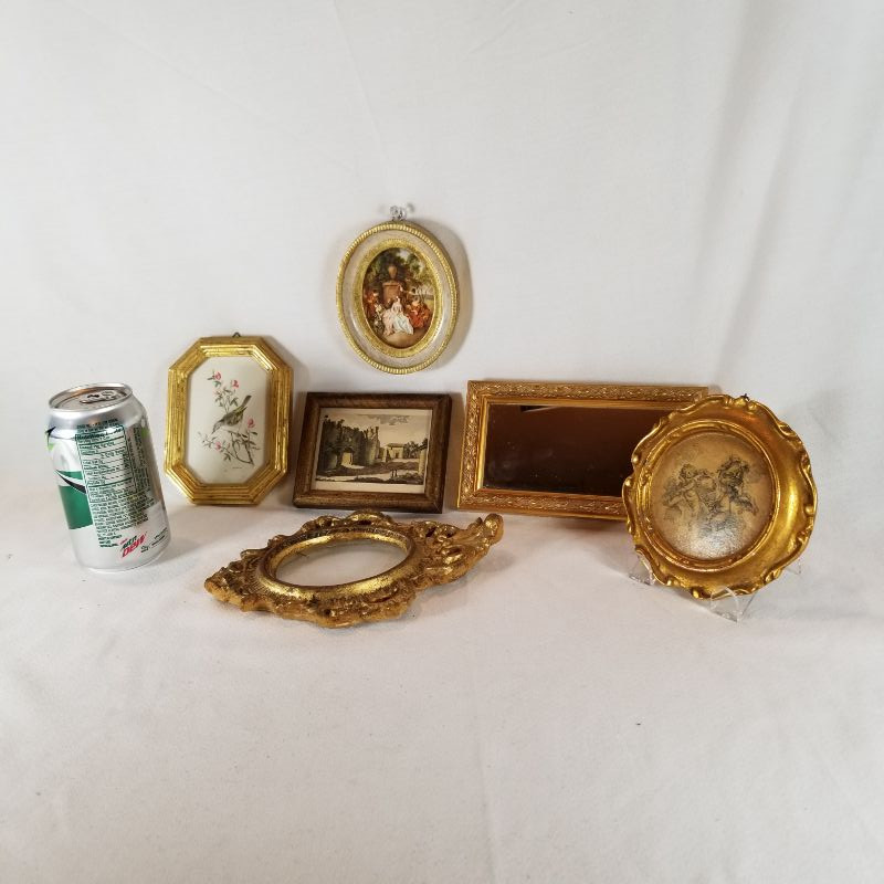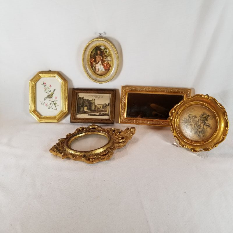 Vintage small home decor collection of 6 items. Italian frame with a Victorian Scene - frame has some gold loss on the bottom. Framed bird print, framed "Countryside in Italy" print, small rectangle framed mirror (looks black in picture but very clear in reality), a round scalloped-edged frame with cherubs, and lastly a very nice wood and gold leaf frame with glass. This is a very nice collection of small decor items. All are in very good condition and ready to hang with the exception of the Italian frame as noted above.