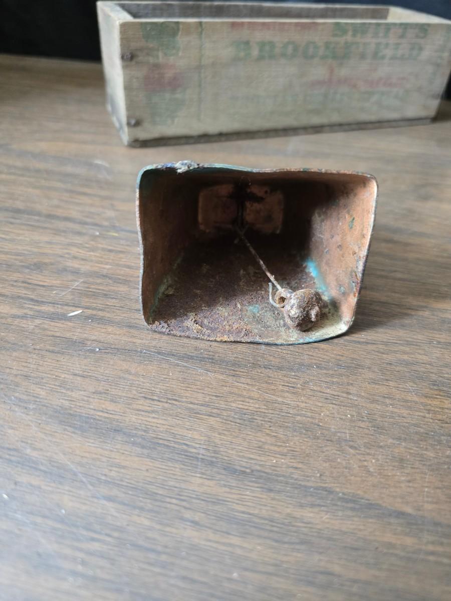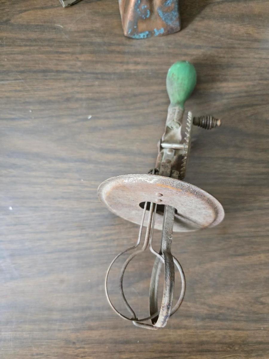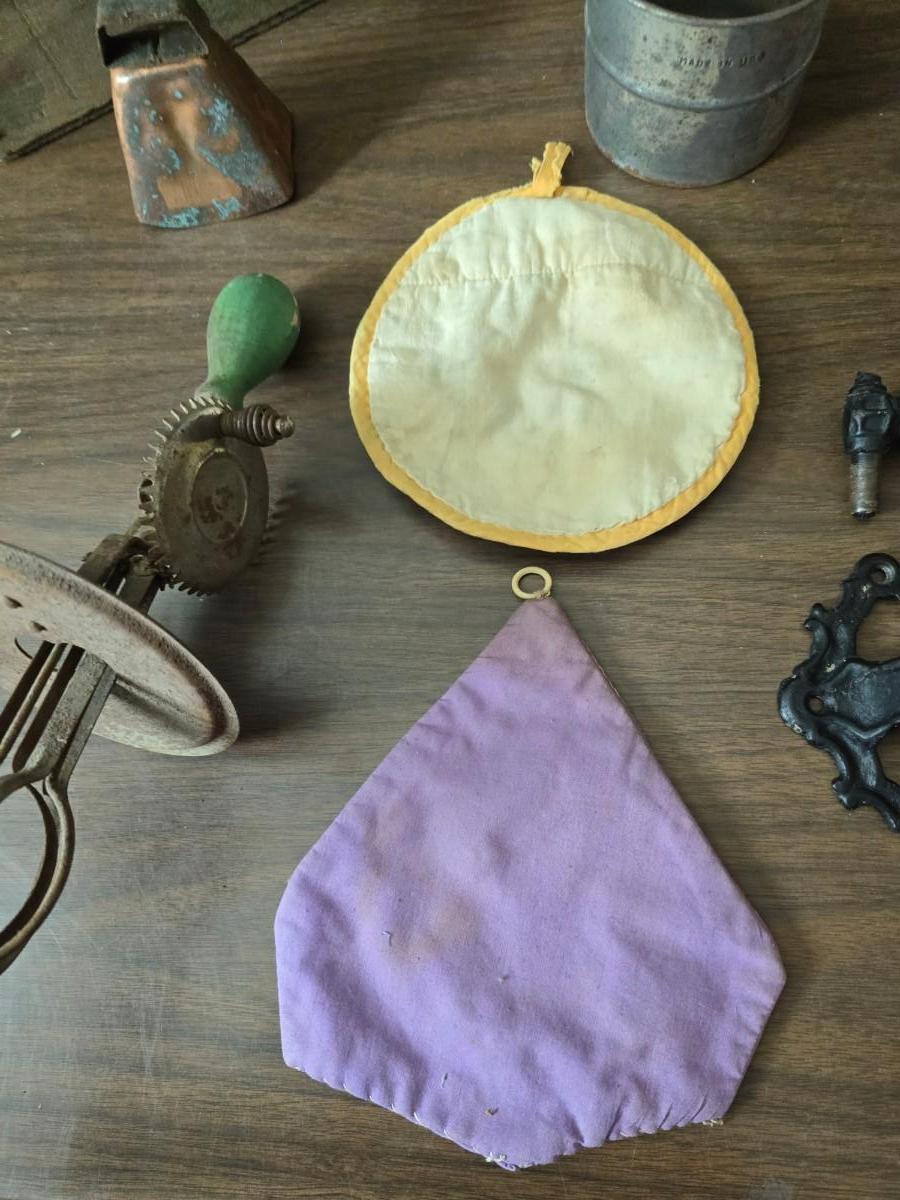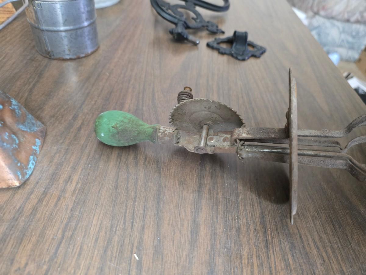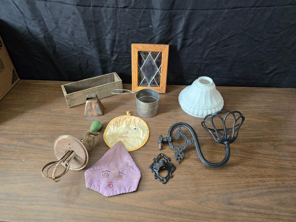 Vintage home decor - small stained glass - cast iron wall pocket with original hardware - old hand mixer - cheese box - copper bell and more