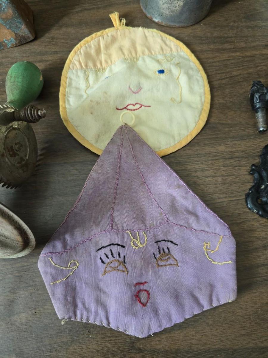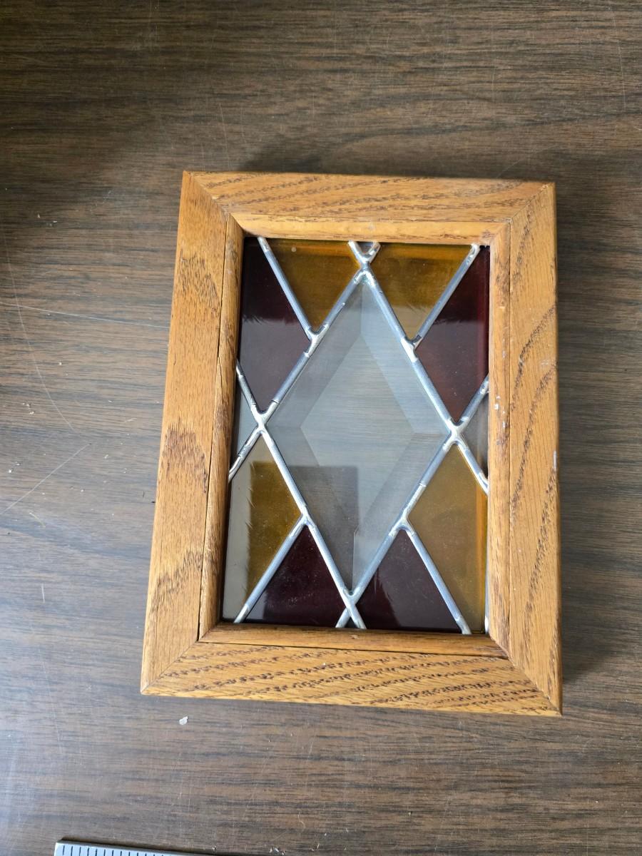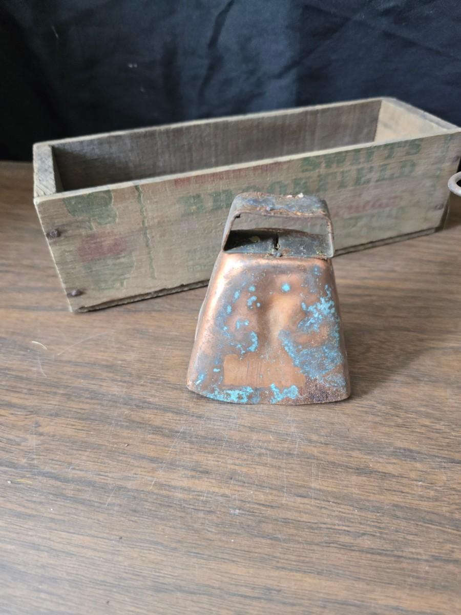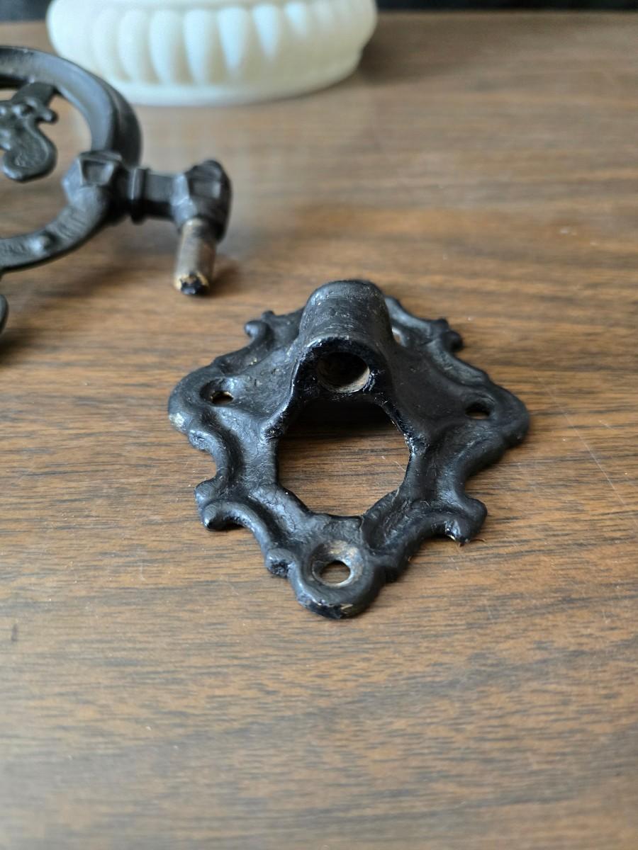 Vintage home decor - small stained glass - cast iron wall pocket with original hardware - old hand mixer - cheese box - copper bell and more