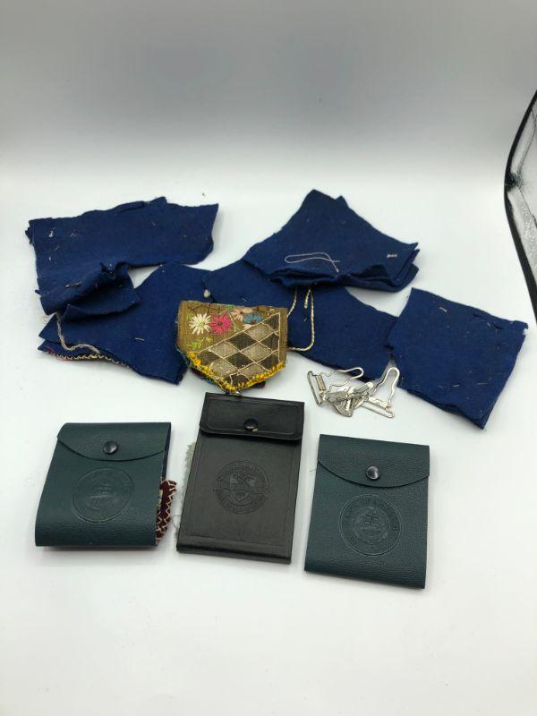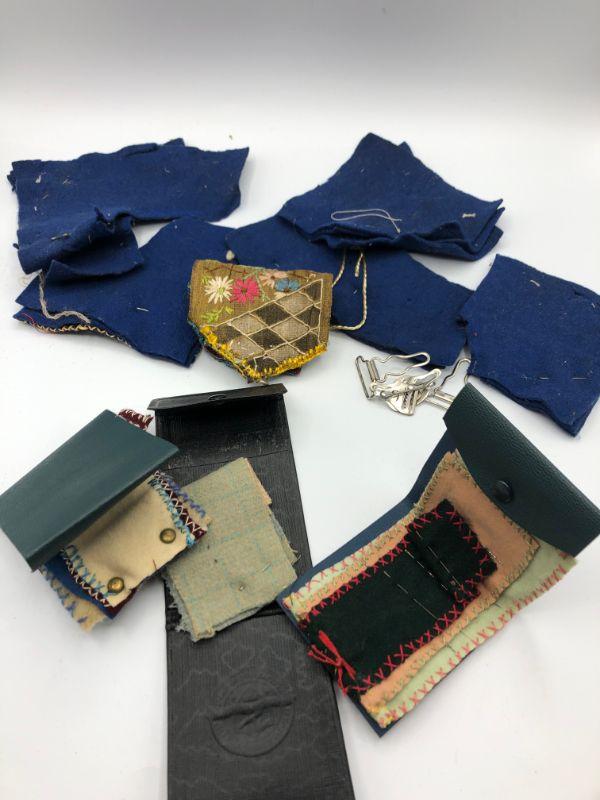 Vintage collection of sewing needle holders. Three are made with old bank books for covers. The navy blue felt pieces look like they were a project or scraps possibly. The checkered piece is a sewing needle holder as well.