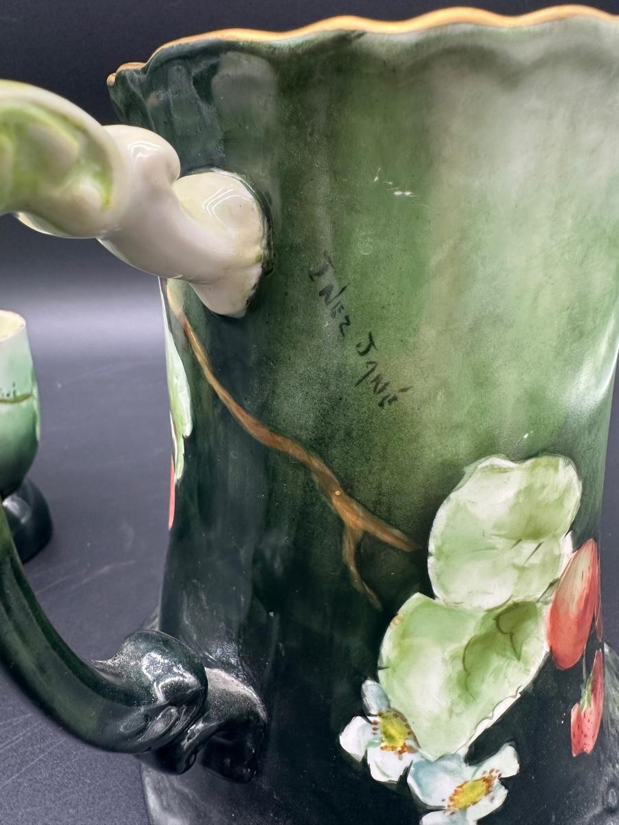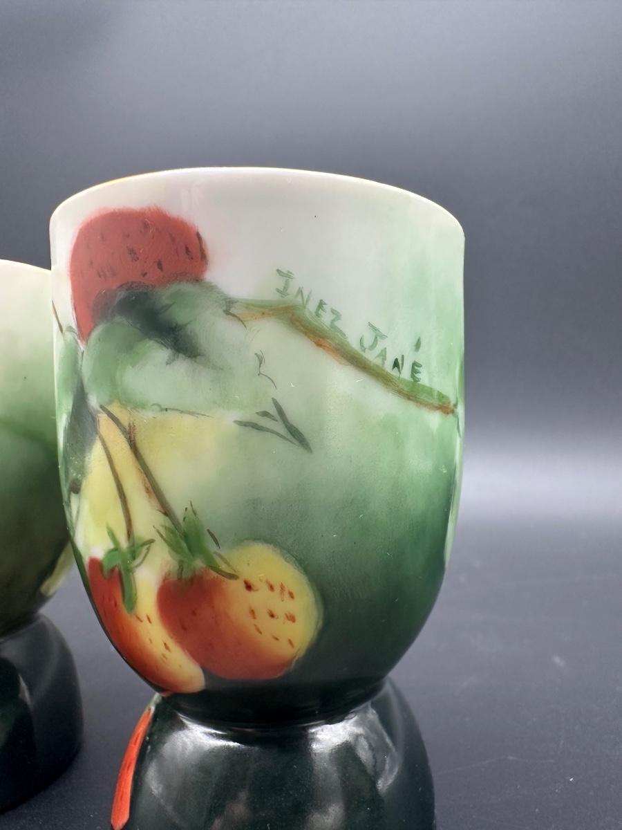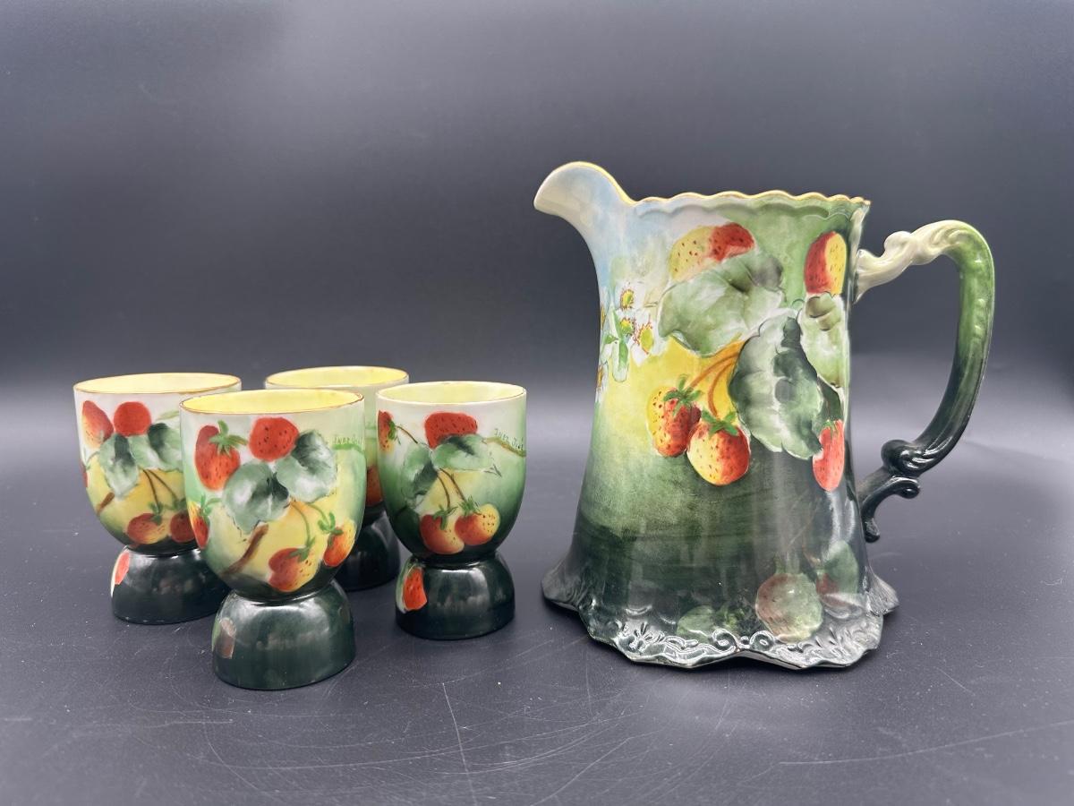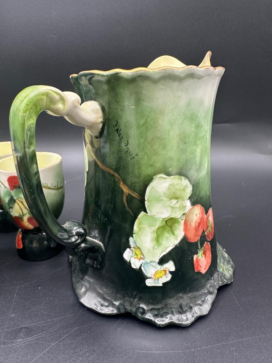 Hand-painted ceramic pitcher with four matching footed cups featuring strawberry and leaf design. Signed “Inez Jane.” Gold trim at rim. Decorative glaze with green fade base. See photos for condition.