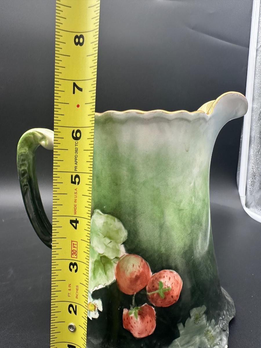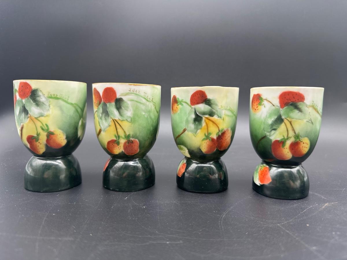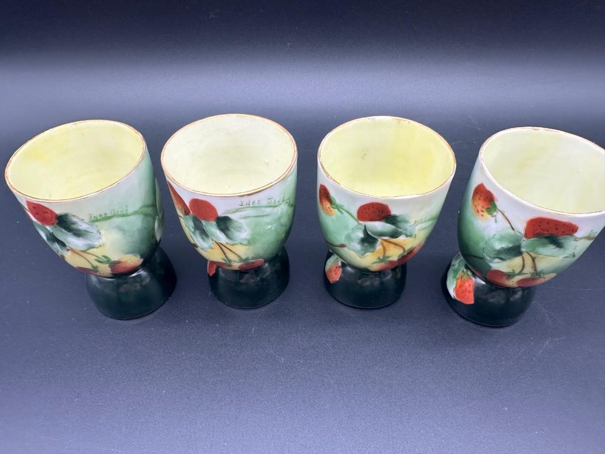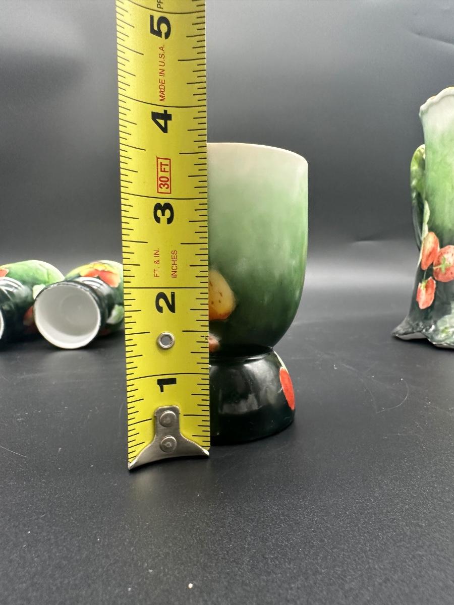 Hand-painted ceramic pitcher with four matching footed cups featuring strawberry and leaf design. Signed “Inez Jane.” Gold trim at rim. Decorative glaze with green fade base. See photos for condition.
