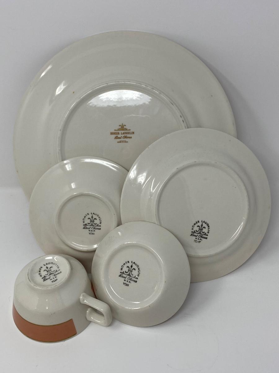 Vintage Homer Laughlin Pompano Apricot with True Gold Trim Dinnerware, Stamped. Setting for At Least Five Includes: 6 Cups, 5 Saucers, 6 Bread Plates, 4 Small Bowls, 3 Bowls, 1 Salad Plate, 5 Dinner Plates