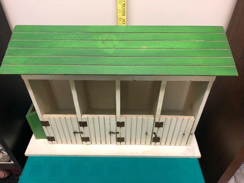 Rustic horse stable decor. Has four pens with doors that open. Not deep enough to put a horse figure in, but a childs imagination could have fun with it. Could be a start to a decor project also. Interesting pieces. Made of wood.