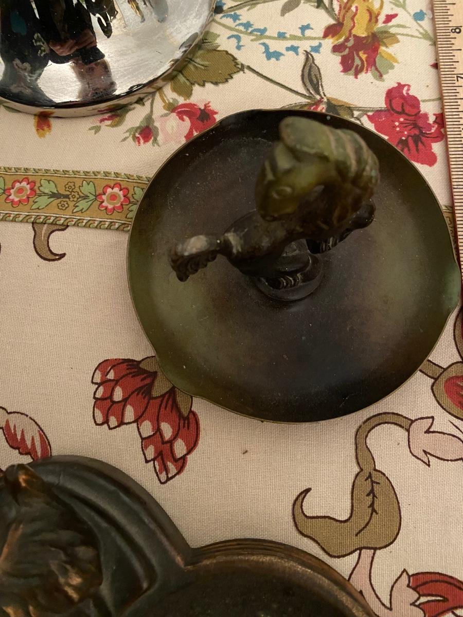 Vintage horse by Ystad brons metal horse figure center, ashtray trinket tray. Marked on bottom. 5" diameter, 4" high