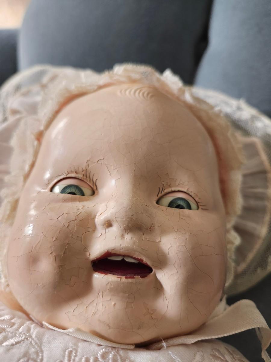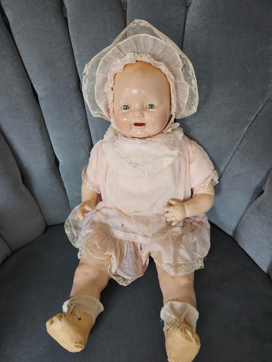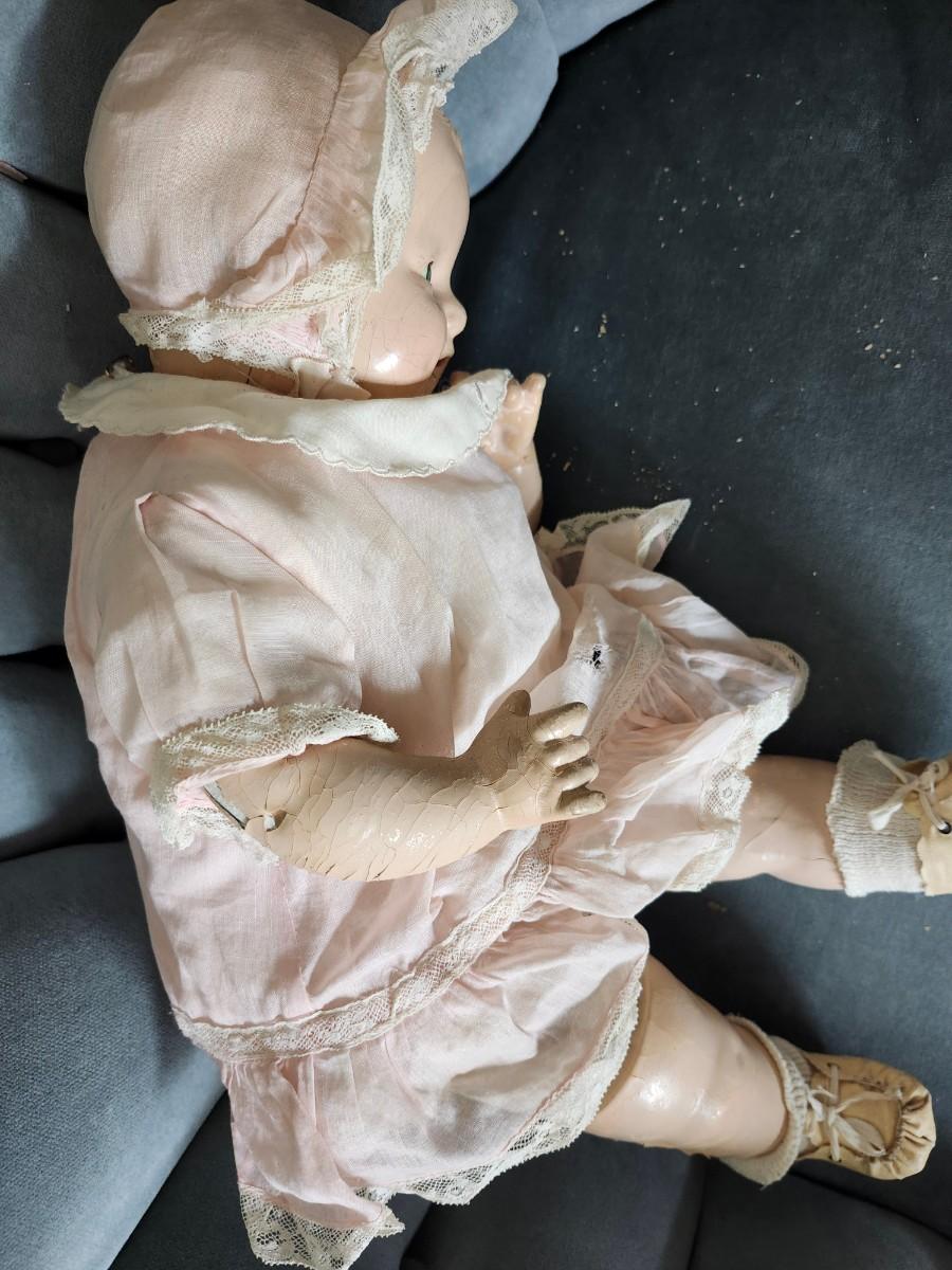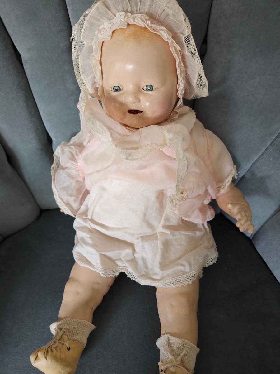 20 inch doll, composition head, cloth body, sleep eyes, 1920s
