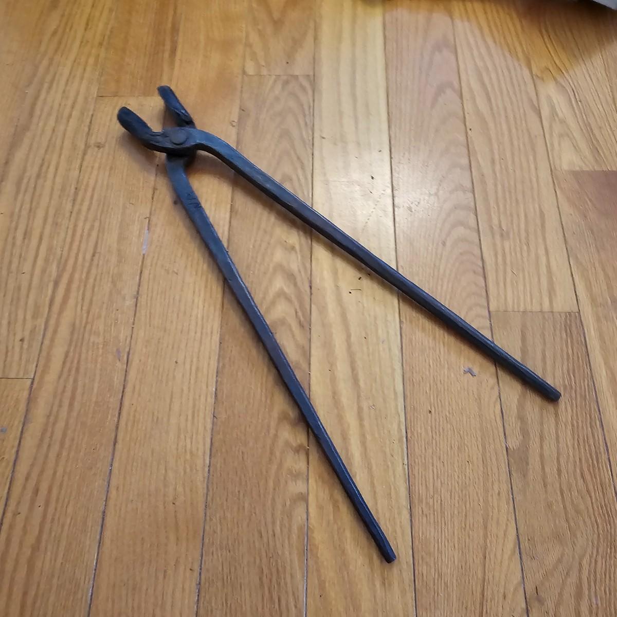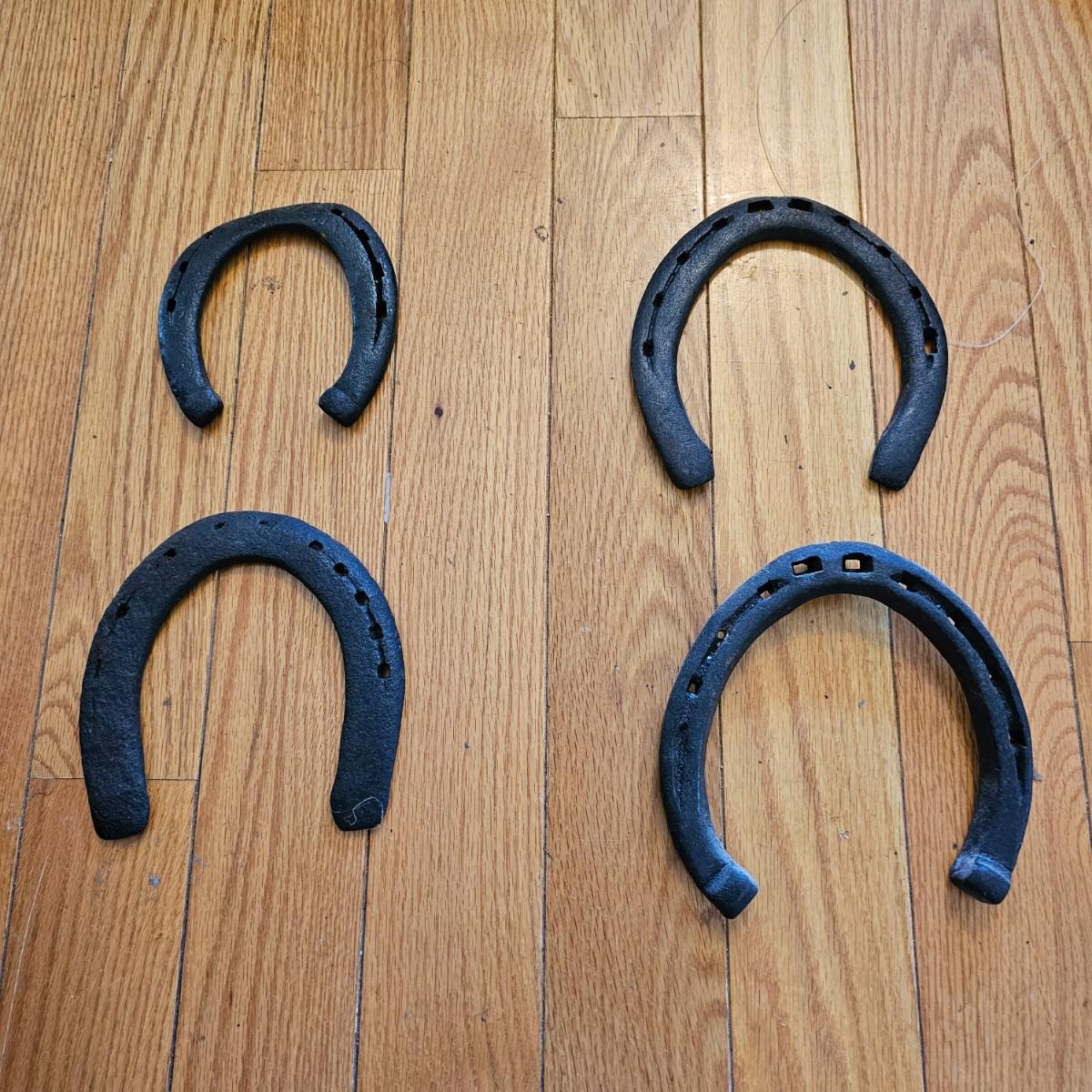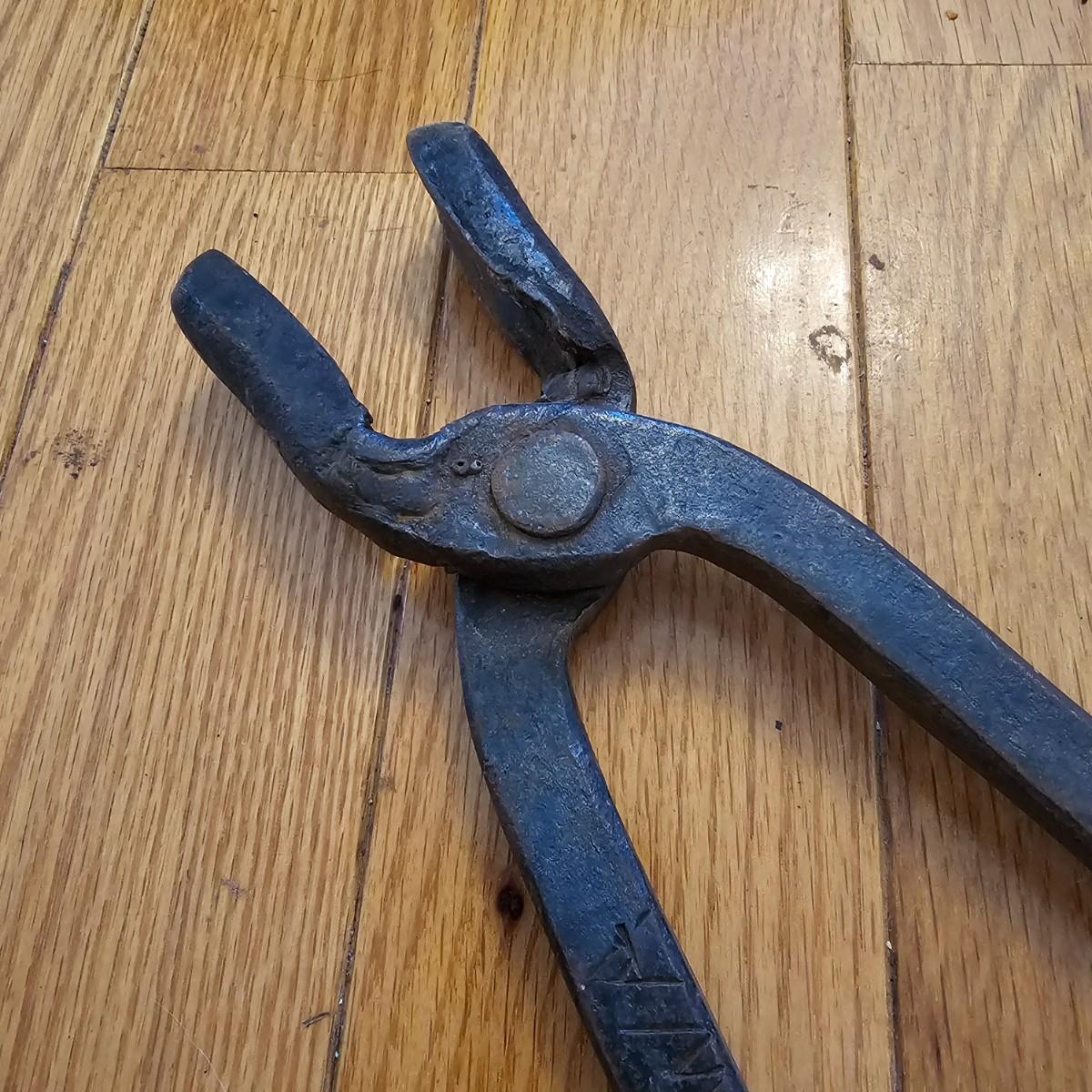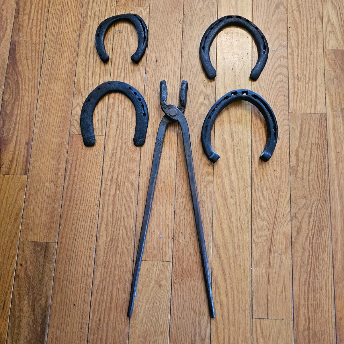 Four vintage iron horseshoes and a pair of blacksmith's tongs. Shoes are all handmade, range in size from 5" x 5" to 6" x 7". Tongs are 2" x 20.5" long. All items appear hand forged. See photos for details. Shipping available.
