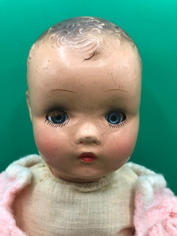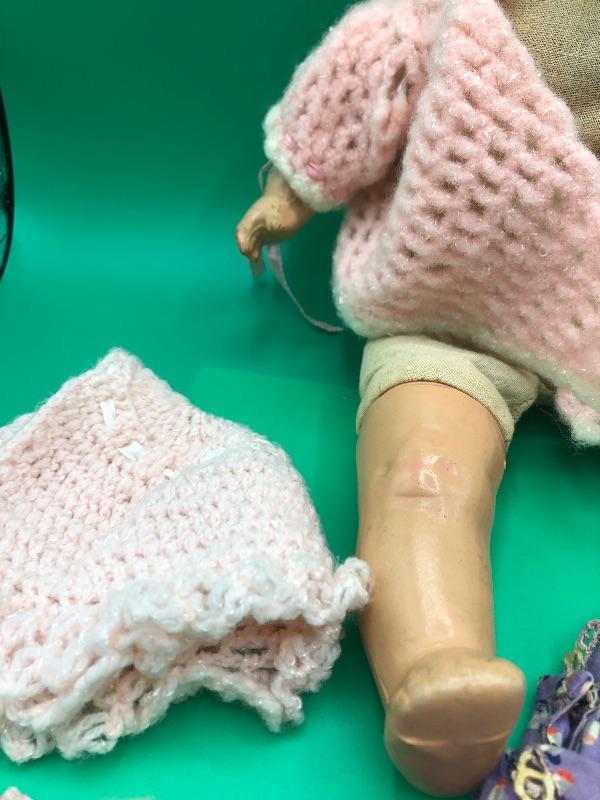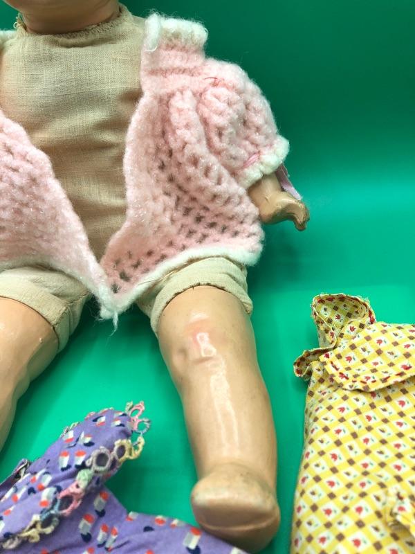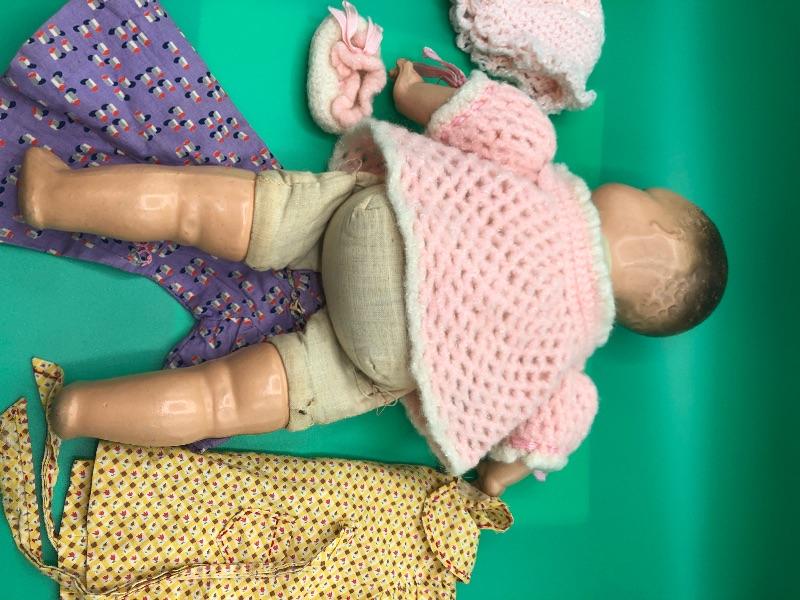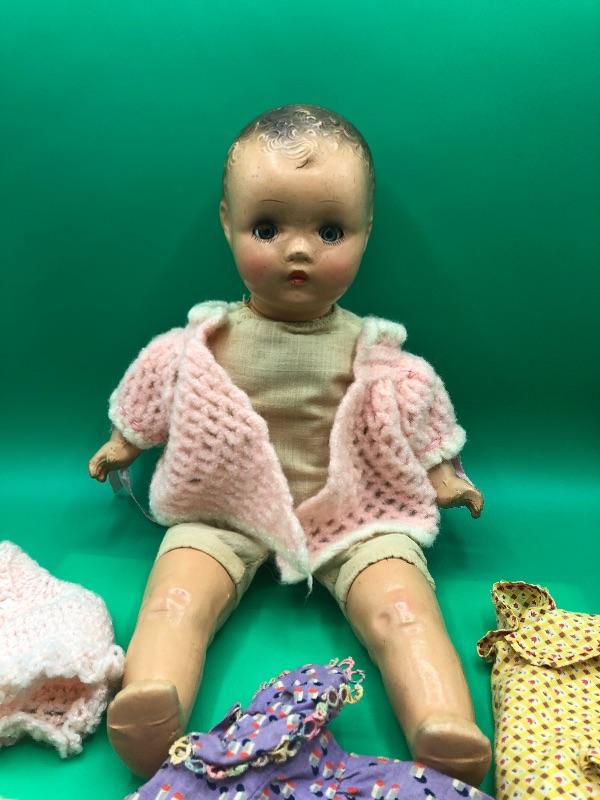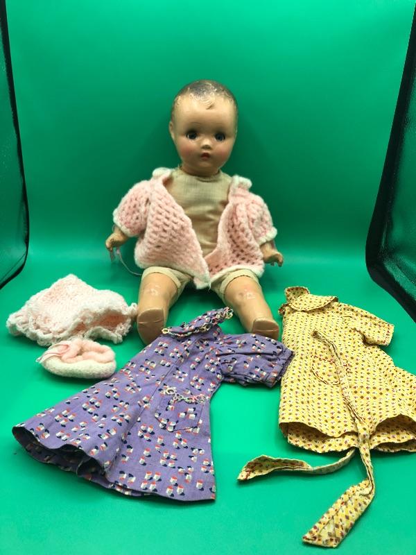 Vintage Horsman Baby Doll with a couple dresses. Doll has a stuff body with composite limbs and head. Sleepy eyes. Age unknown. Doll and clothes are well loved and played with.