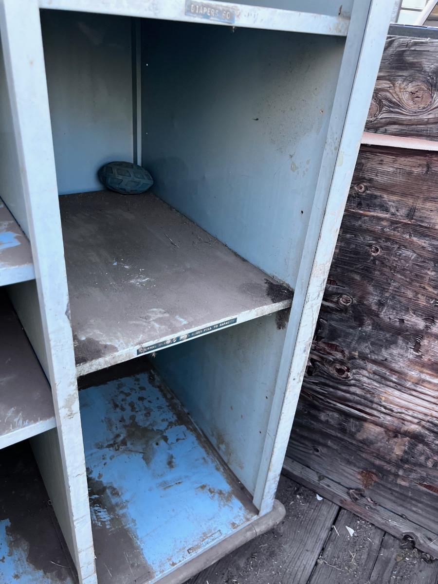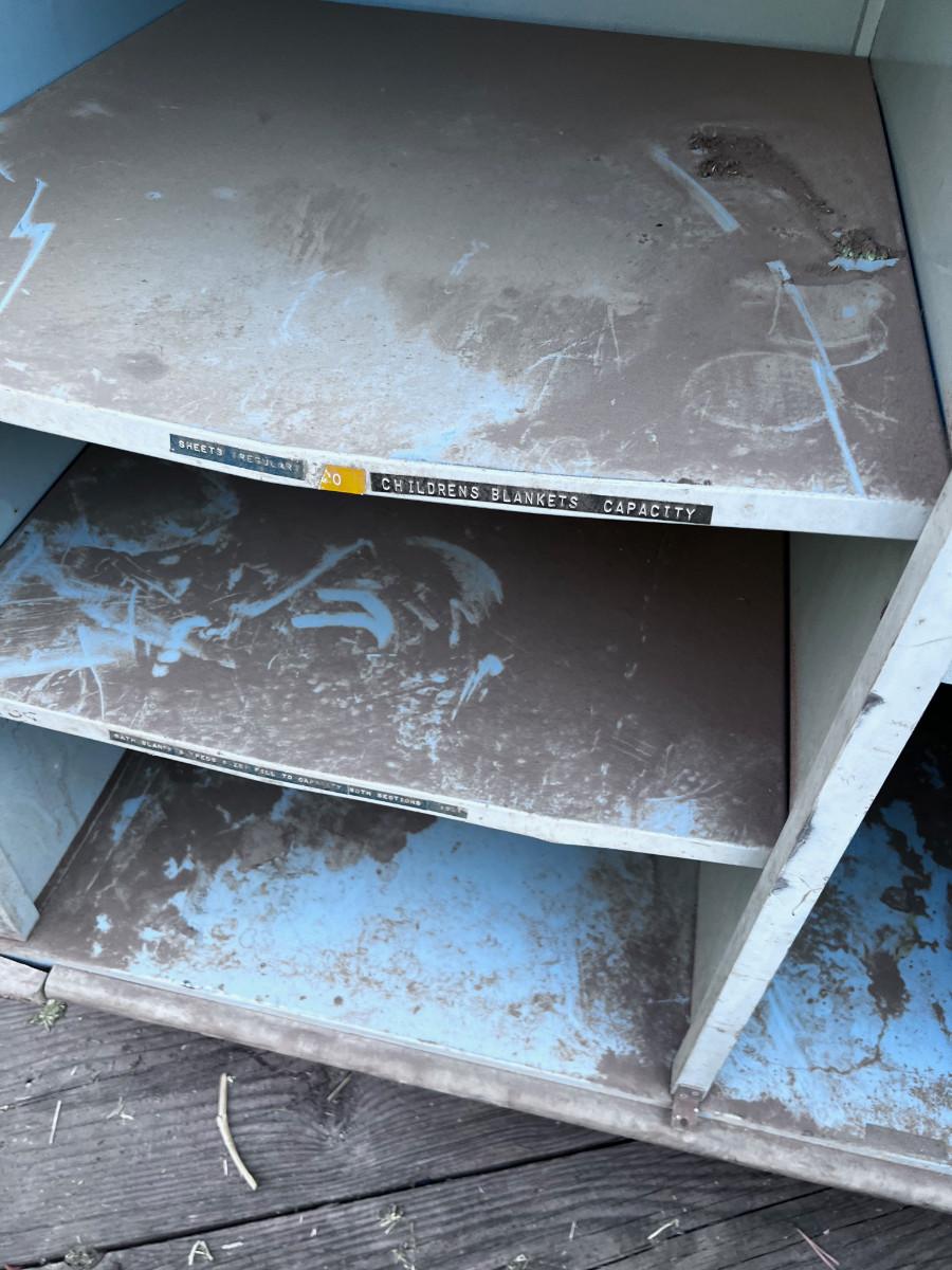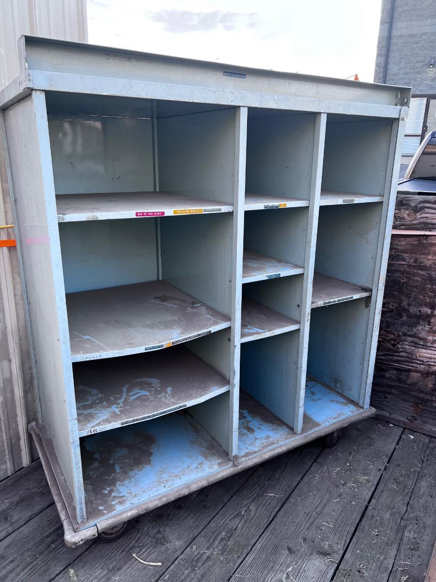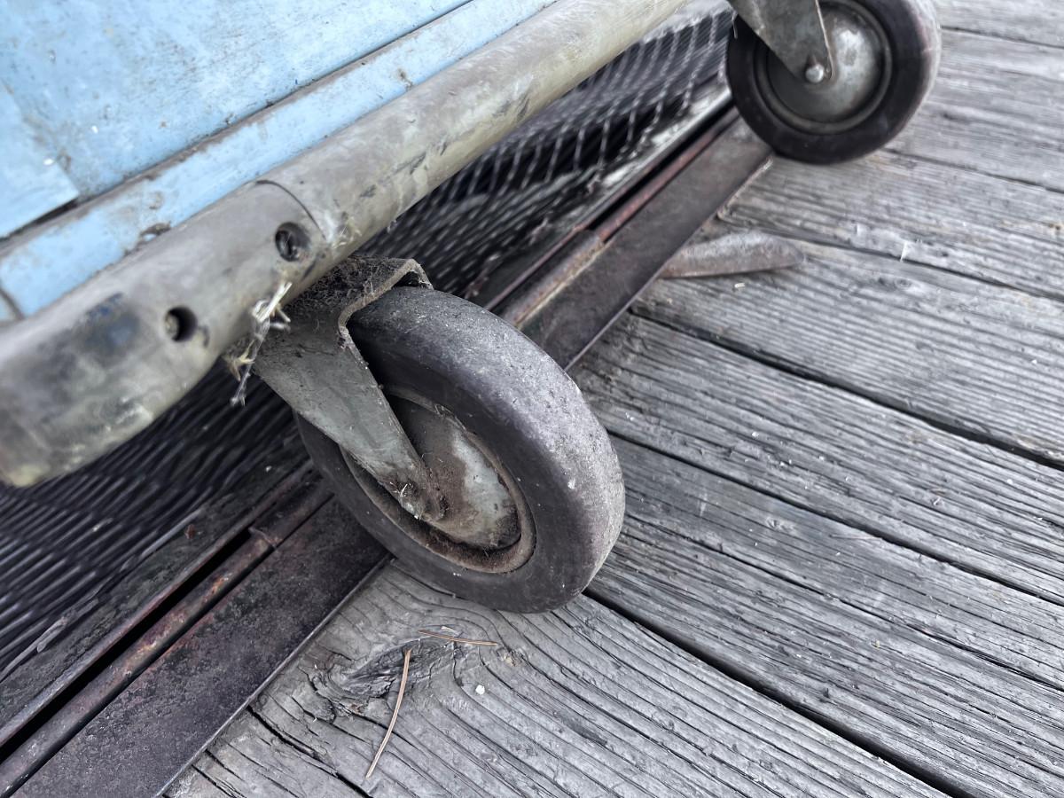 Great old rolling cart, rolls well, shows its age some wear. Couple of shelves are bent. Great rolling storage air you workshop or garage.