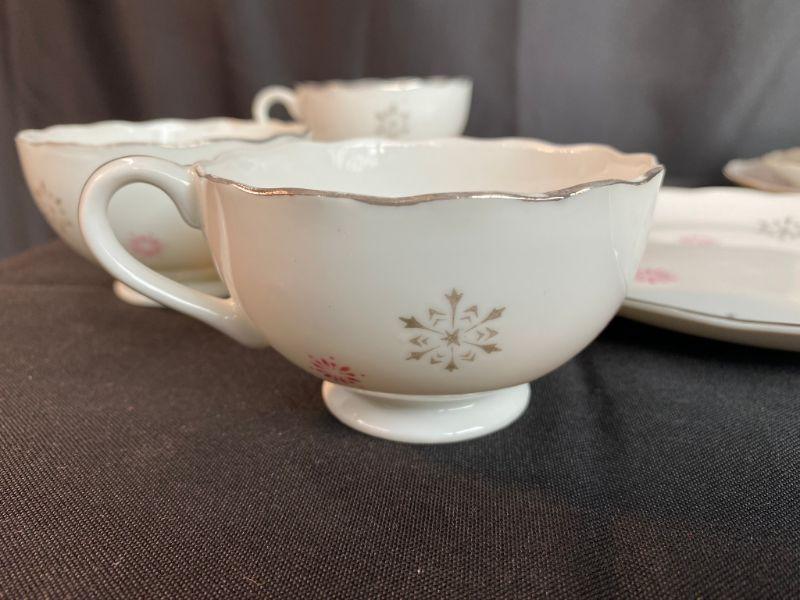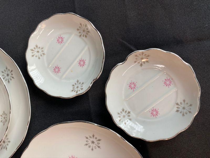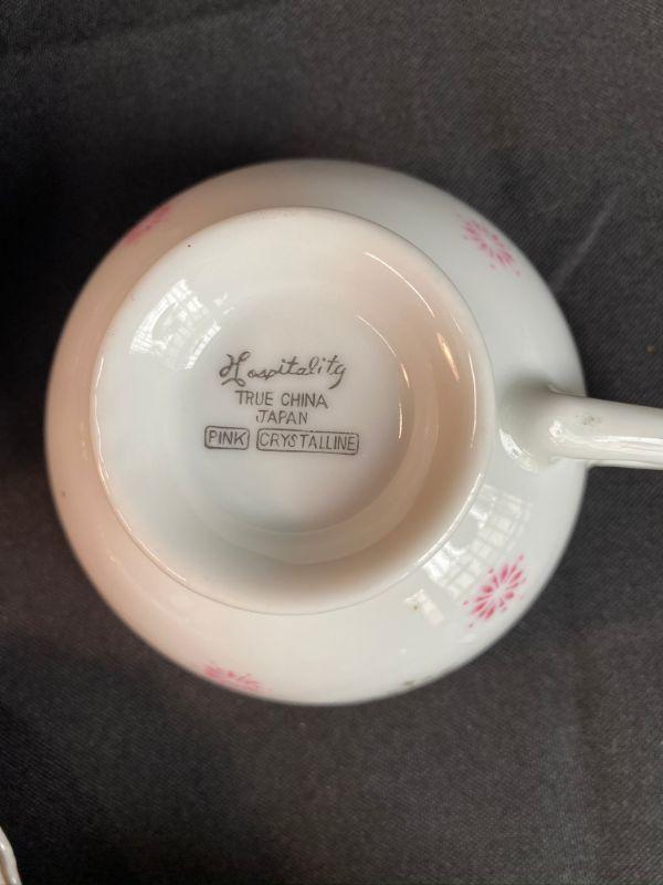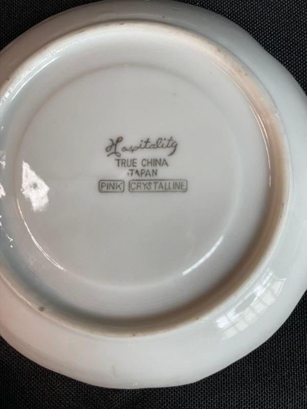 11 pieces of Hospitality True China in "Pink Crystalline" pattern. Pieces are in good condition. Made in Japan.