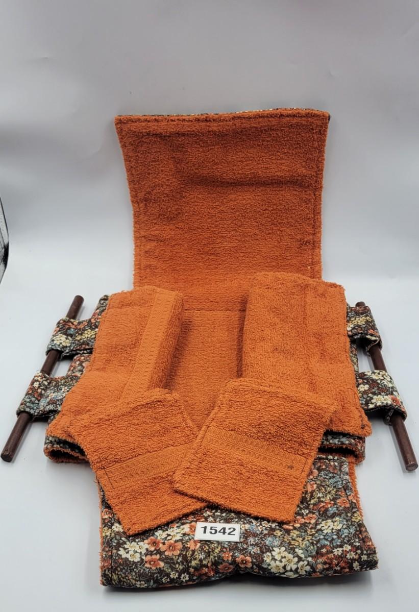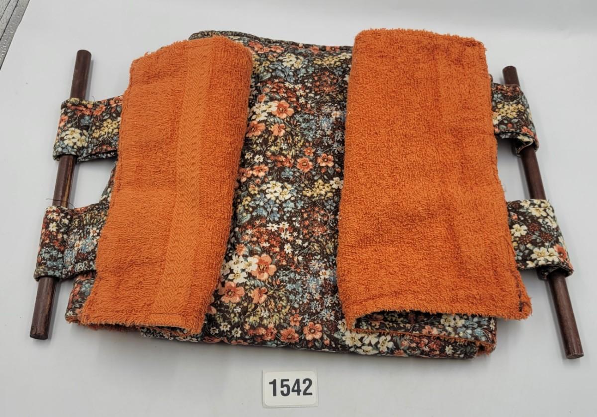 Vintage pattern. Wooden slip through handles for easy carrying. Comes with matching hot pads/holders (set of two).