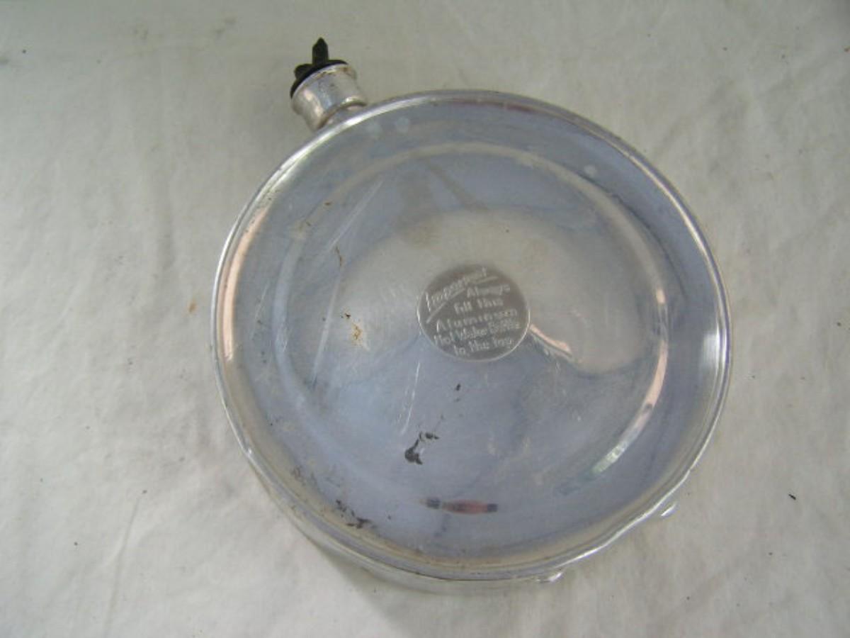 Vintage Hot Water Bottle with original stopper. Aluminum construction. About 7-1/2" dia