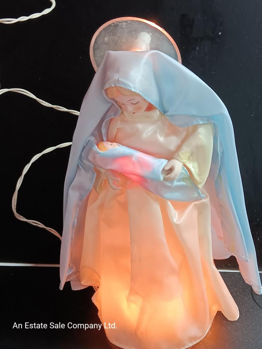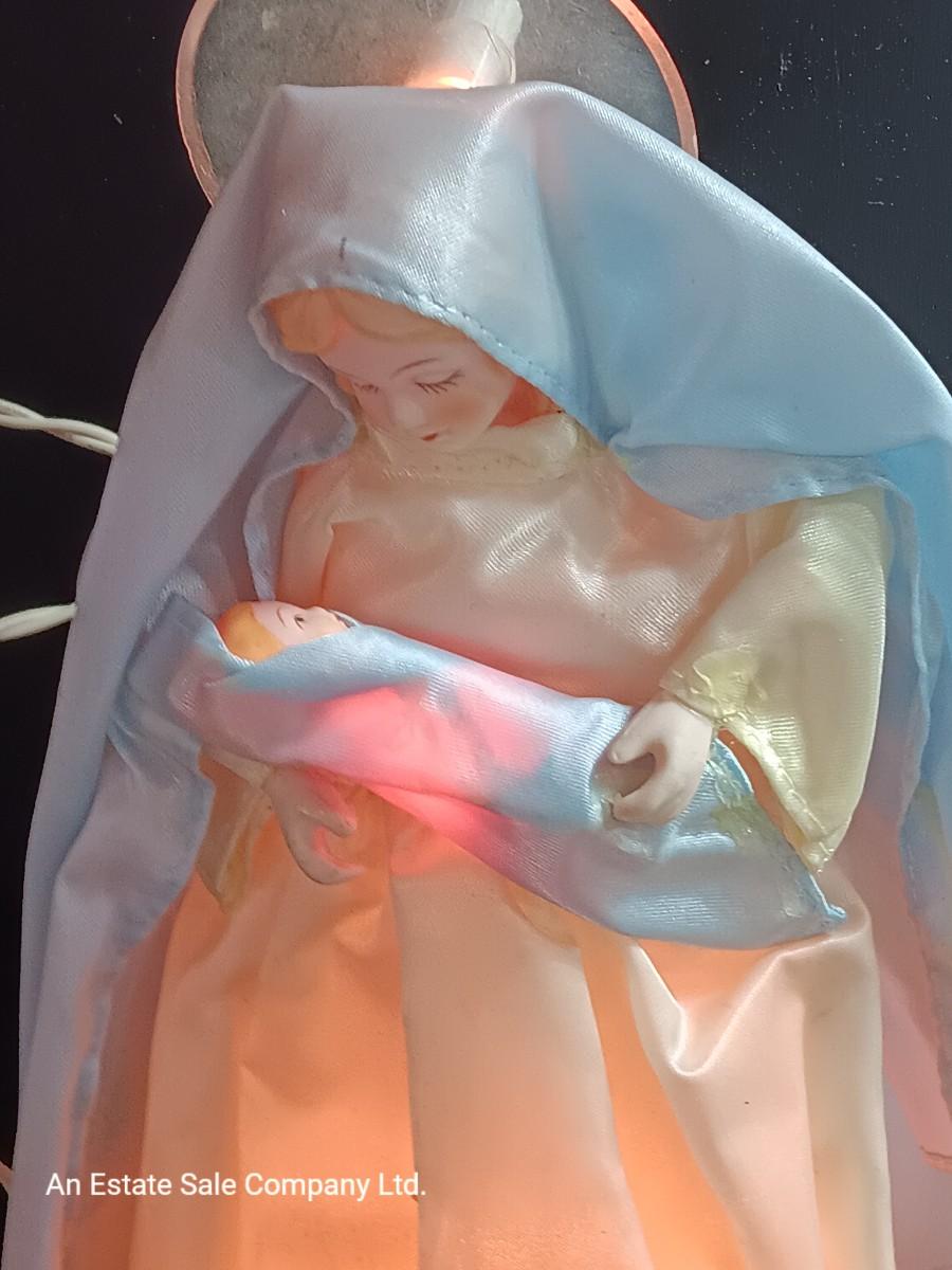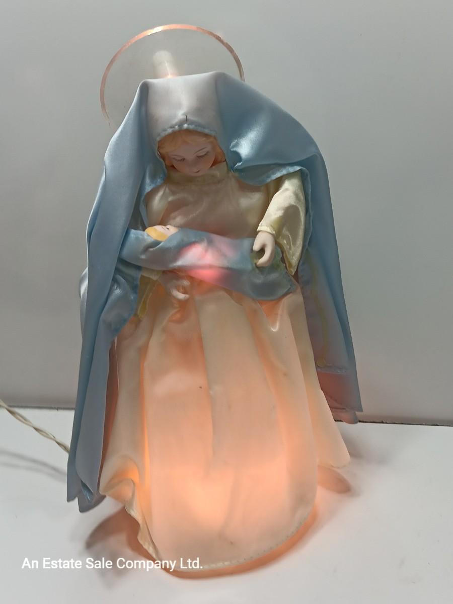 Very RARE and Beautiful Christmas Tree Topper or Holiday Decoration of the Virgin Mary holding Baby Jesus. The inside plastic cone is surrounded with lights and there is a light in the halo (see picture). All lights appear to work. Mary Stands 10" Tall with Porcelain Hands & Head. Baby Jesus also has a Porcelain head.by House of Lloyds ( label is missing). Mary is adorned in Blue/White Cloth/Fabric with Baby Jesus Wrapped in Matching Blue Cloth. This is truly a wonderful find and sure to bless any tree!