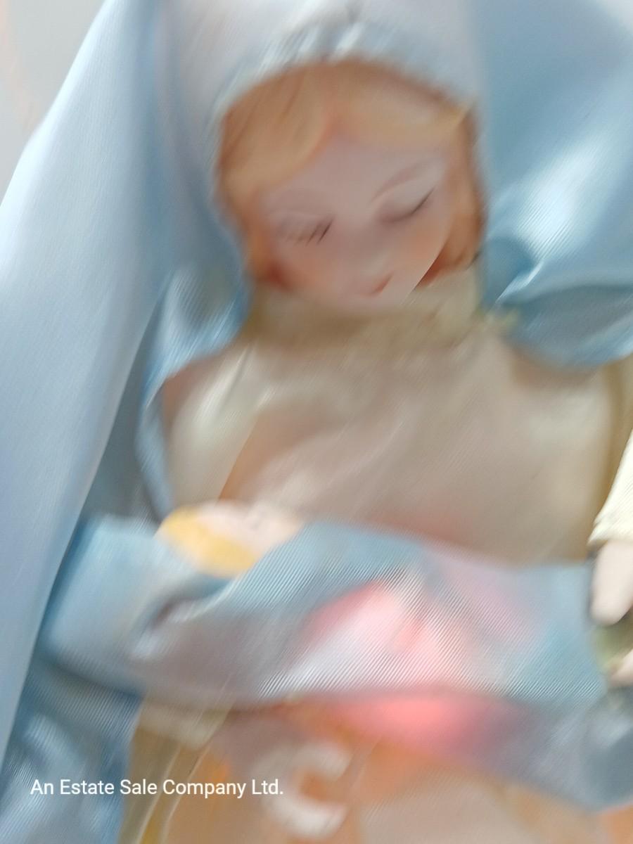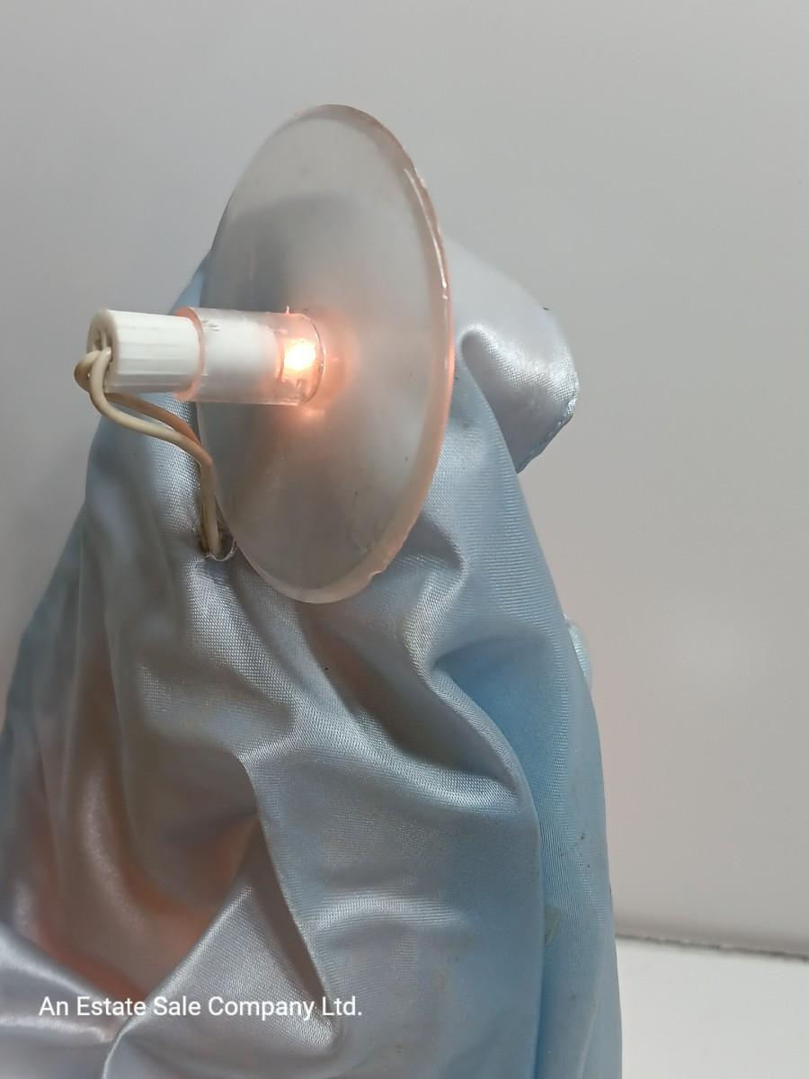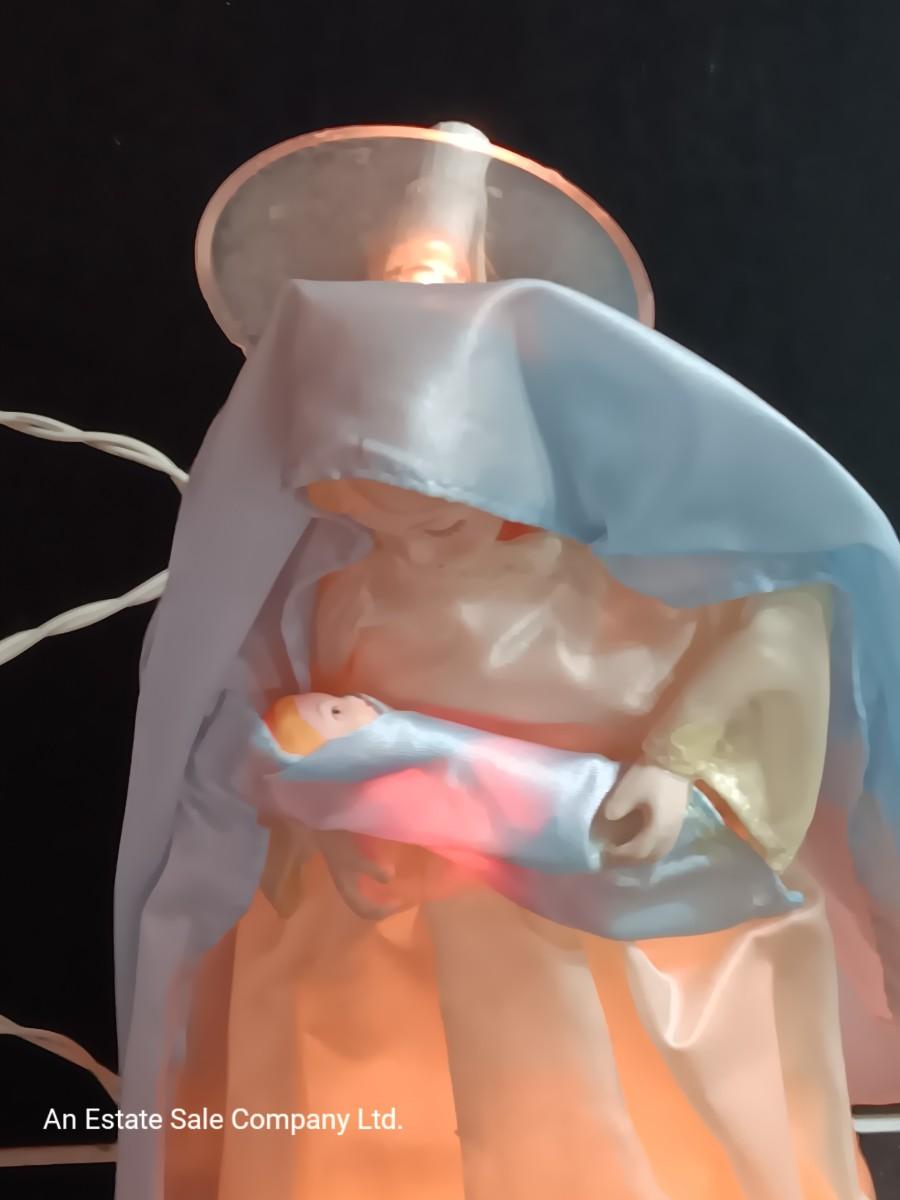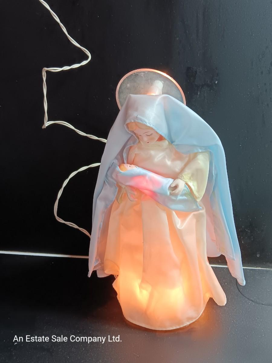 Very RARE and Beautiful Christmas Tree Topper or Holiday Decoration of the Virgin Mary holding Baby Jesus. The inside plastic cone is surrounded with lights and there is a light in the halo (see picture). All lights appear to work. Mary Stands 10" Tall with Porcelain Hands & Head. Baby Jesus also has a Porcelain head.by House of Lloyds ( label is missing). Mary is adorned in Blue/White Cloth/Fabric with Baby Jesus Wrapped in Matching Blue Cloth. This is truly a wonderful find and sure to bless any tree!