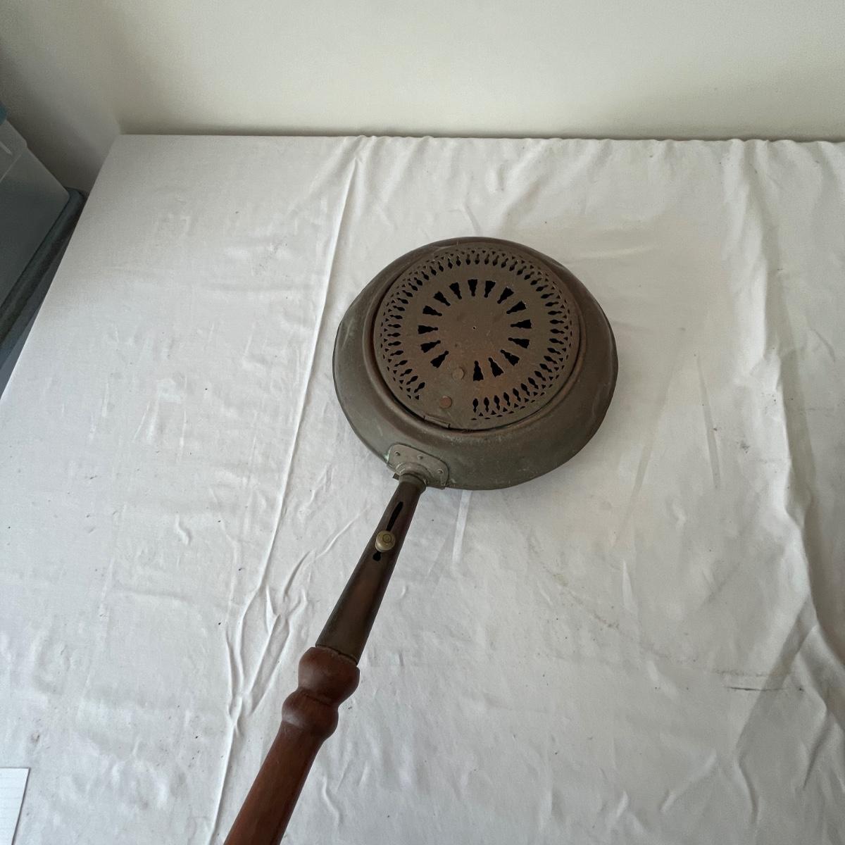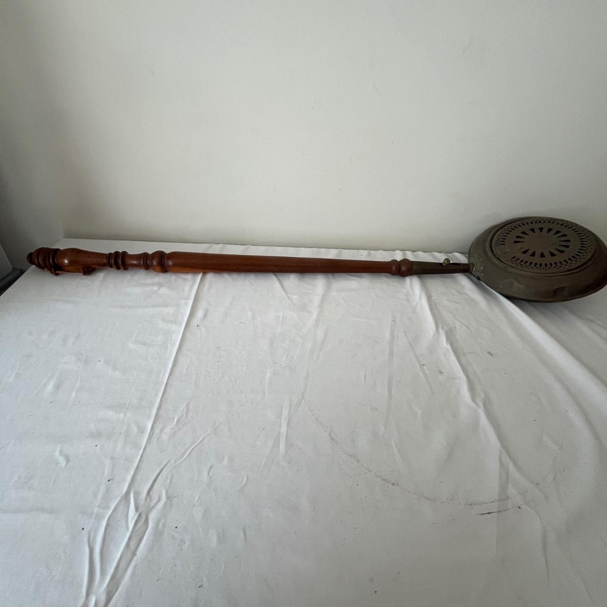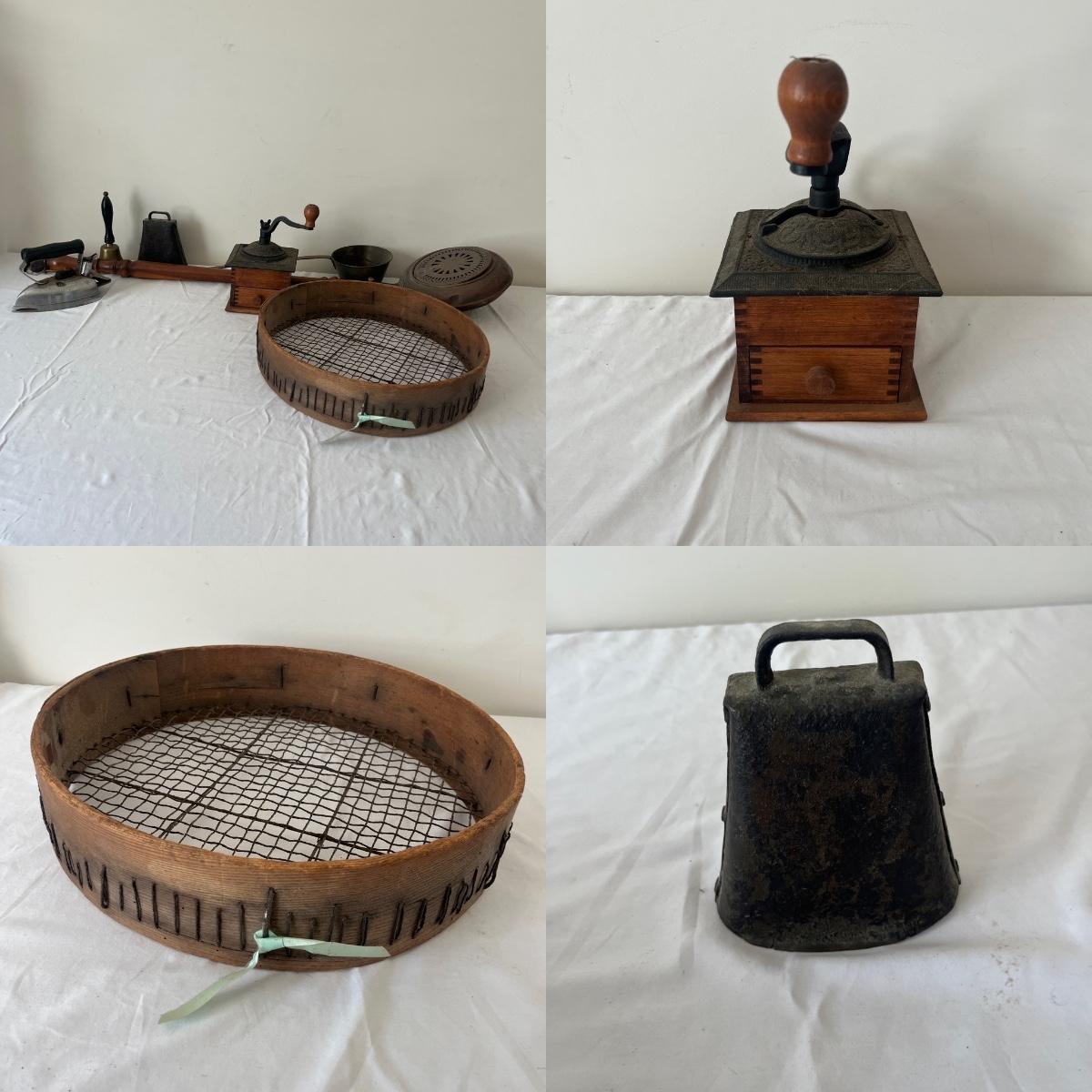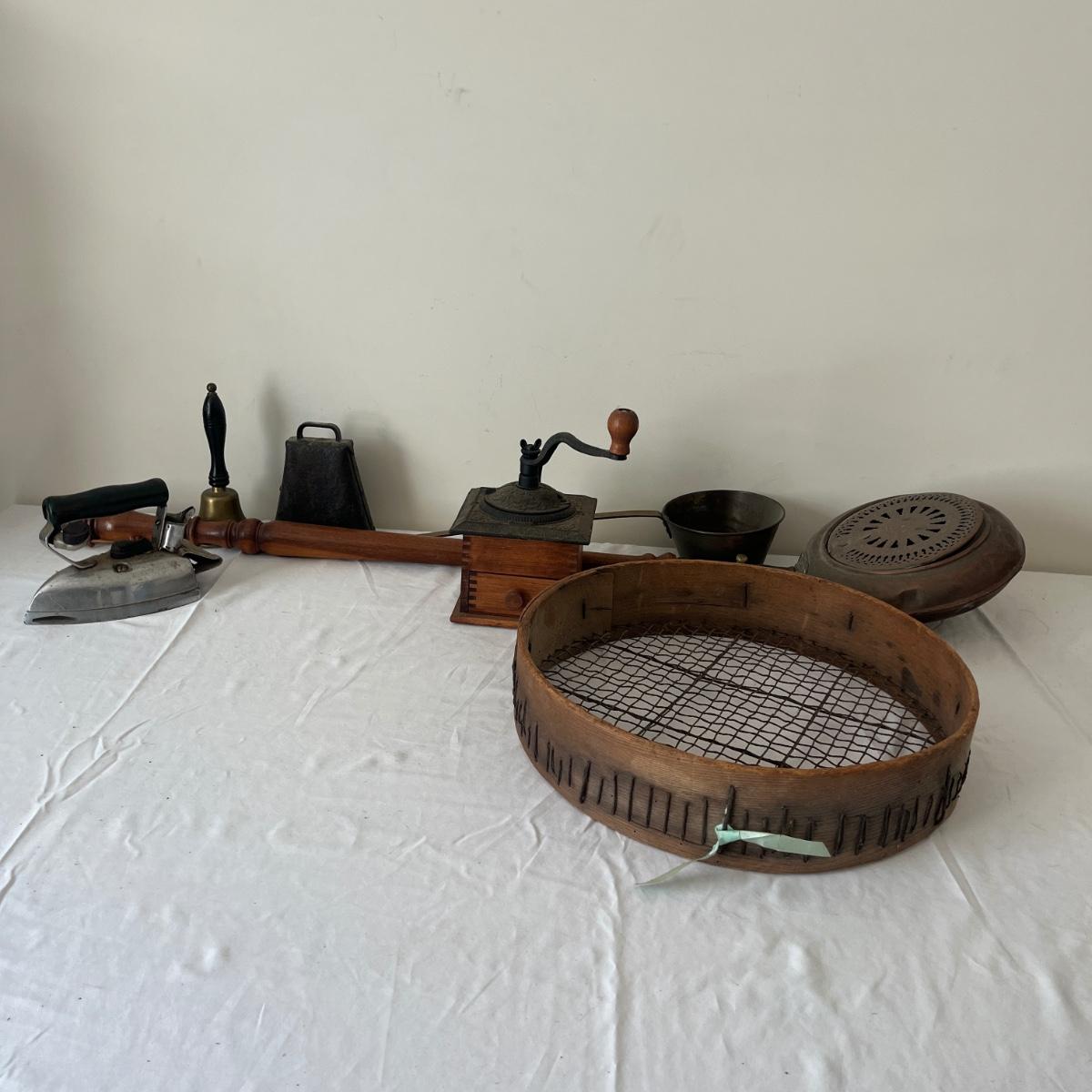 Lot includes a copper and wooden bed warmer, coffee grinder, metal cowbell, brass bell, copper and brass pot, Hotpoint electric iron with no cord and wood and metal sifter. Bed warmer measures 45” x 11” x 4” and is coming apart where handle attaches, see pictures.