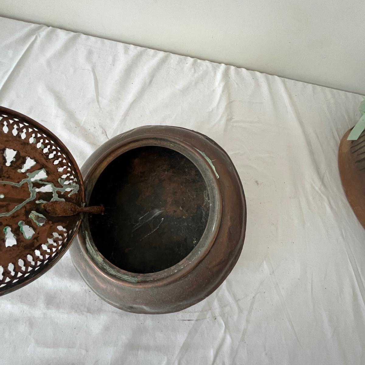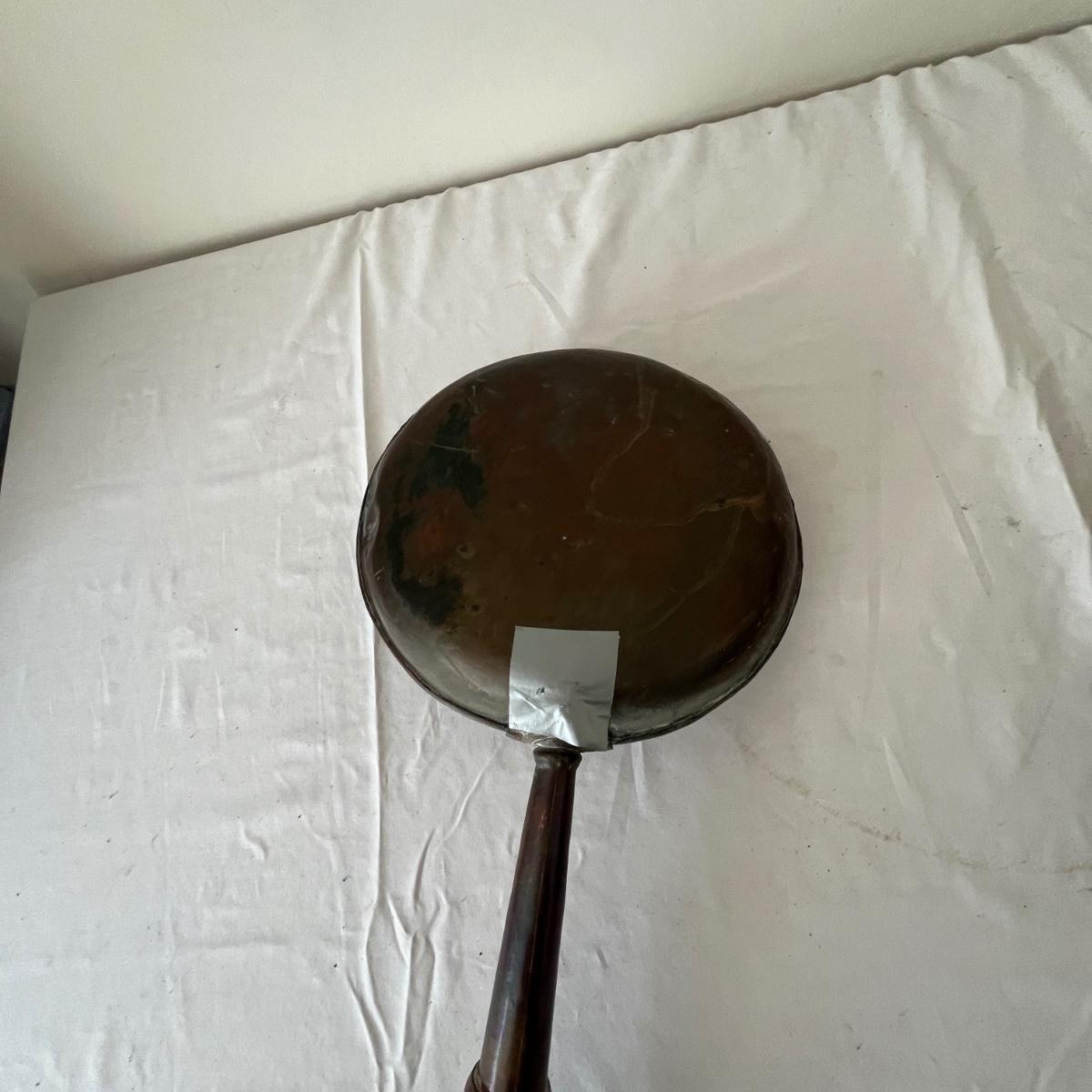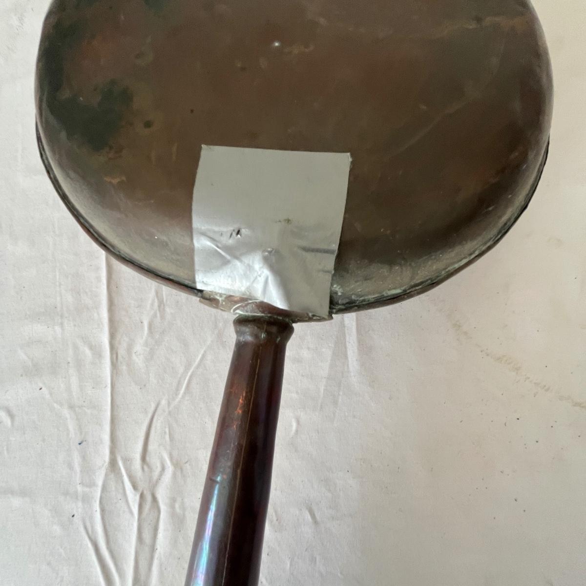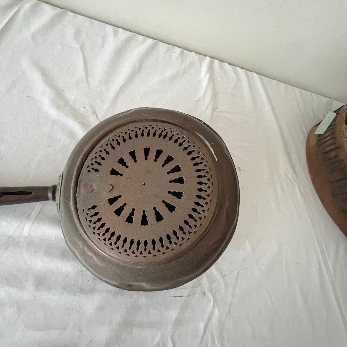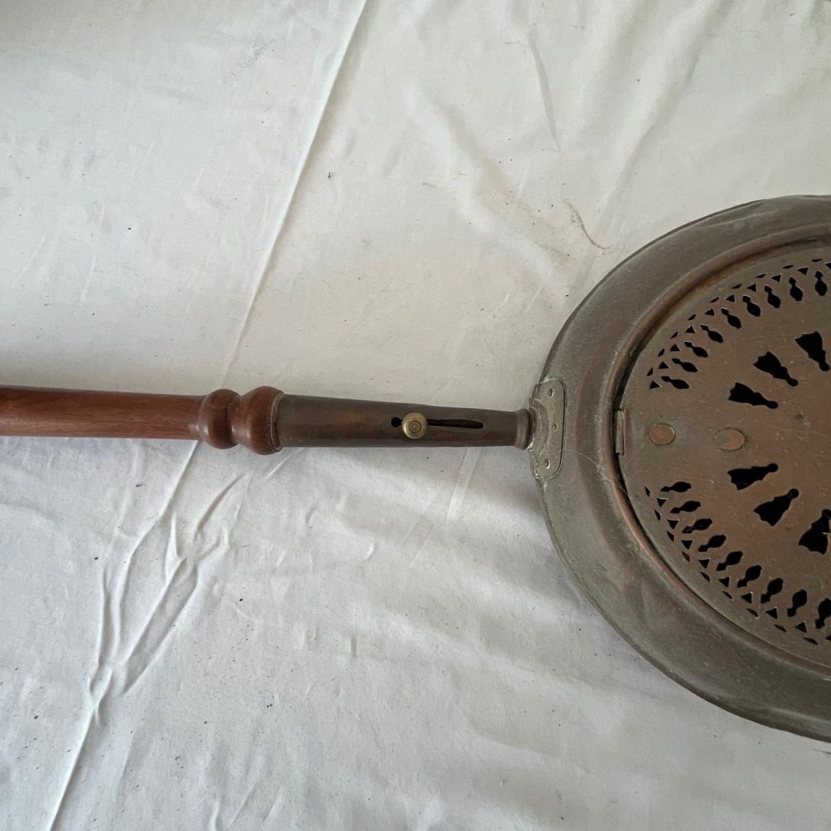 Lot includes a copper and wooden bed warmer, coffee grinder, metal cowbell, brass bell, copper and brass pot, Hotpoint electric iron with no cord and wood and metal sifter. Bed warmer measures 45” x 11” x 4” and is coming apart where handle attaches, see pictures.