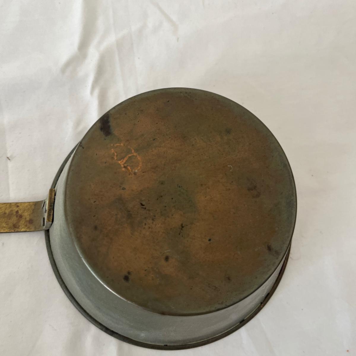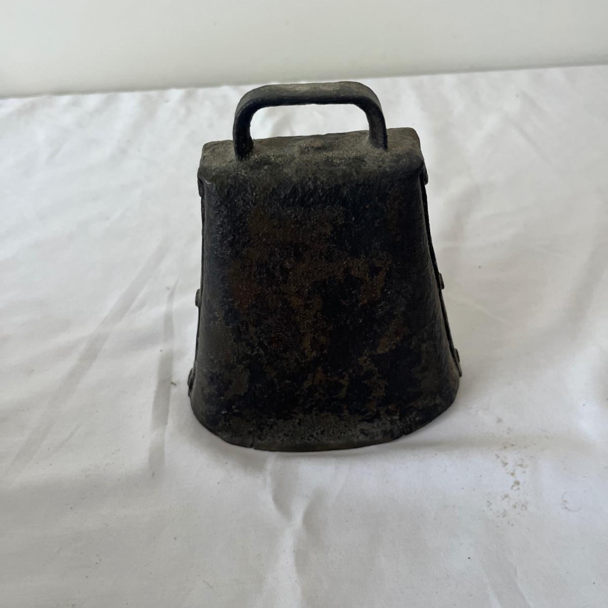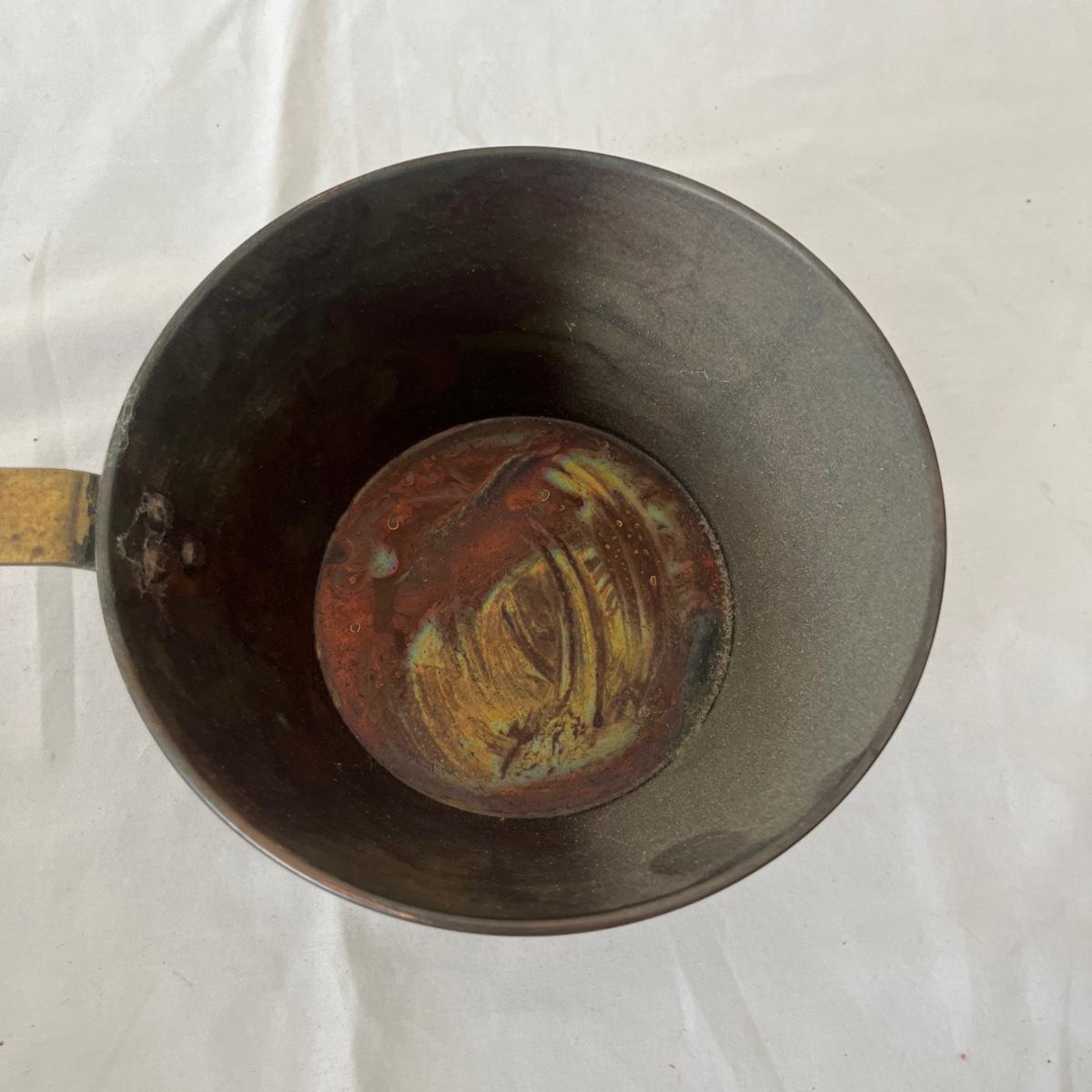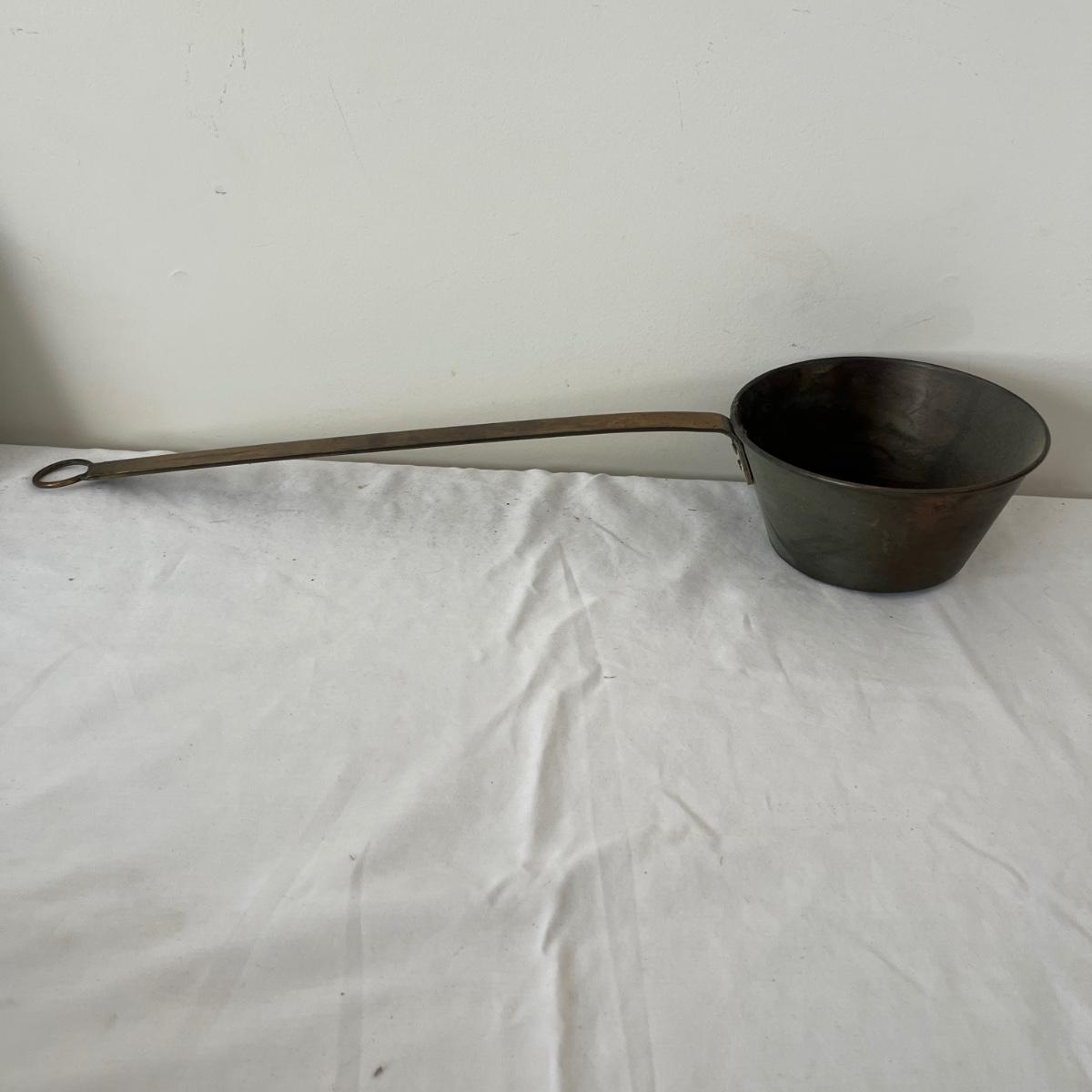Lot includes a copper and wooden bed warmer, coffee grinder, metal cowbell, brass bell, copper and brass pot, Hotpoint electric iron with no cord and wood and metal sifter. Bed warmer measures 45” x 11” x 4” and is coming apart where handle attaches, see pictures.