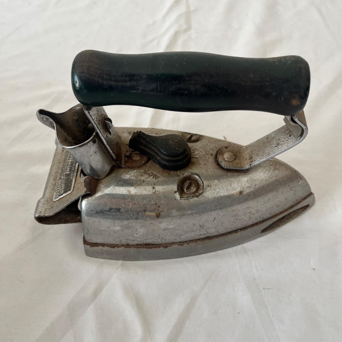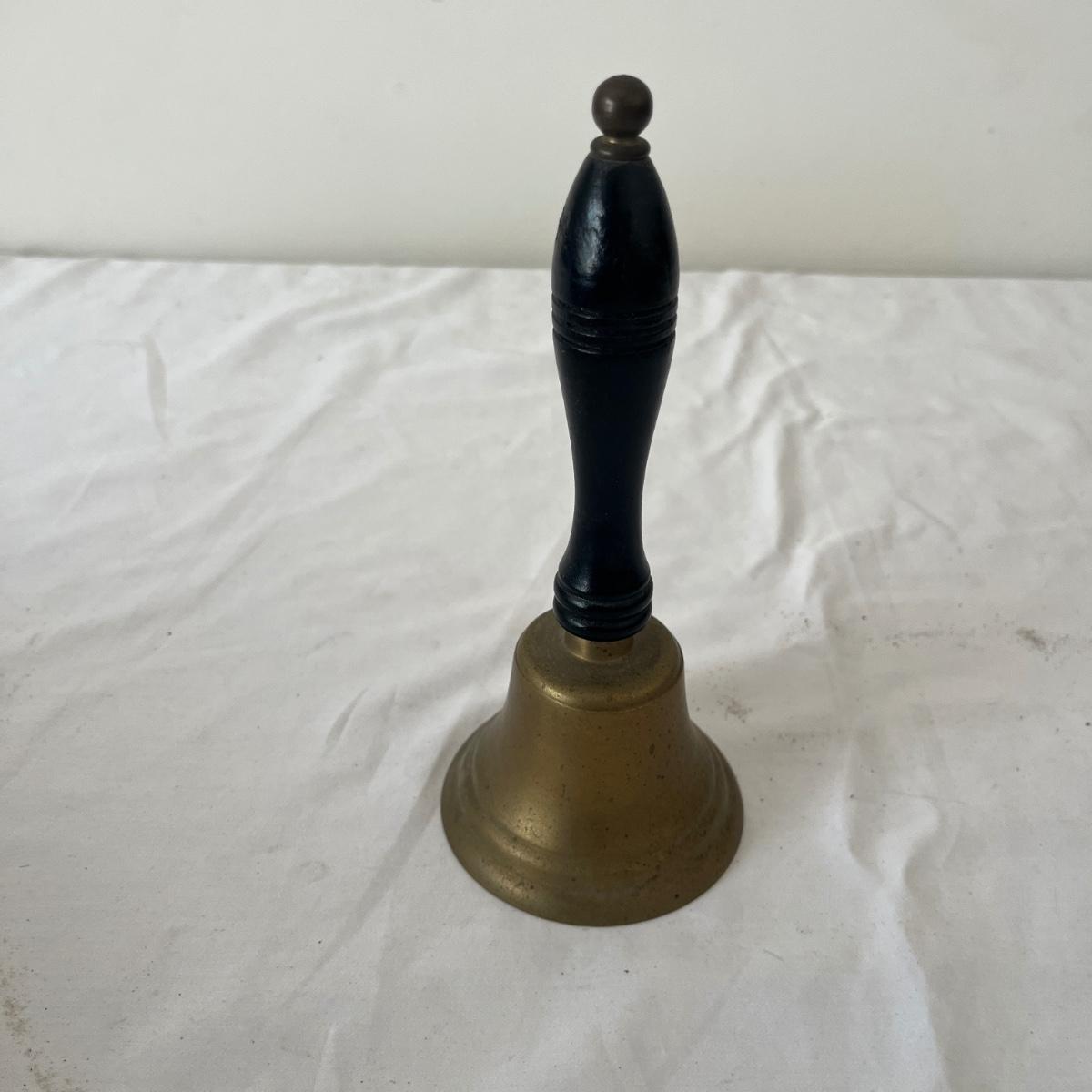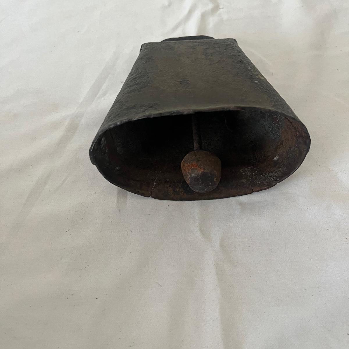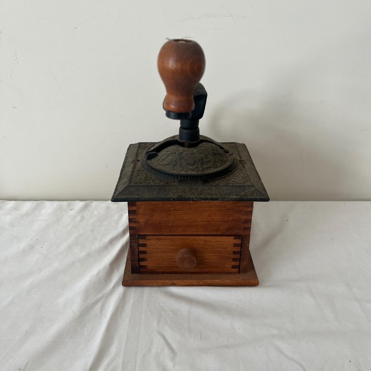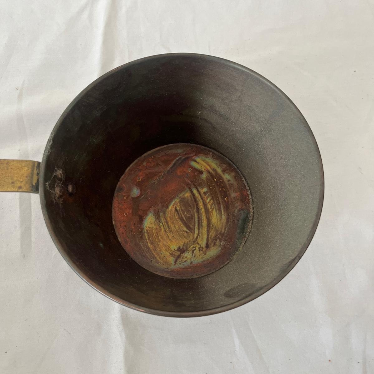 Lot includes a copper and wooden bed warmer, coffee grinder, metal cowbell, brass bell, copper and brass pot, Hotpoint electric iron with no cord and wood and metal sifter. Bed warmer measures 45” x 11” x 4” and is coming apart where handle attaches, see pictures.