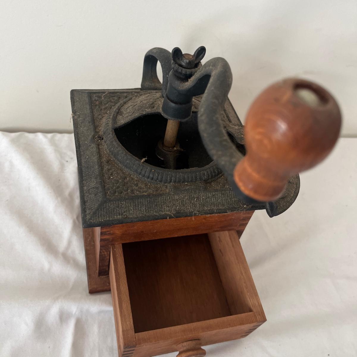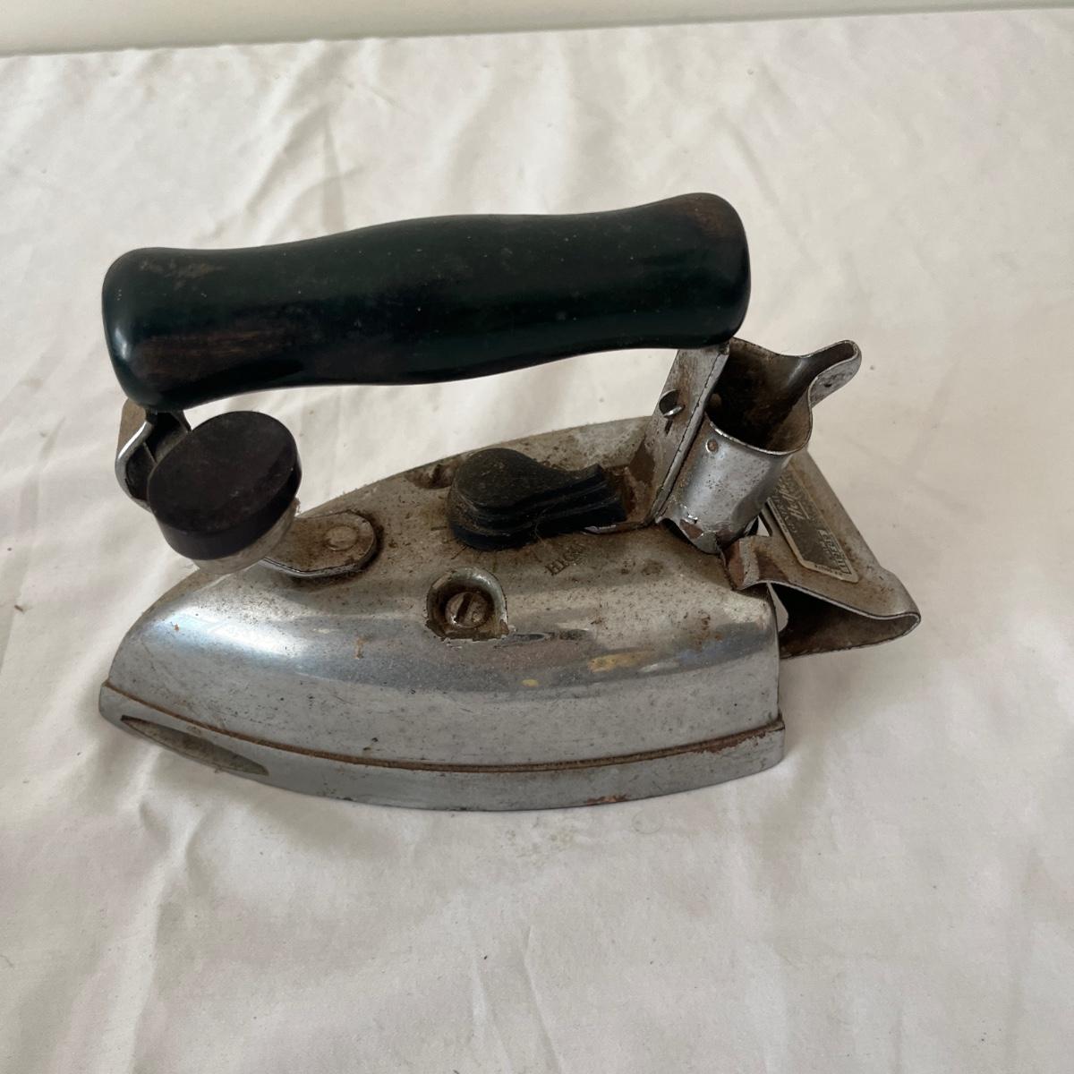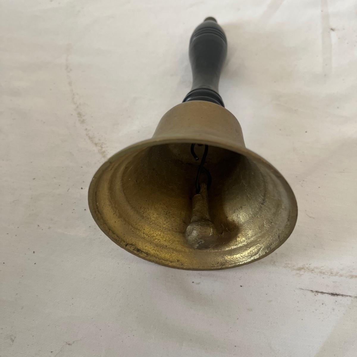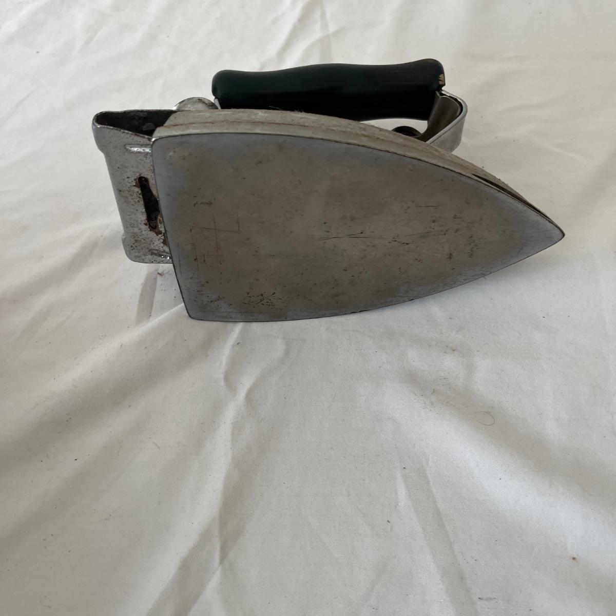 Lot includes a copper and wooden bed warmer, coffee grinder, metal cowbell, brass bell, copper and brass pot, Hotpoint electric iron with no cord and wood and metal sifter. Bed warmer measures 45” x 11” x 4” and is coming apart where handle attaches, see pictures.