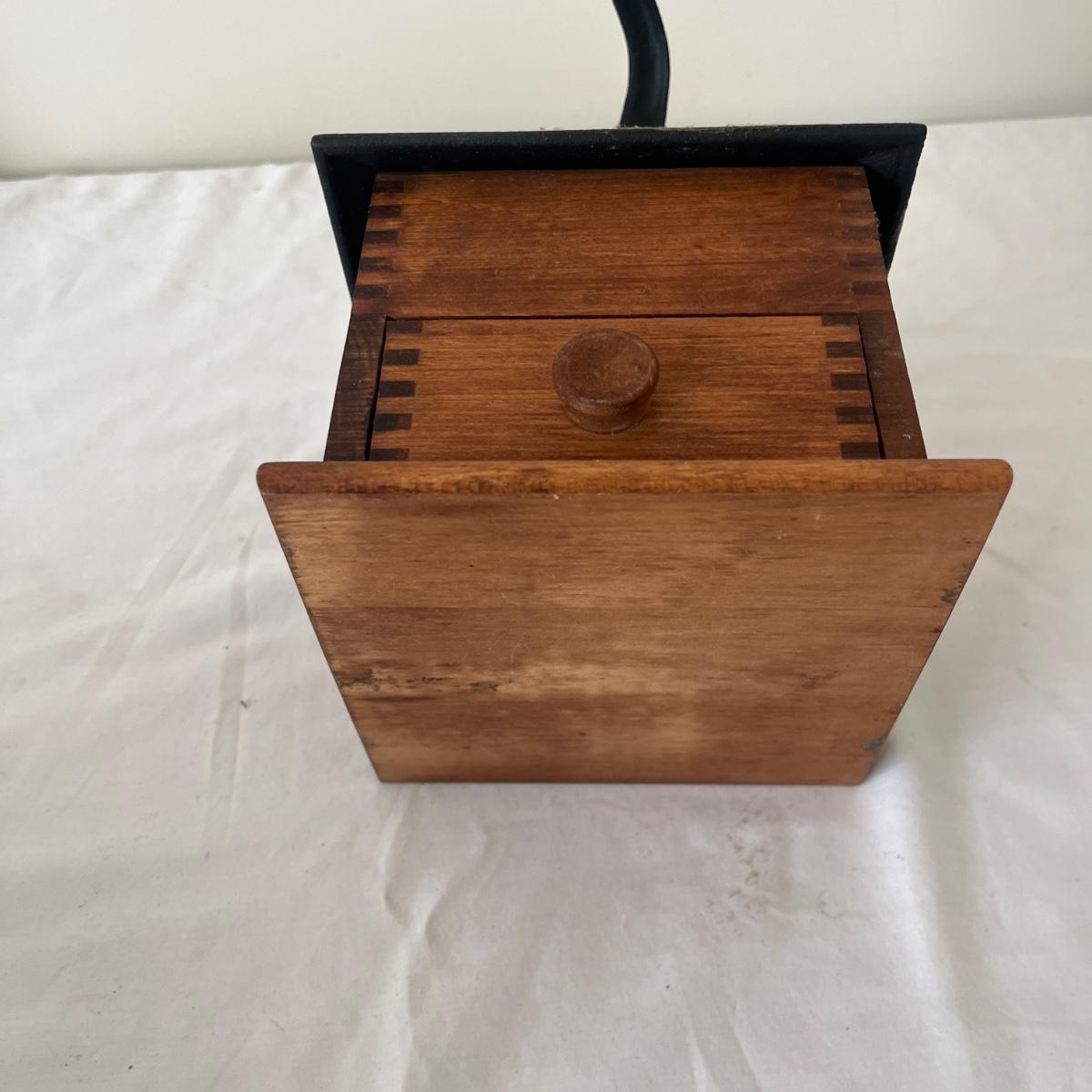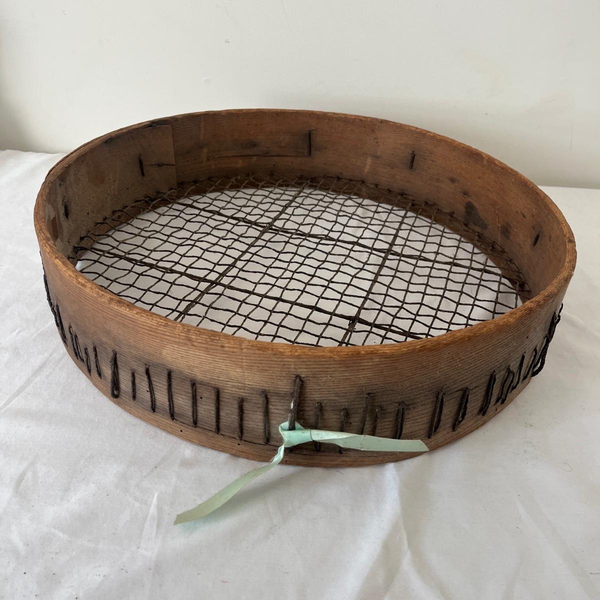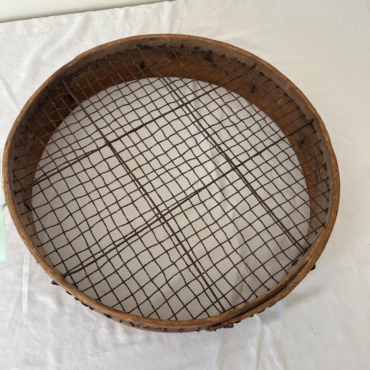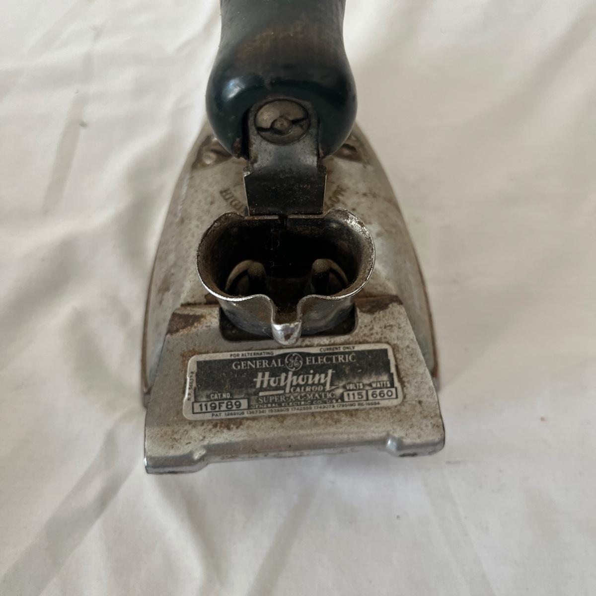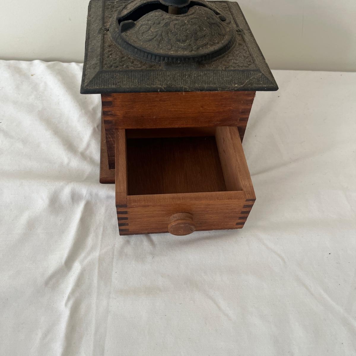 Lot includes a copper and wooden bed warmer, coffee grinder, metal cowbell, brass bell, copper and brass pot, Hotpoint electric iron with no cord and wood and metal sifter. Bed warmer measures 45” x 11” x 4” and is coming apart where handle attaches, see pictures.