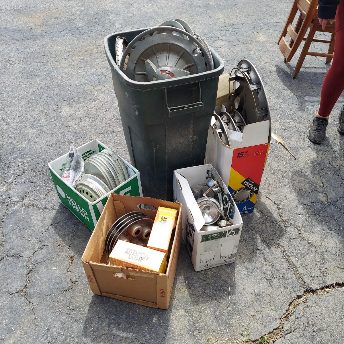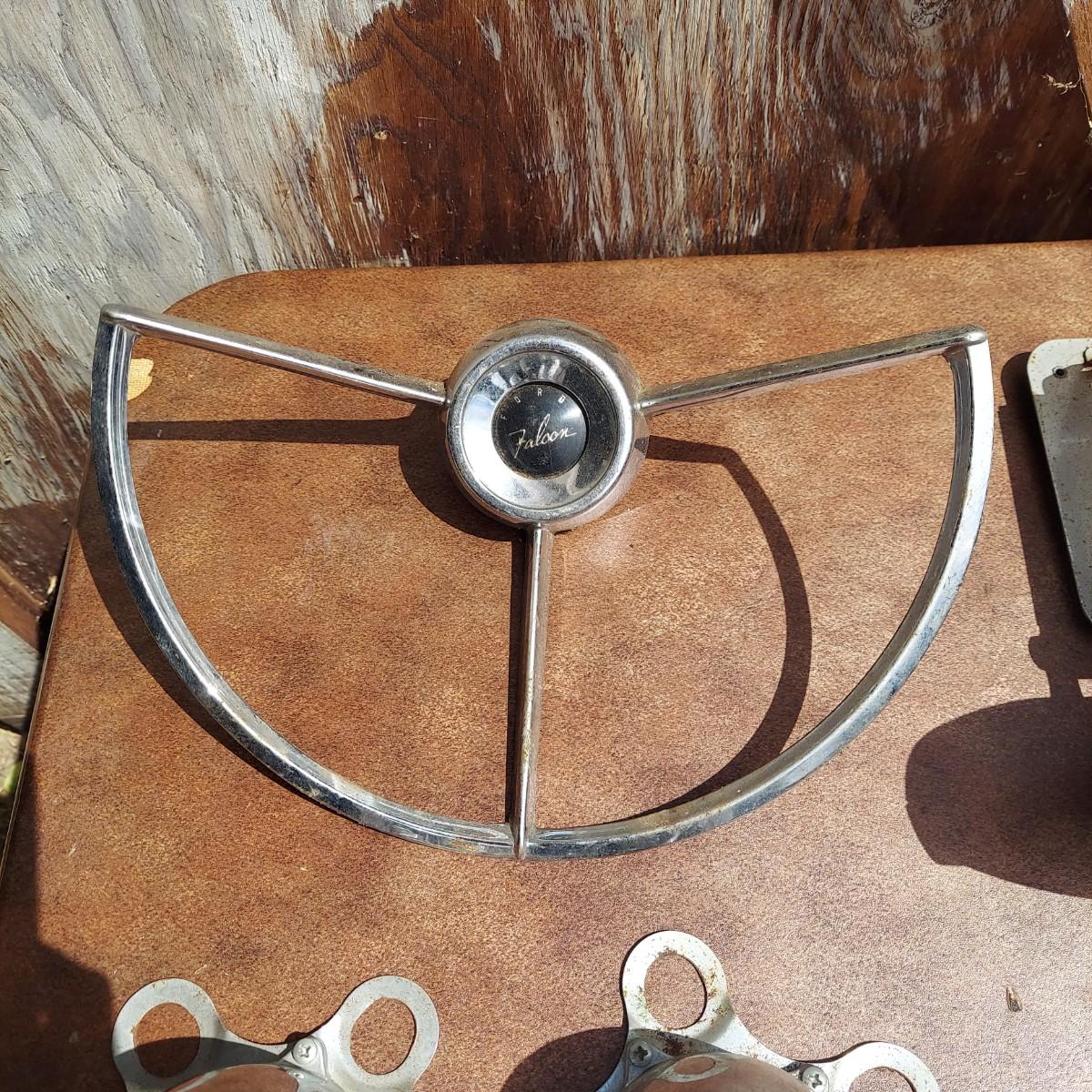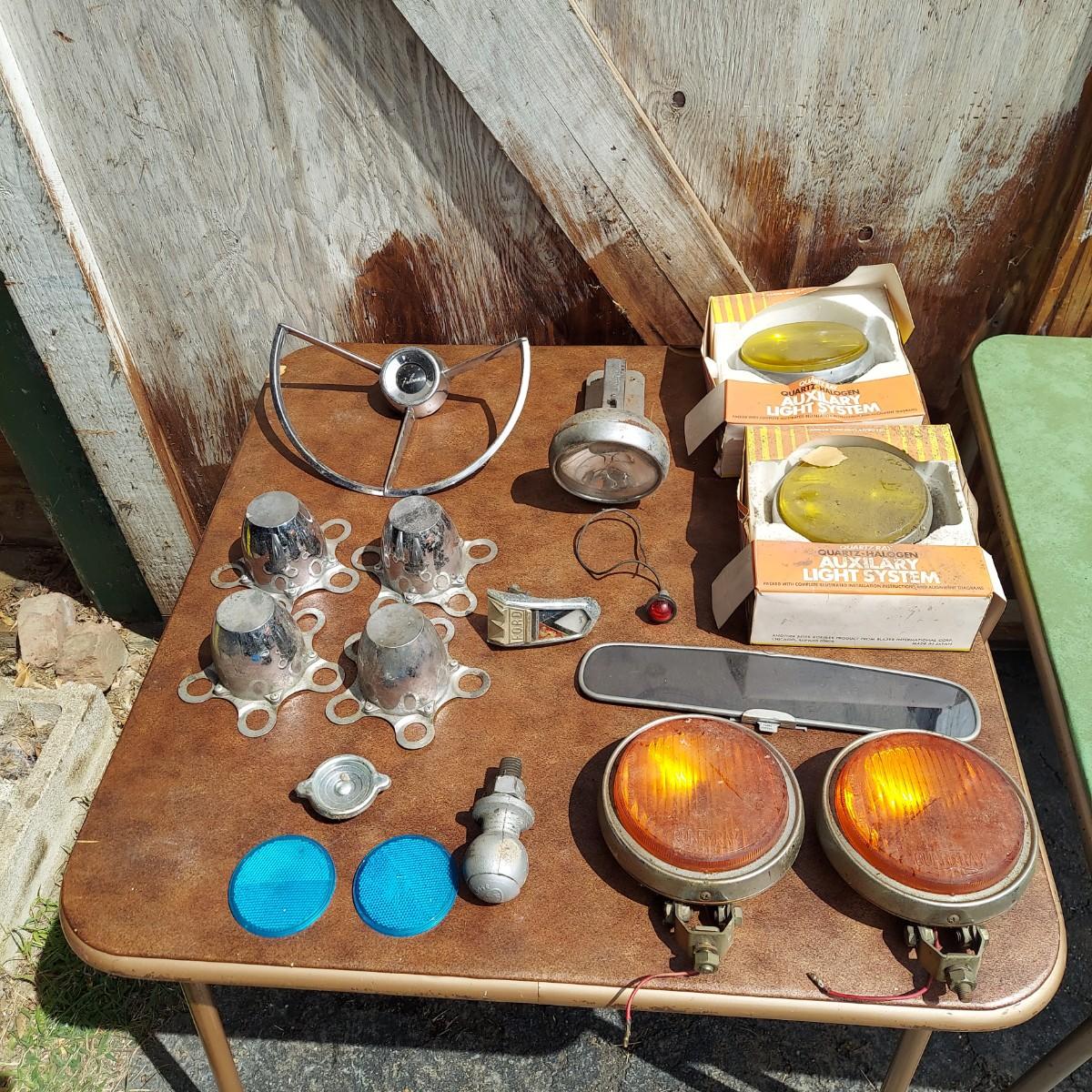 Several different hubcaps from Buick, Chevy and more. Includes car parts like a Ford Falcon steering wheel. Please see photos for details. Local Pickup Only