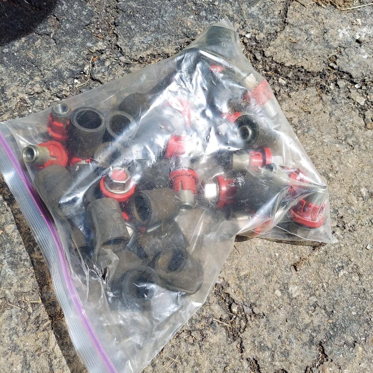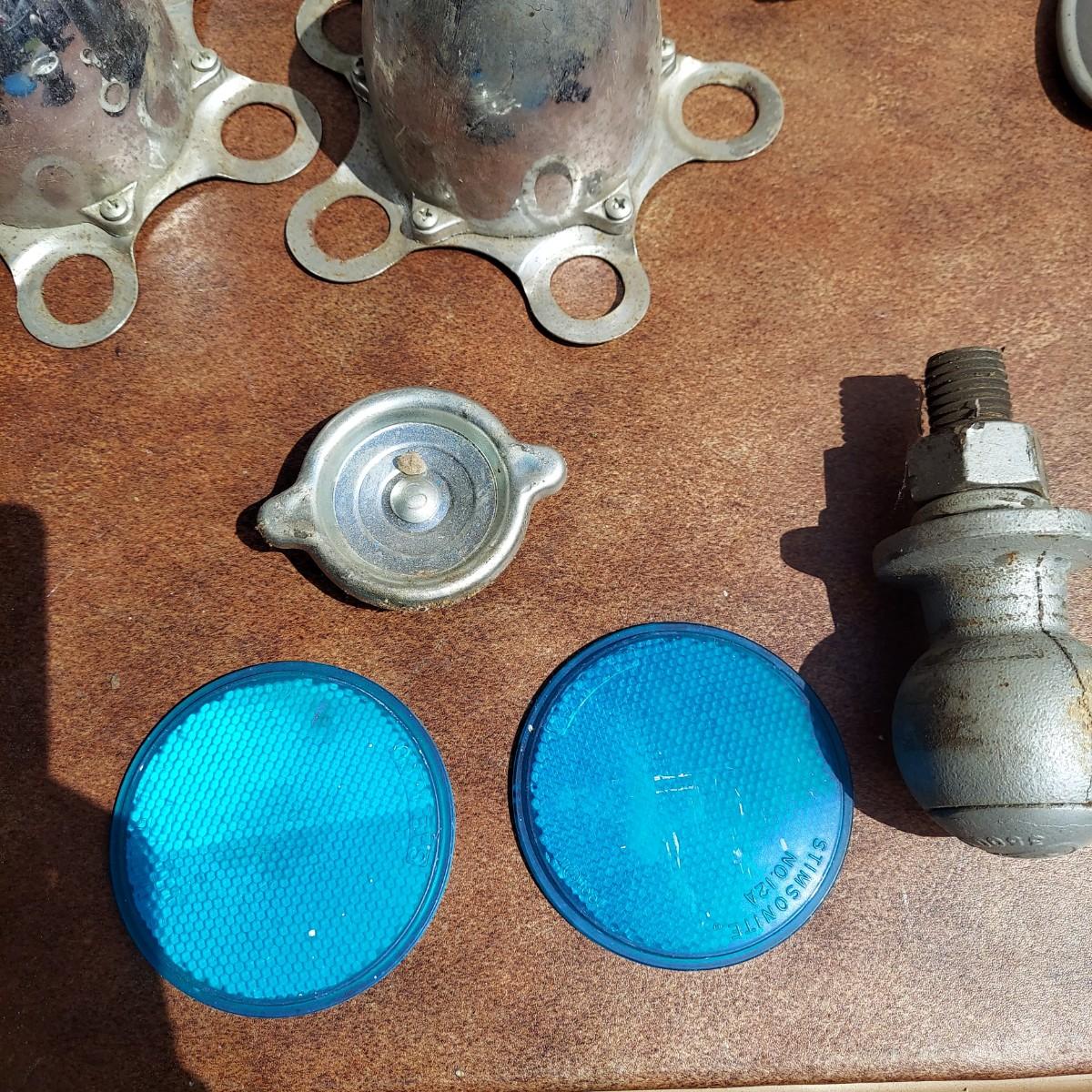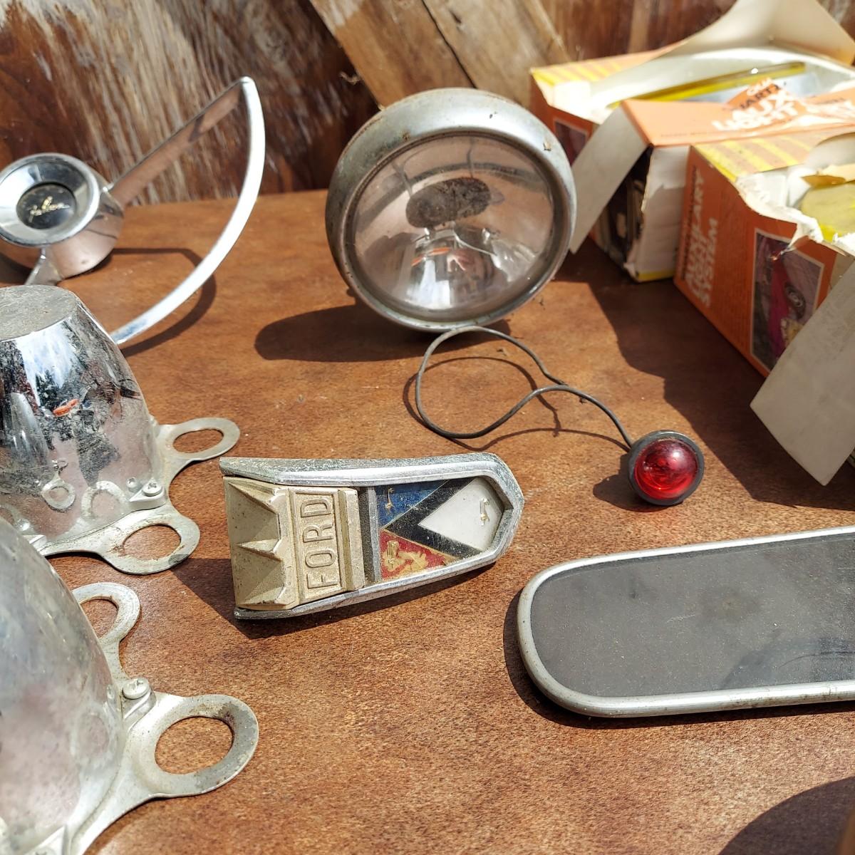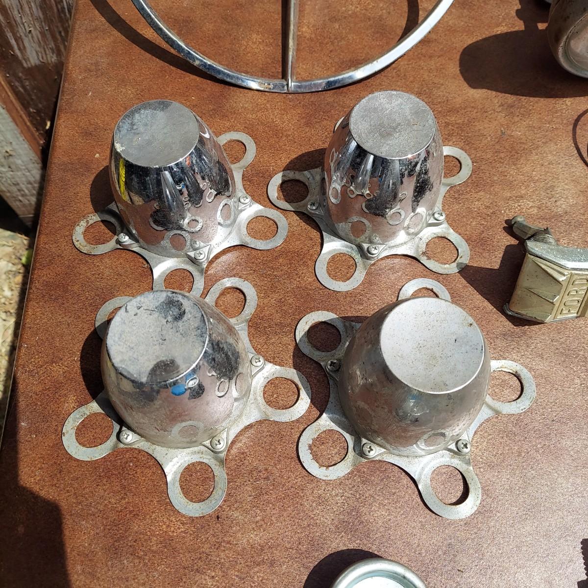 Several different hubcaps from Buick, Chevy and more. Includes car parts like a Ford Falcon steering wheel. Please see photos for details. Local Pickup Only