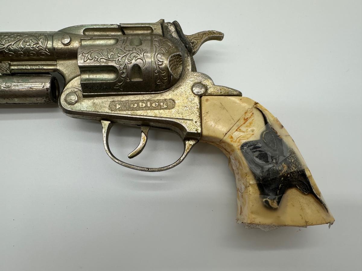 Vintage Hubley cast metal double toy revolver set featuring ornate engraved barrels and frames, faux ivory grips with black steer-head style inlays, and matching leather dual holster rig with cartridge belt. Includes two matching cap guns housed in original-style leather holsters with decorative brass rivets and buckle. Classic Western / cowboy toy display piece. Shows age, wear, patina, and cracking to grips consistent with vintage condition. Great for display, collectors, or Western décor.