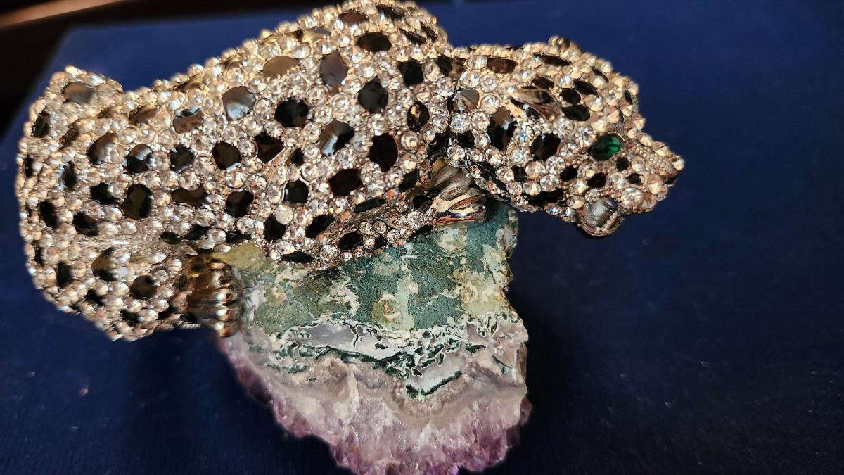 This beauty has black enamel spots and Swarovski rhinestone crystals, with emerald-colored rhinestone eyes.