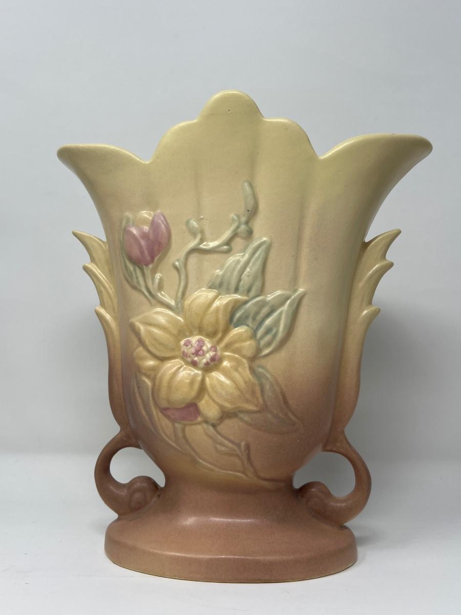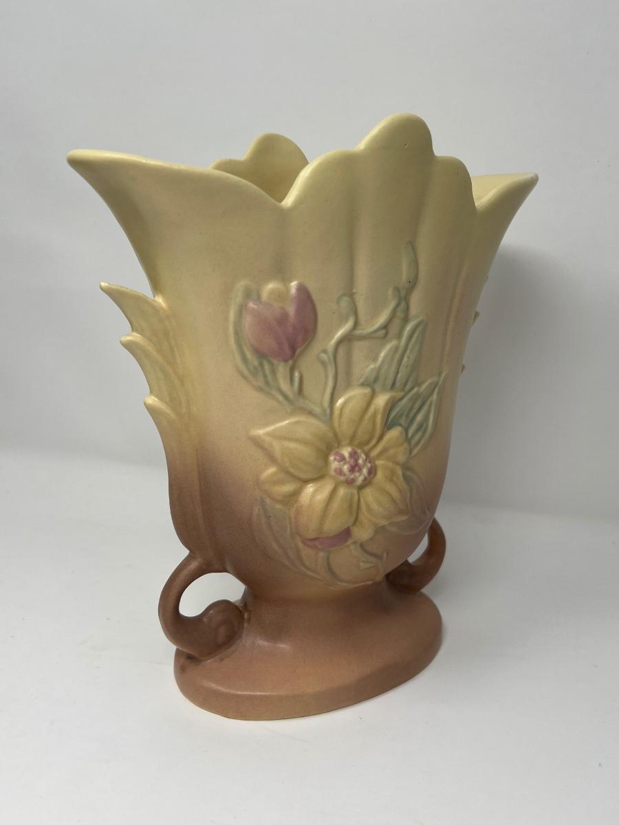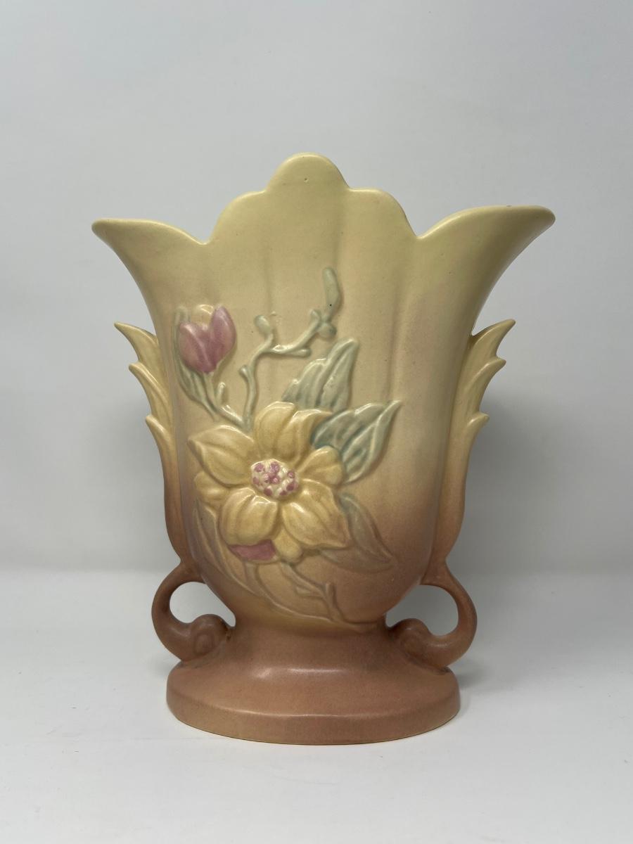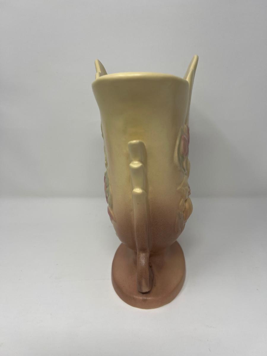 Fine vintage (1930’s) Hull ceramic vase with yellow background and pink floral and green leaves.