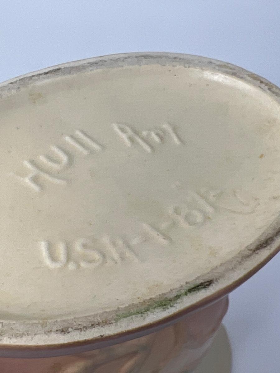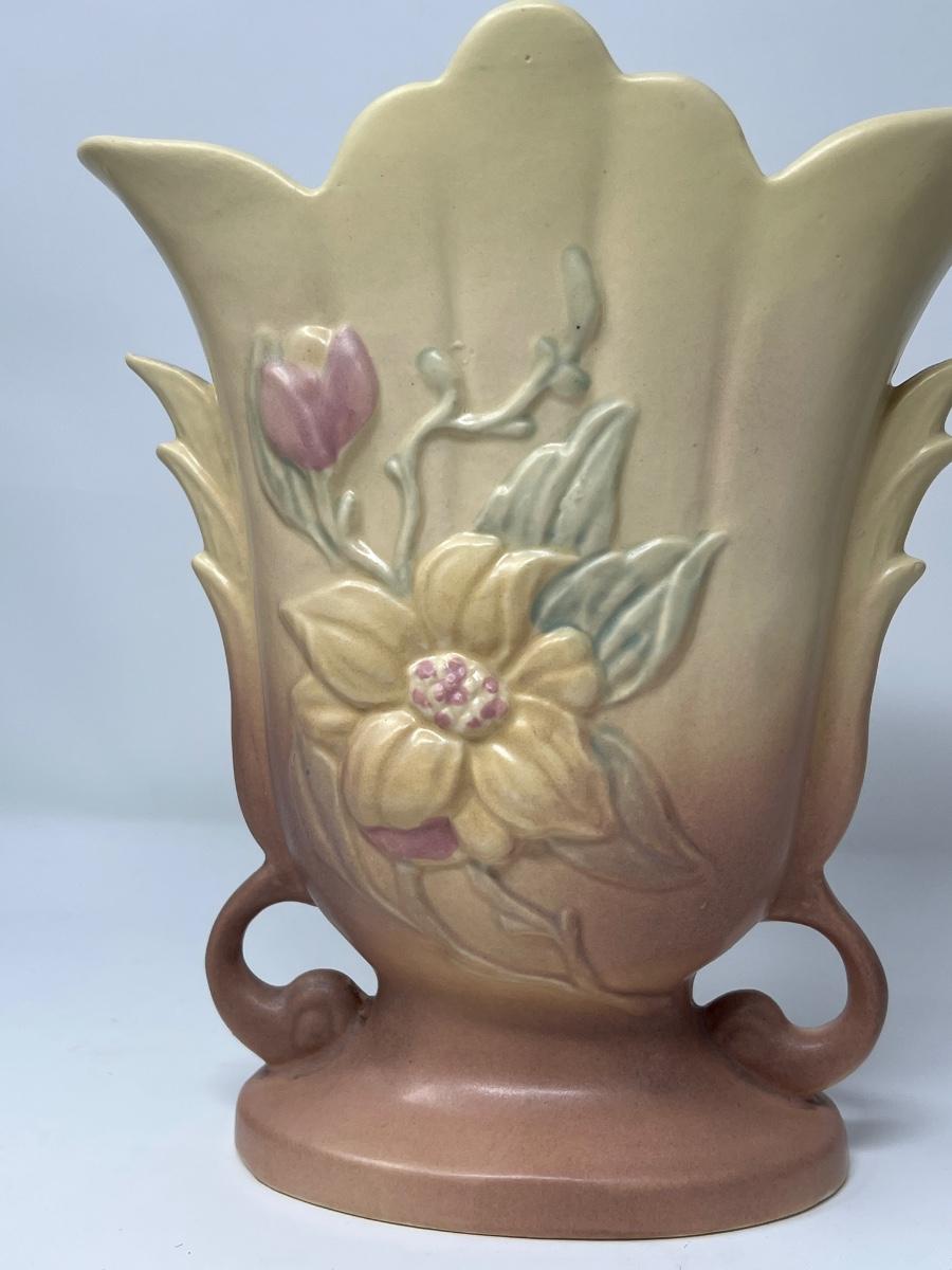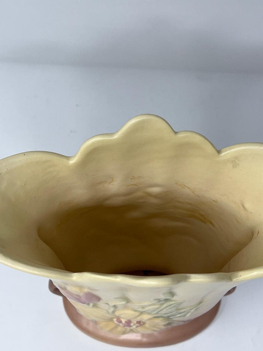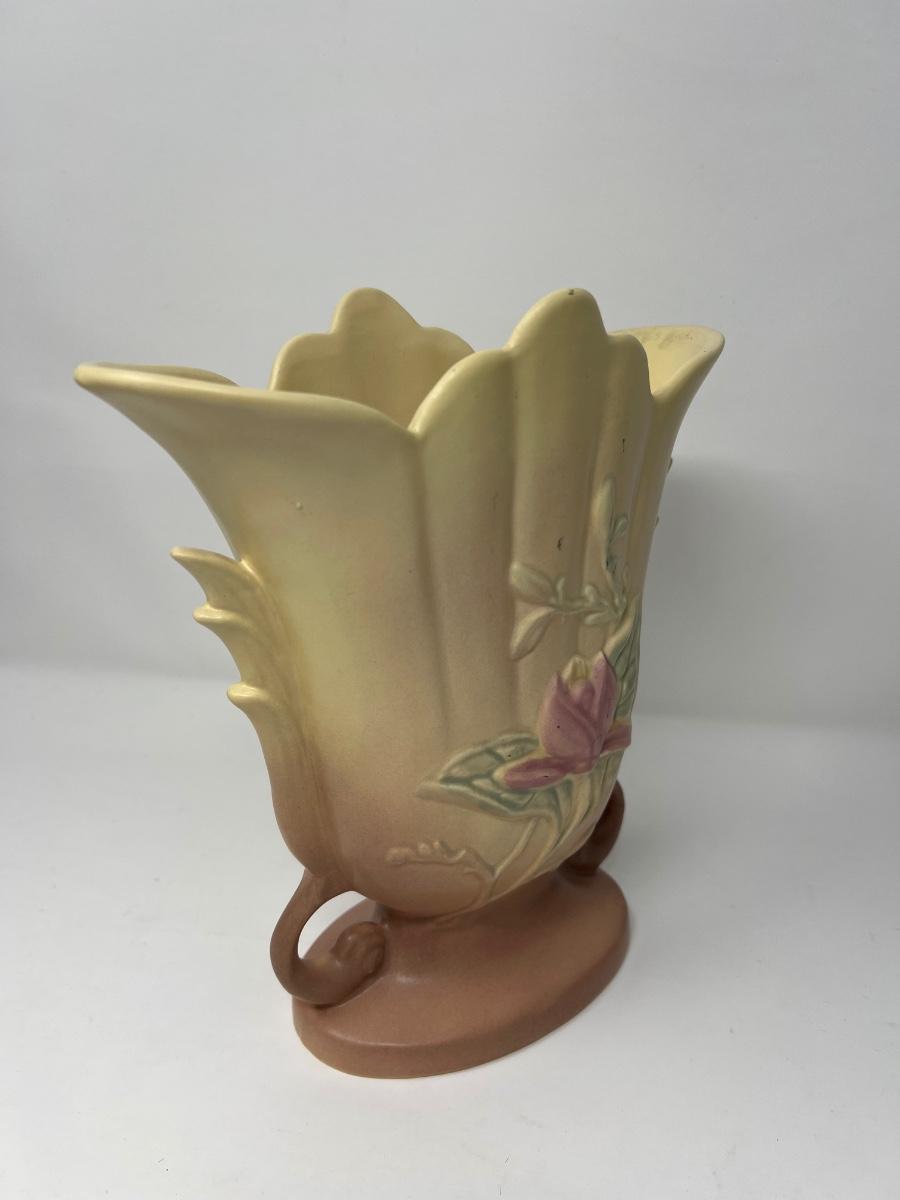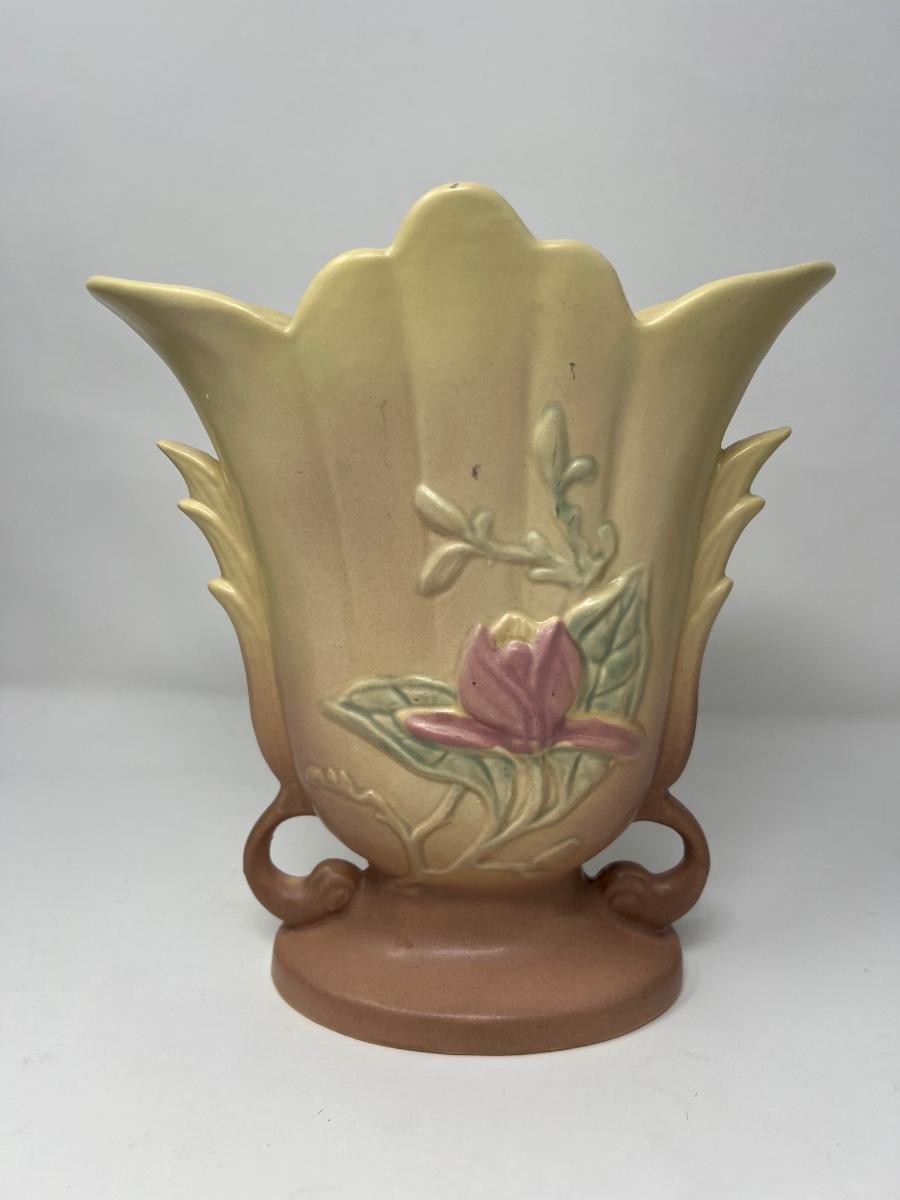 Fine vintage (1930’s) Hull ceramic vase with yellow background and pink floral and green leaves.