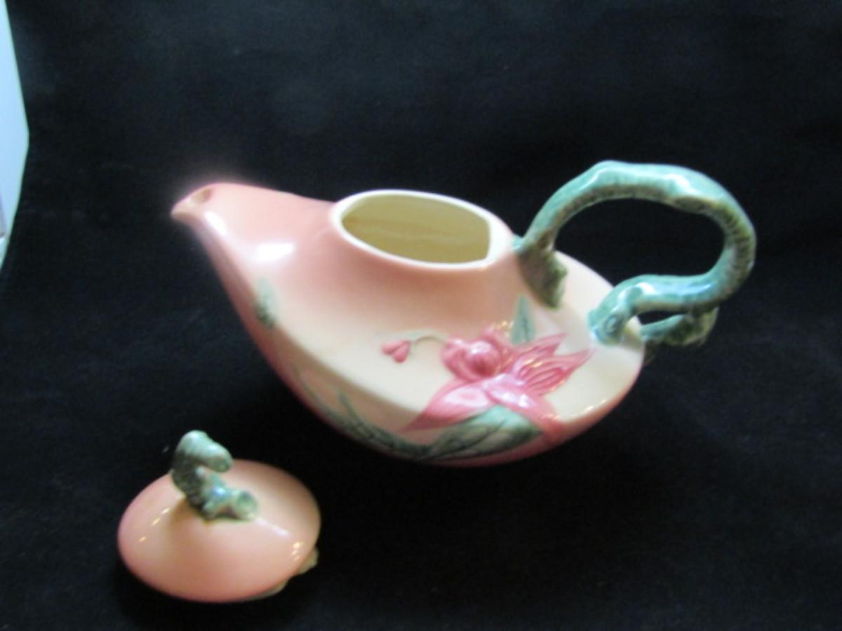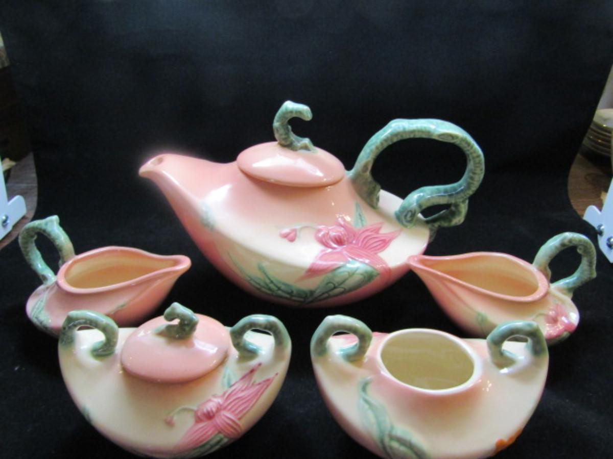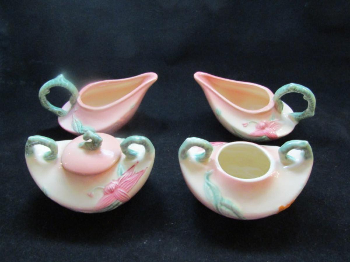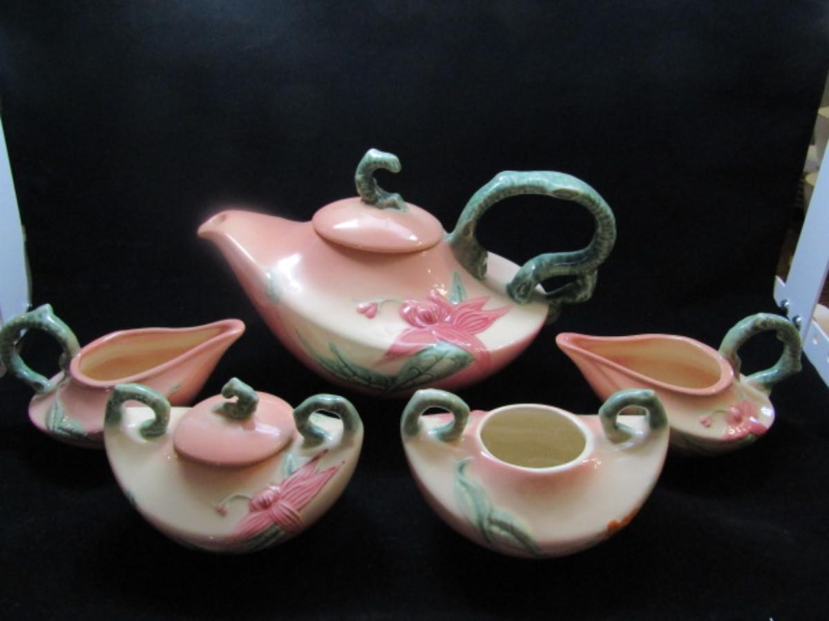 Vintage Hull Tea/Coffee Set (#1). Includes pot, two creamers and two sugar bowls (one has no lid). Please see all pictures- the handle on the lid of the pot has been repaired.