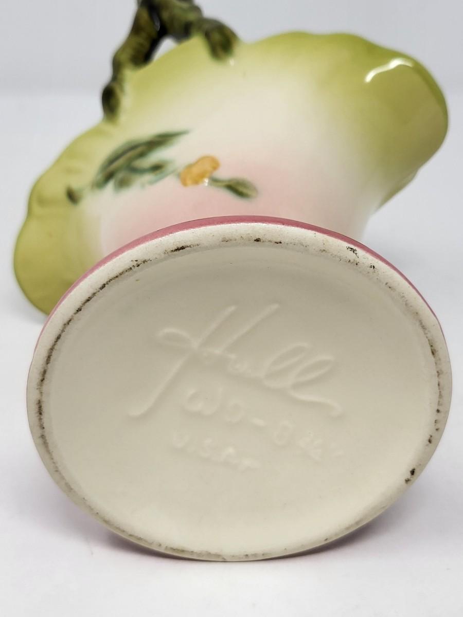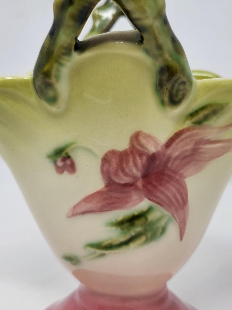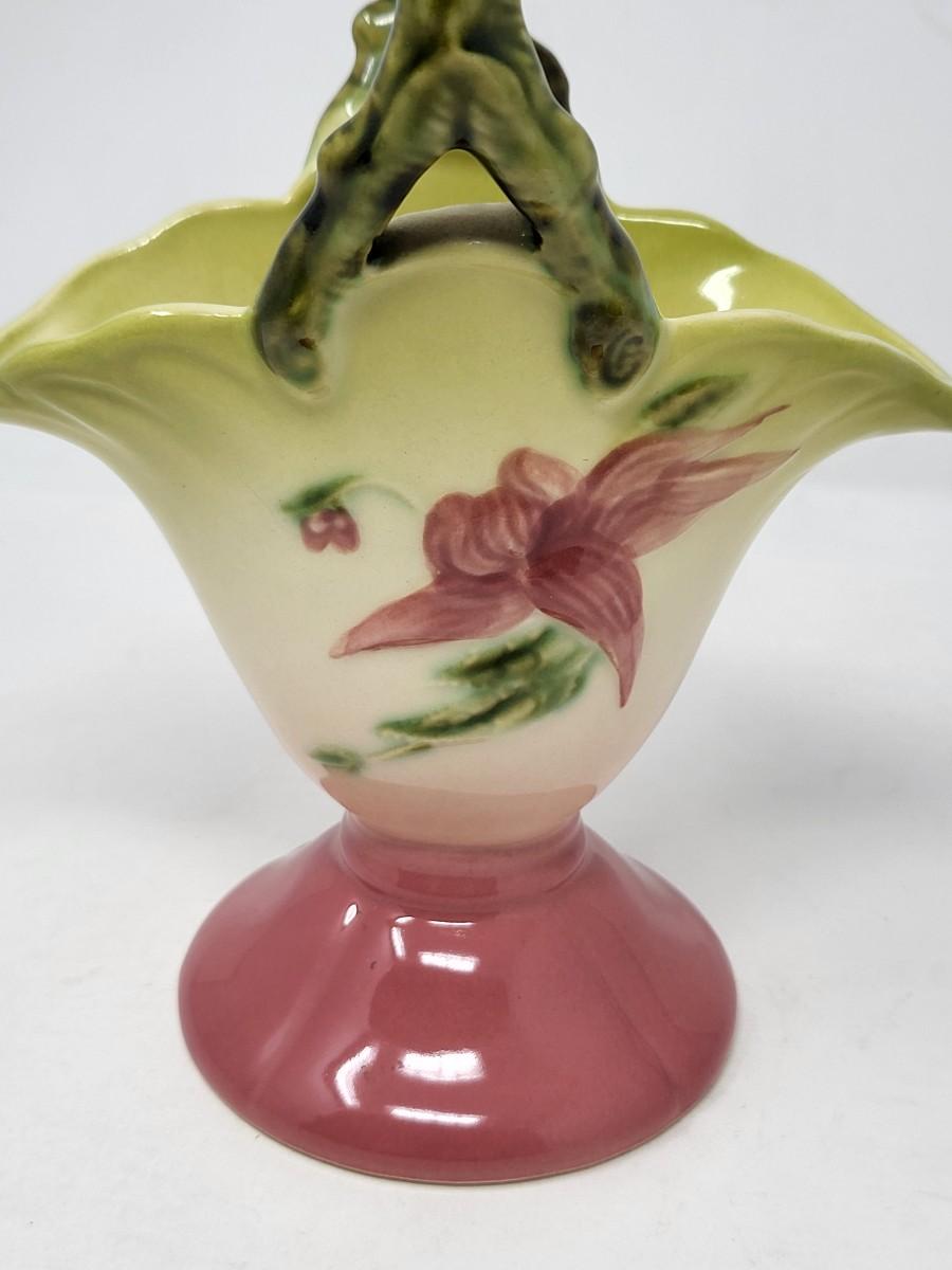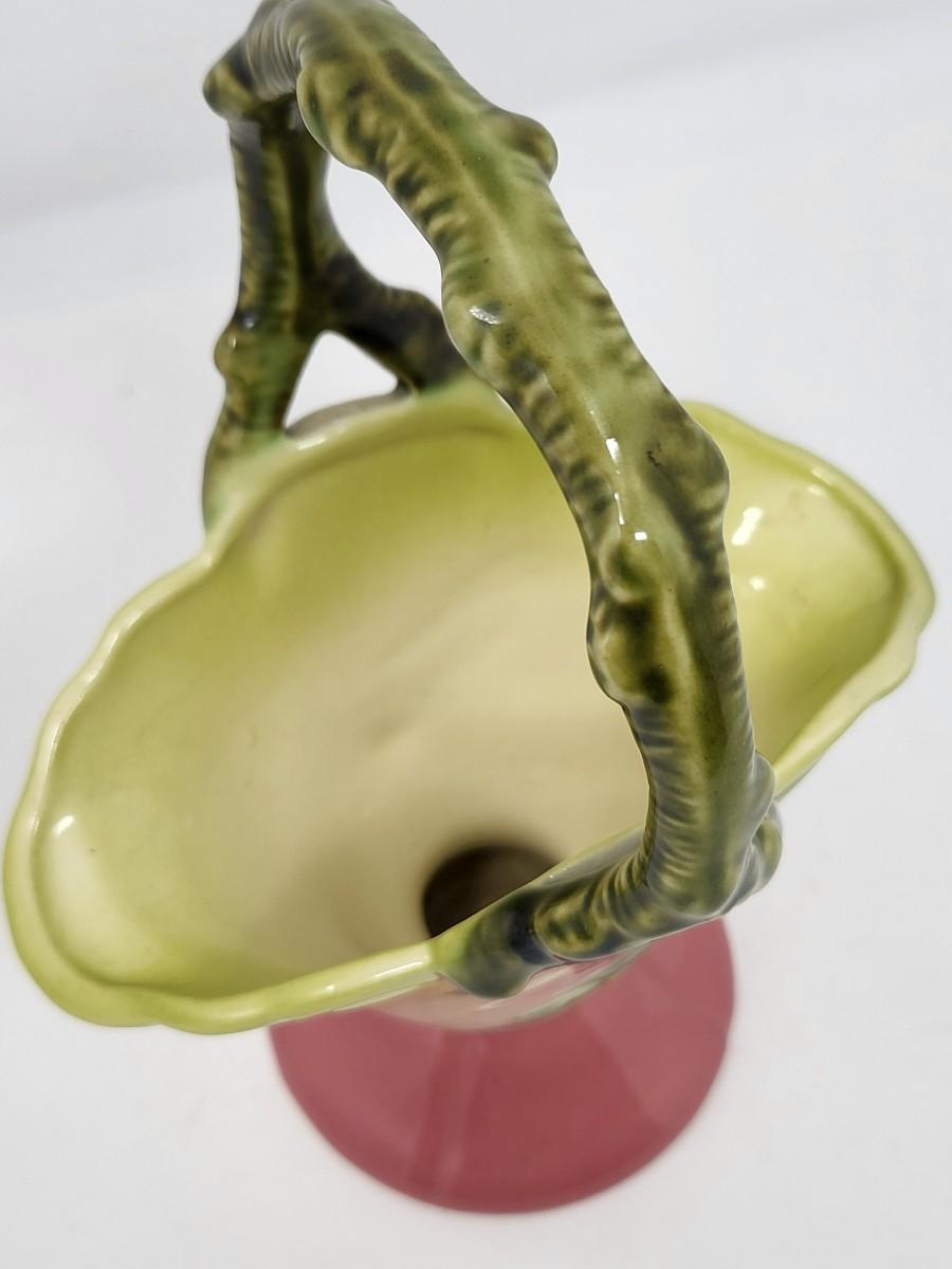 Vintage hand painted Hull USA pottery basket vase. Glazed green vine handle, pink flower and base.. Measures 9" tall x 6" long x 4". deep. Good condition. No chips, breaks or cracks.