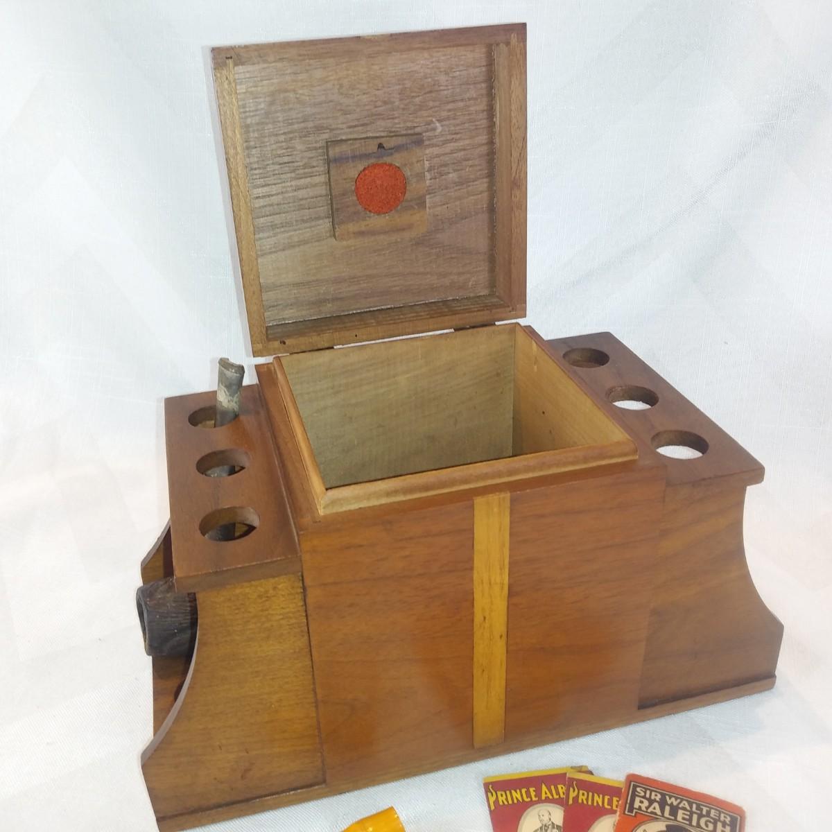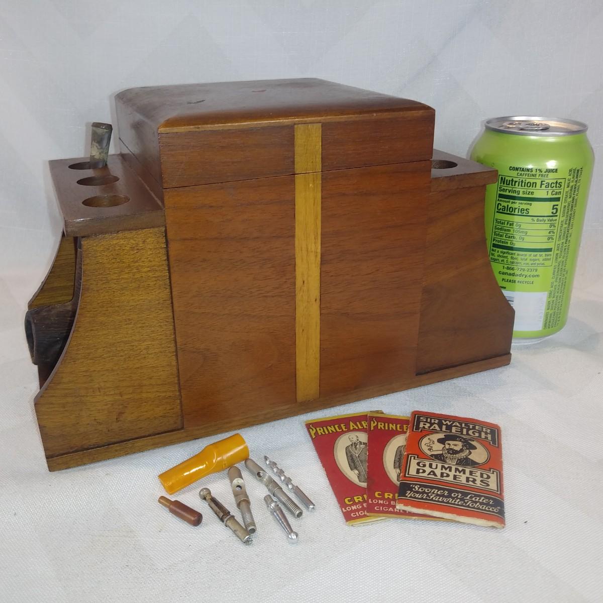 This auction lot is for a Vintage Humidor & Pipe Display. This item is a nice walnut with satin wood accent Humidor that could also hold 6 pipes. It also comes with some Tobacco papers and pipe accessories. It has a few scratches consistent with age and use but overall very nice.