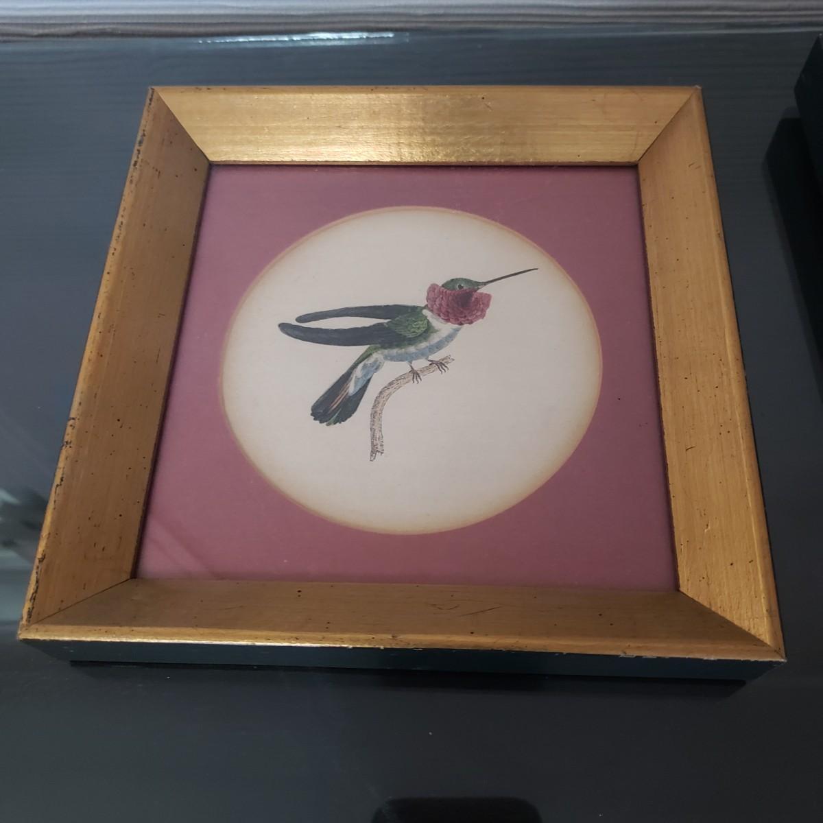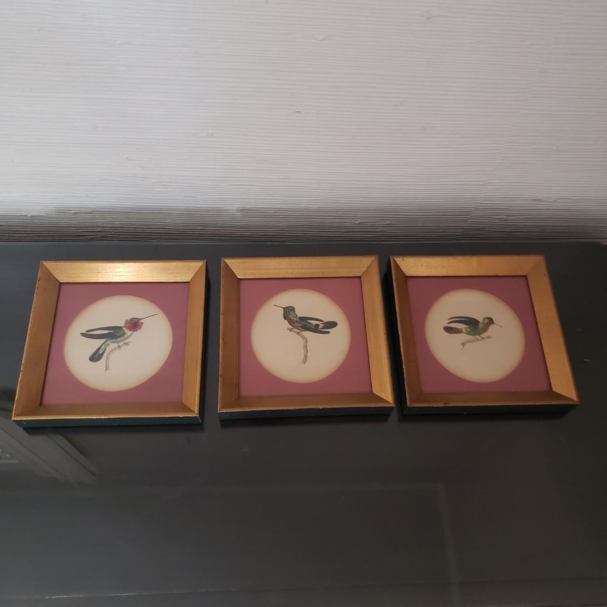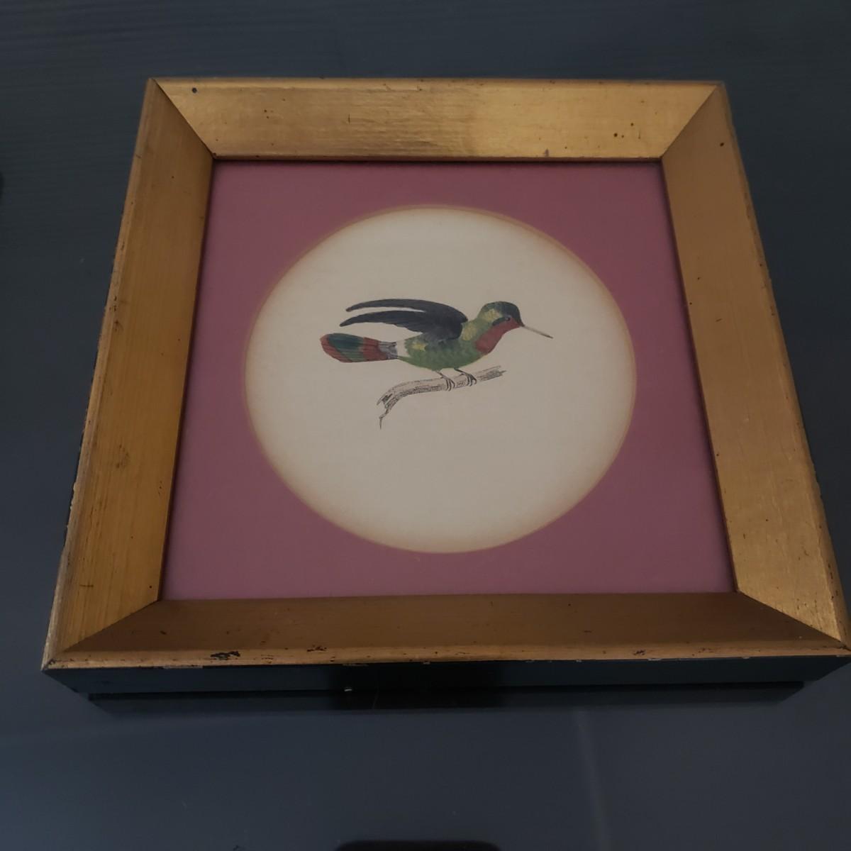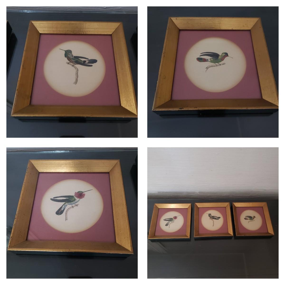 This lot features three possible hand painted prints of various hummingbirds by what appears to be naturalist William Jardine. The prints are in an oval mat in a wooden gold colored frame. Each picture is behind glass. The frames are painted black on the outside. Each frame measures 7" x 7"H.