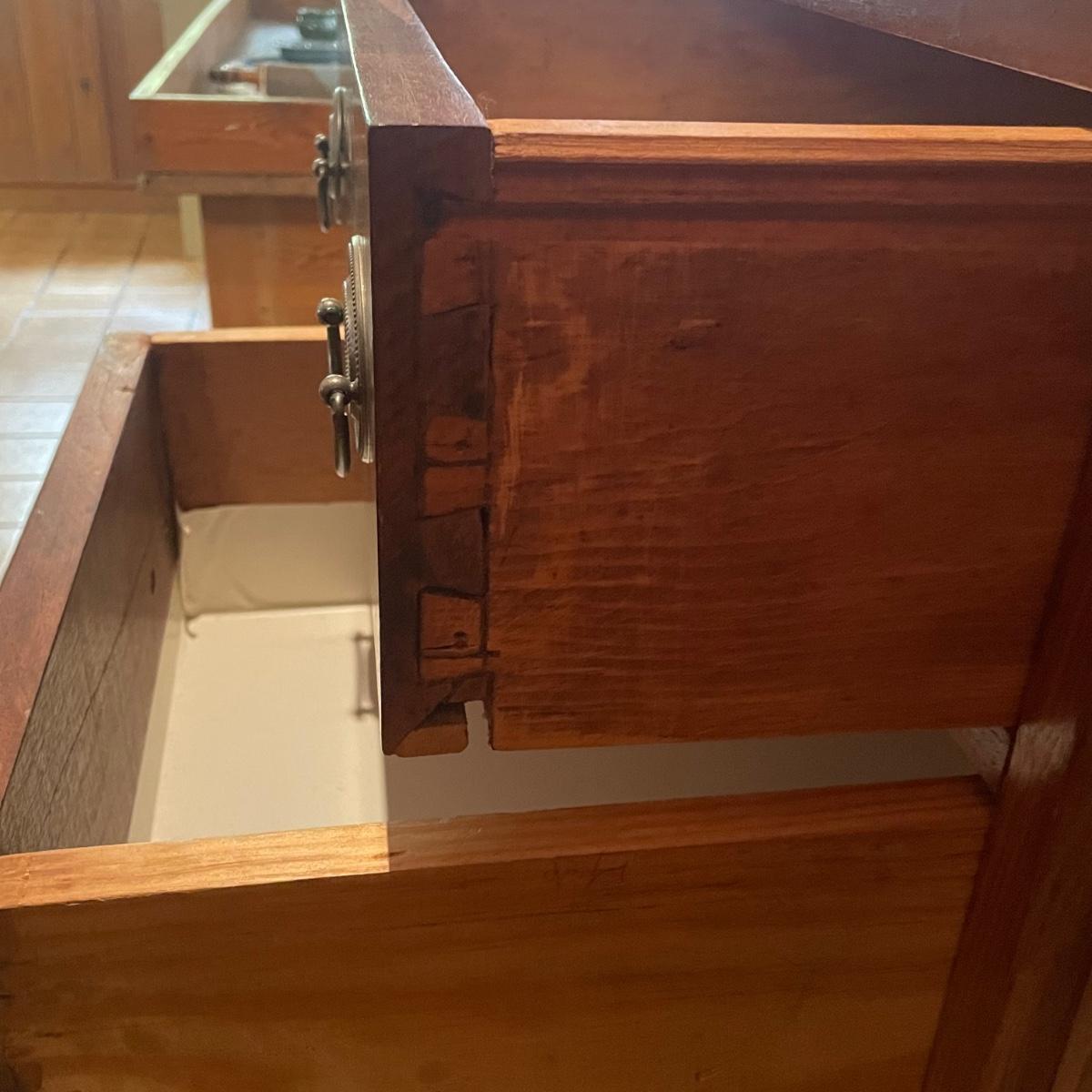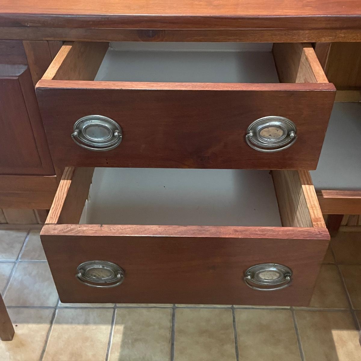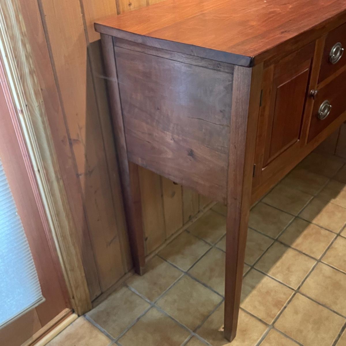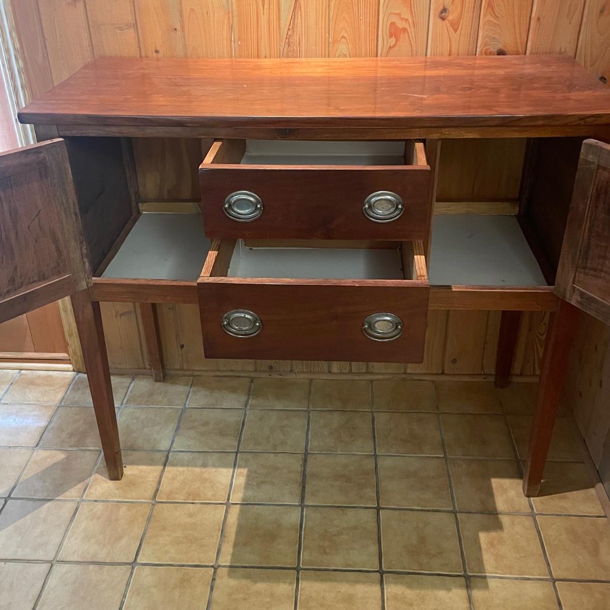 This handsome huntboard is solid wood with metal hardware. Offering plenty of storage, it has 2 dovetailed drawers in the center flanked by cabinets either side. It currently has white shelf liners in place. A few minor marks are shown in images.