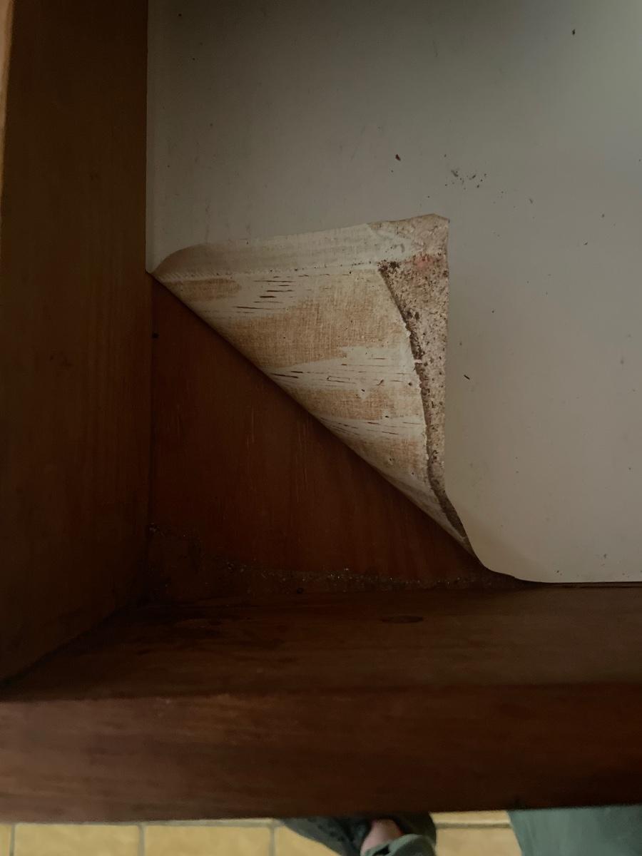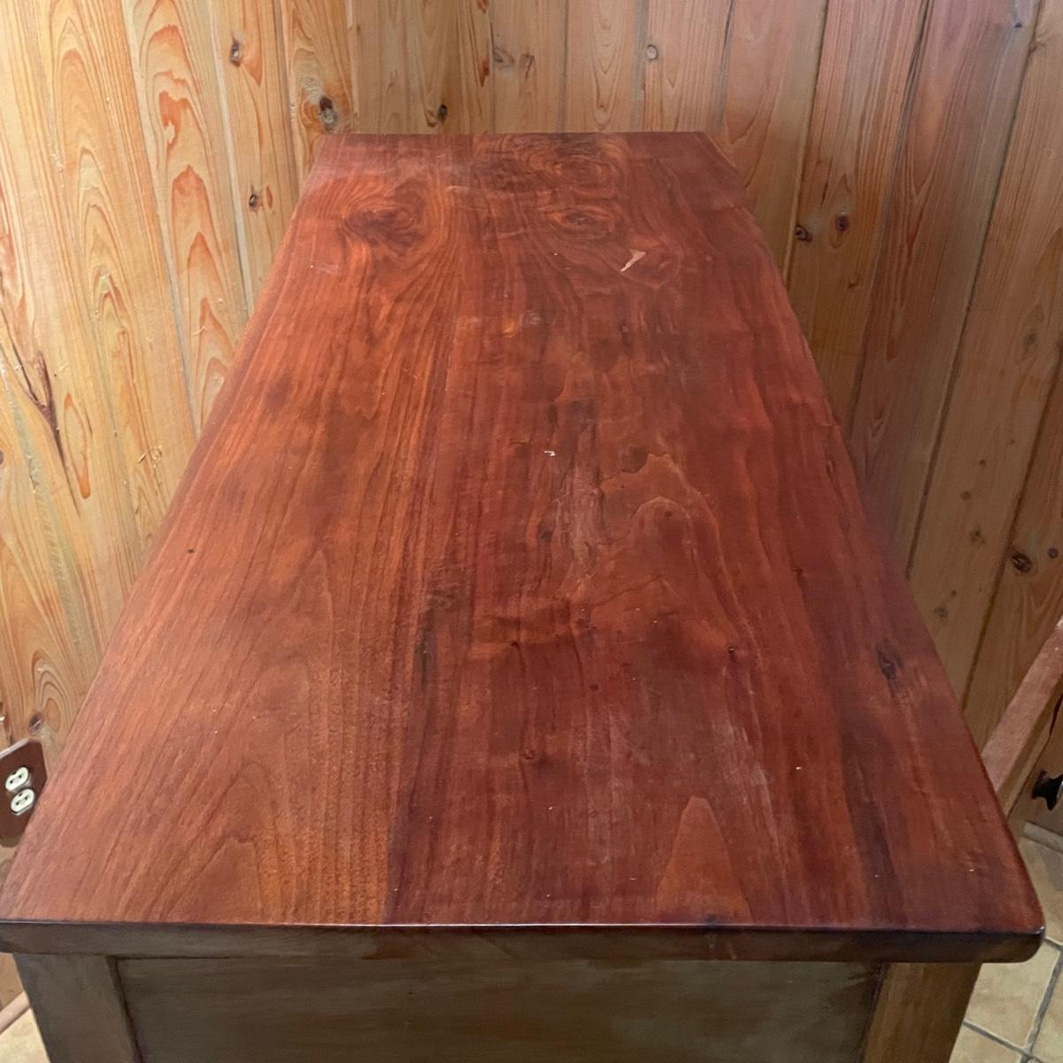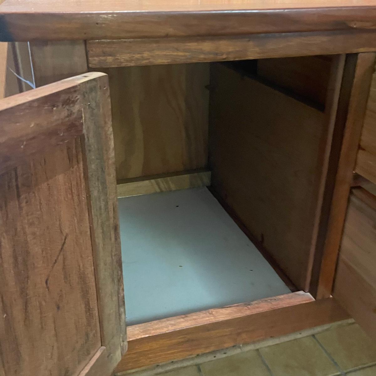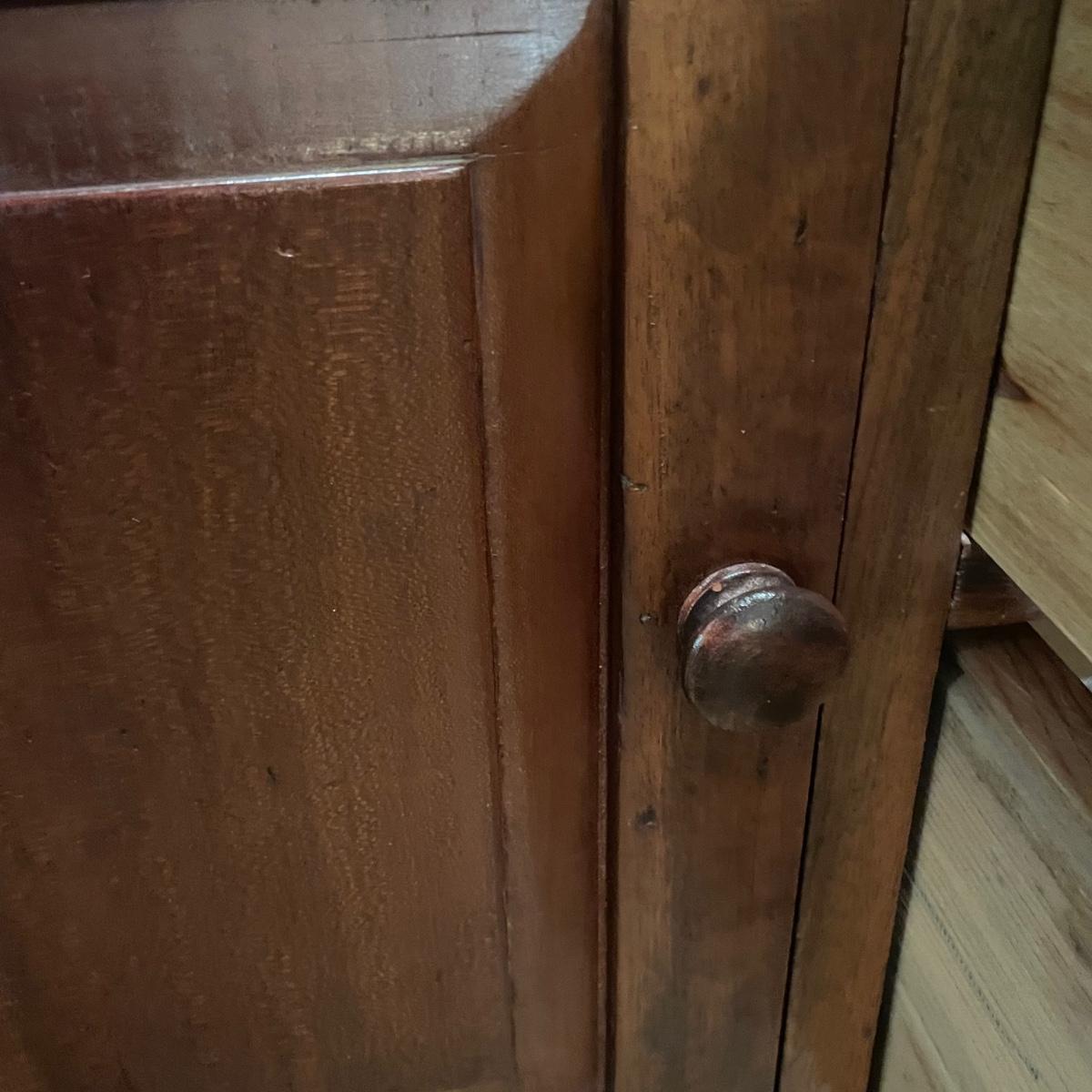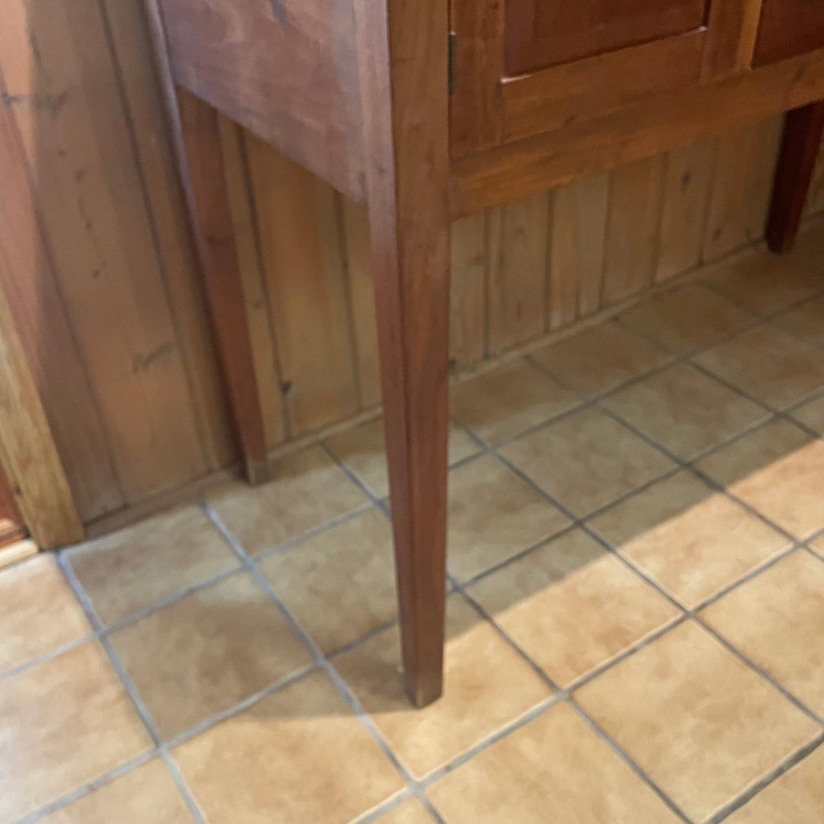 This handsome huntboard is solid wood with metal hardware. Offering plenty of storage, it has 2 dovetailed drawers in the center flanked by cabinets either side. It currently has white shelf liners in place. A few minor marks are shown in images.