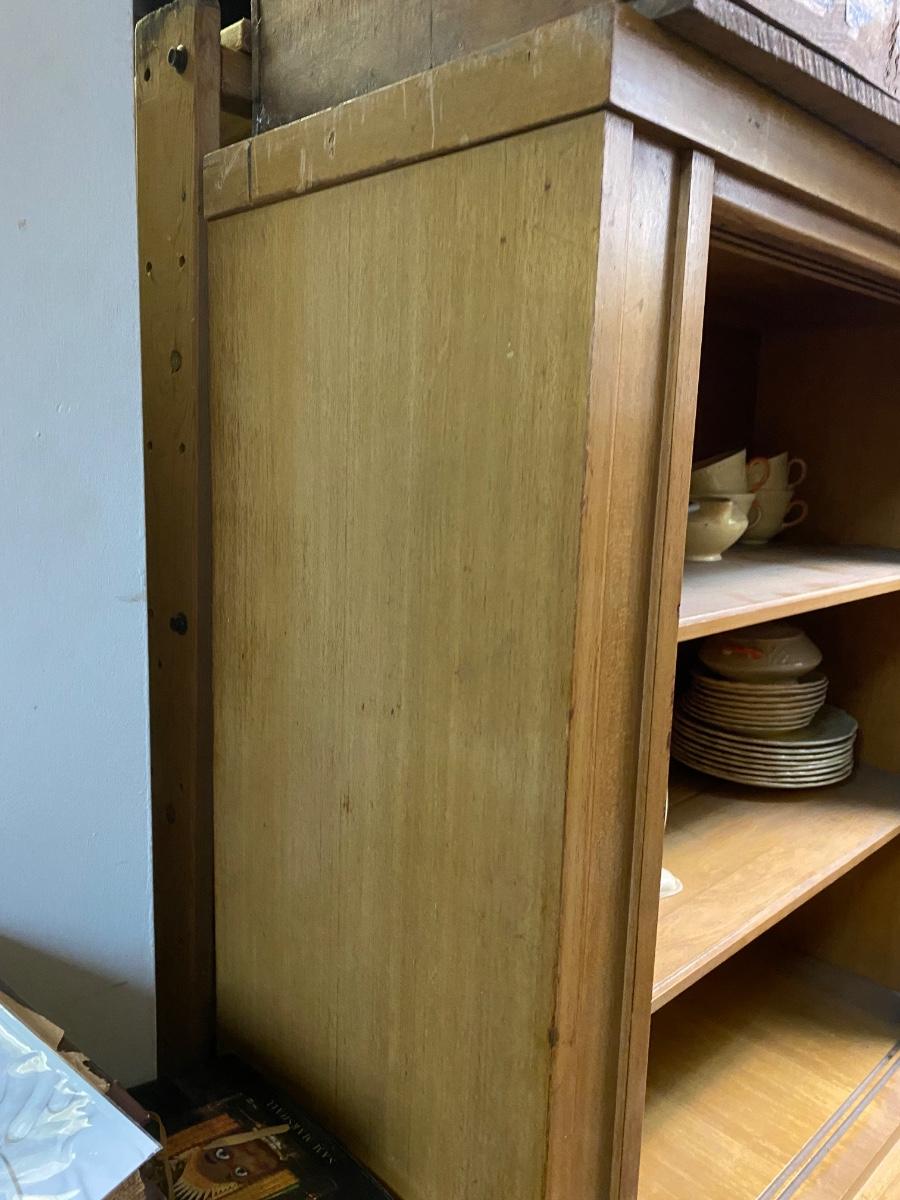 Vintage hutch with drawer and lower cabinet. No doors or glass on upper part, but that just makes it easier to reach things. Measures 65" hish, 32"Wx15D.