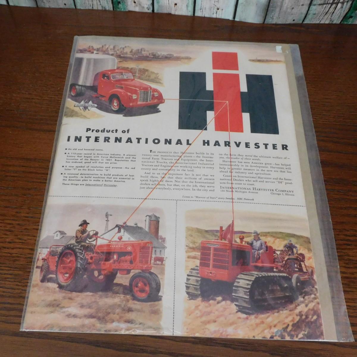 This is an International Harvester magazine ad from 1946. There is pin holes at the top that someone used for hanging. It is about 14 1/4" x 10 3/4".