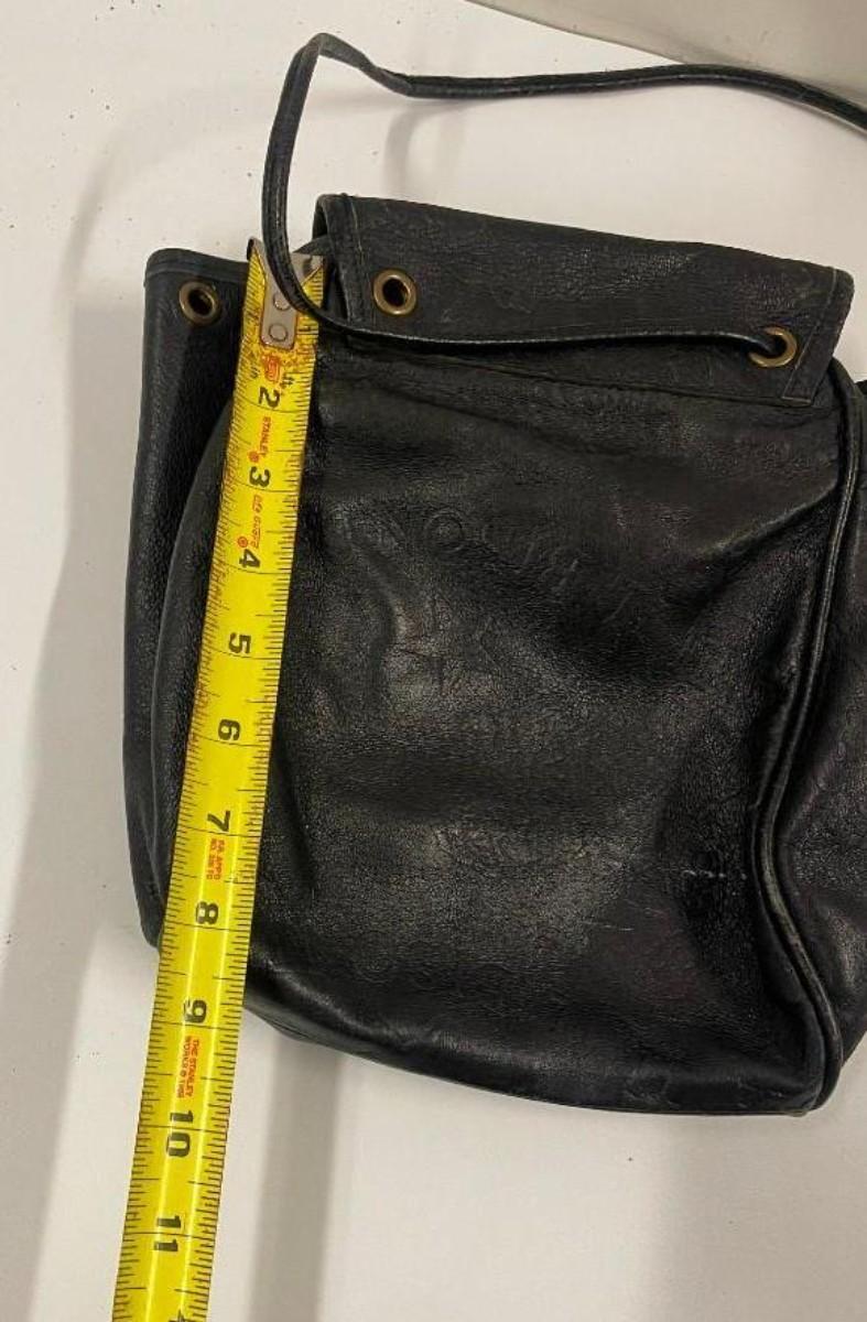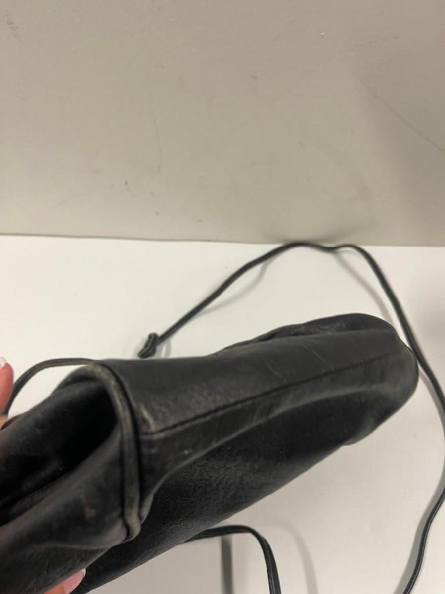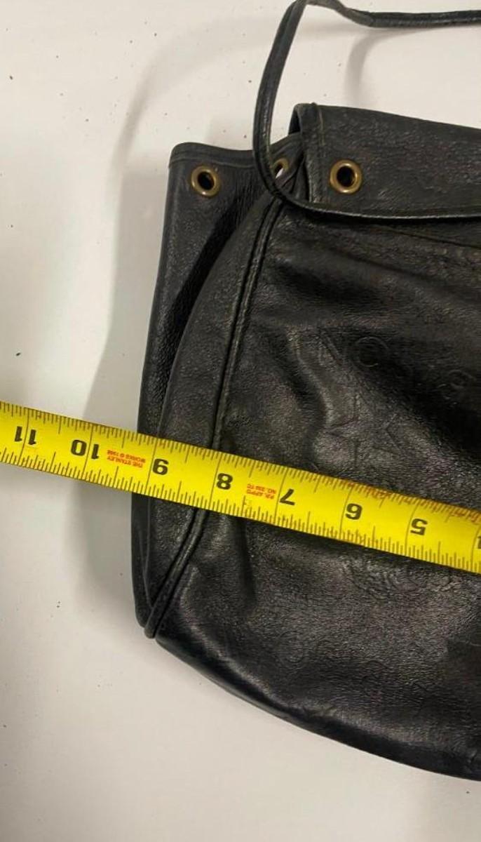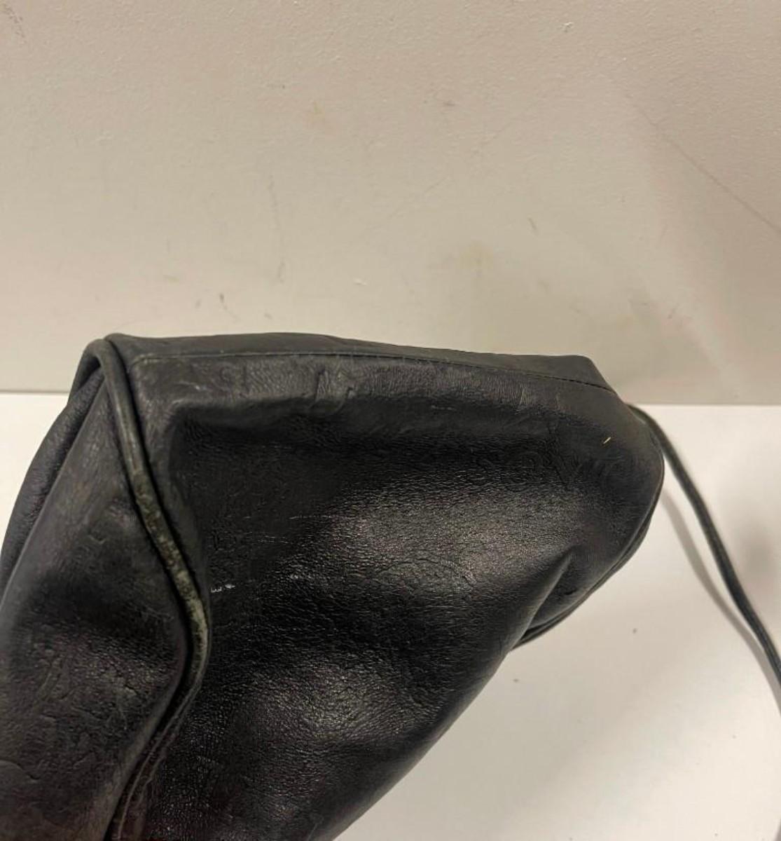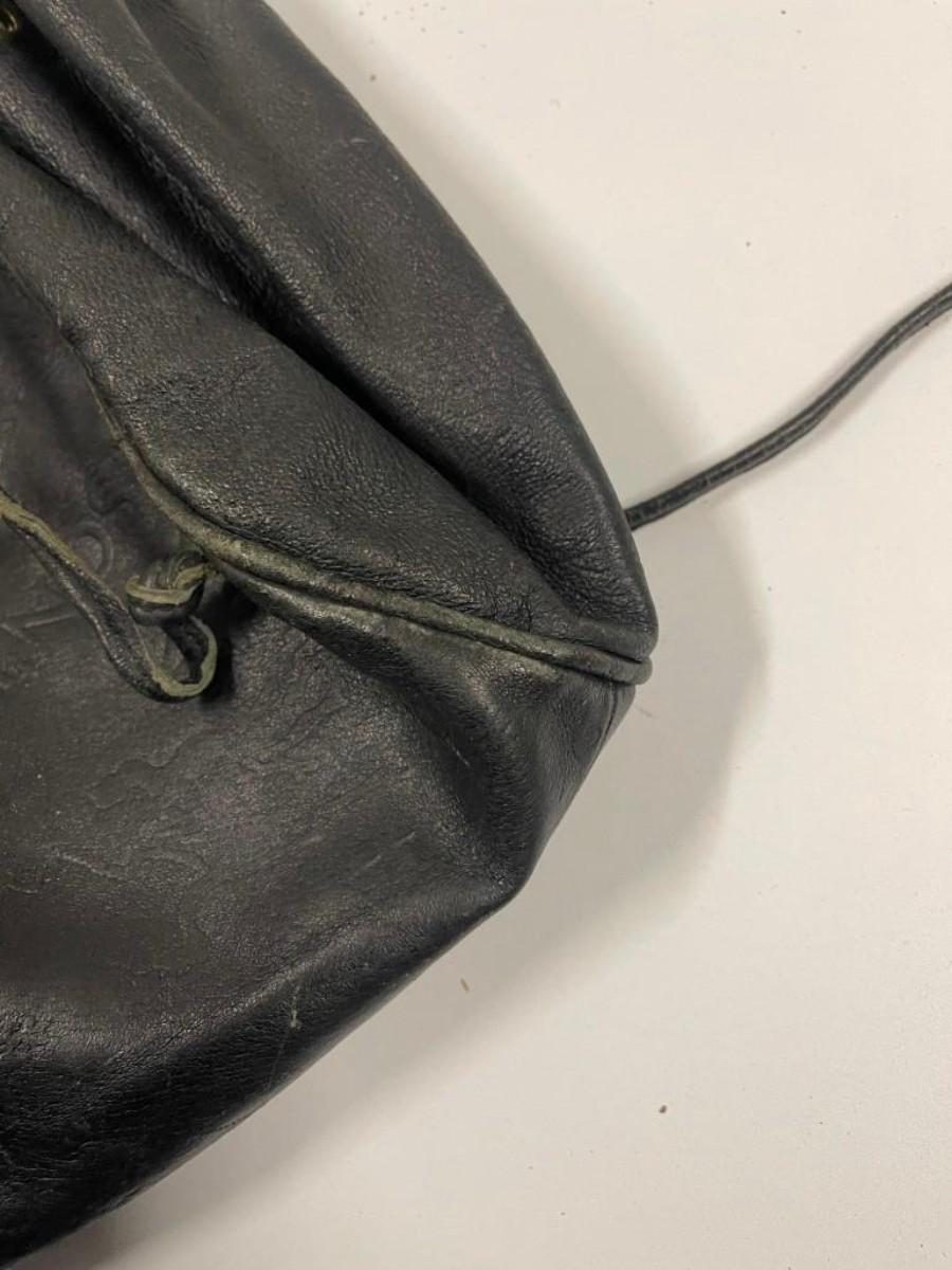 Vintage Il Bisonte black leather drawstring handbag. Shows significant wear. 8" x 9"